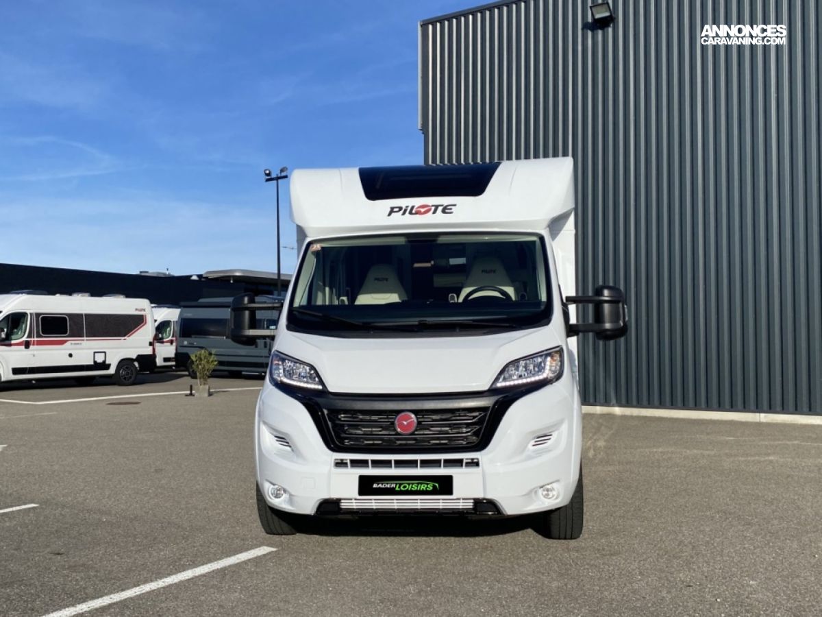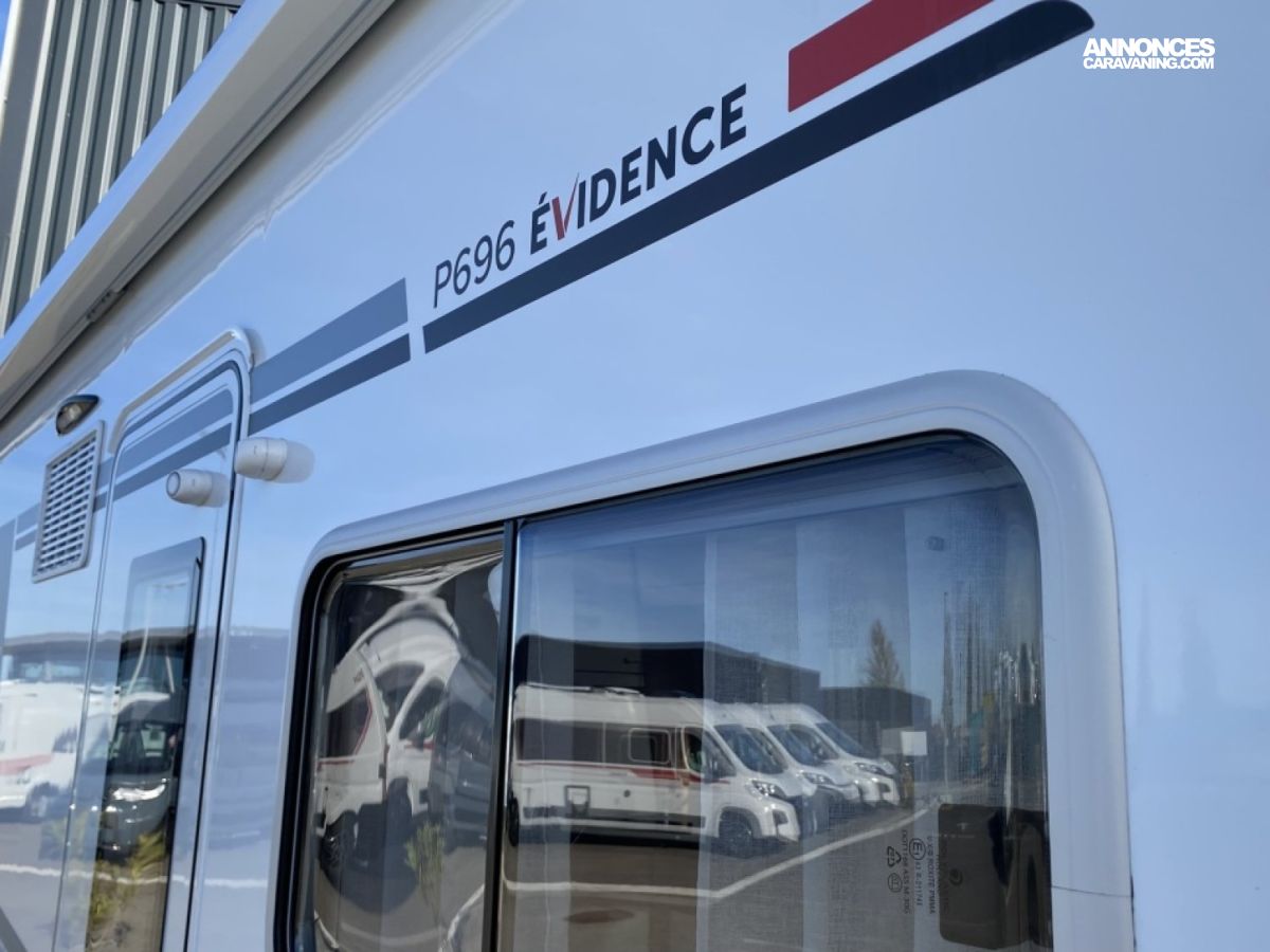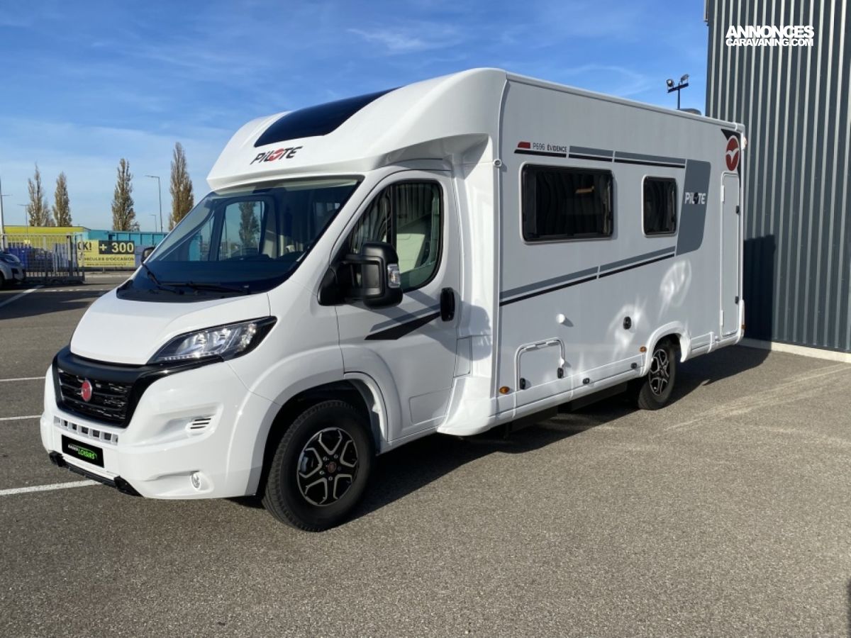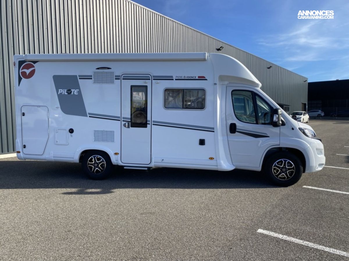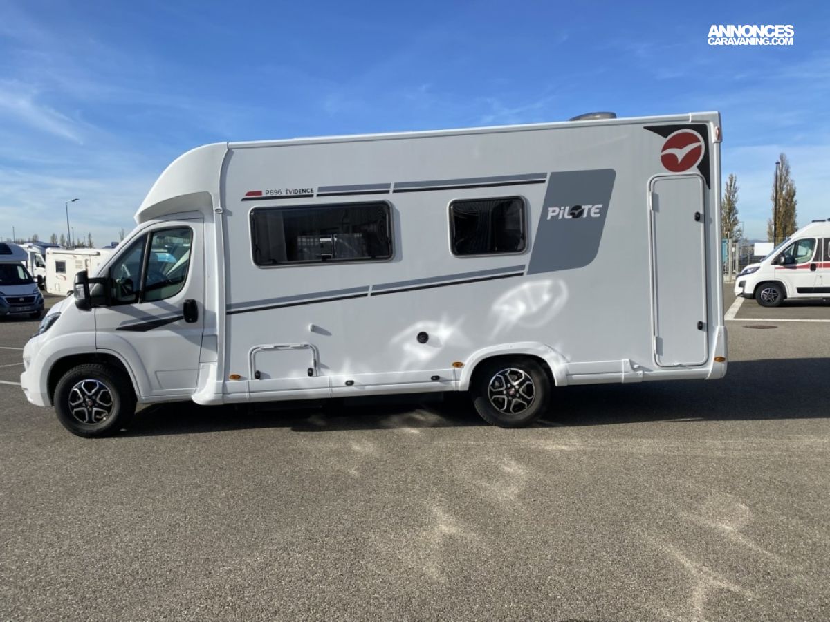 Le Pilote Profilé P696D Evidence Plus est un camping-car de 6,99 m, offrant une motorisation de 2,2L et une boîte automatique. Il dispose de 4 couchages et de nombreux équipements : chauffage Truma, réfrigérateur de 153L, store banne, jantes alliage, panneaux solaires, et climatisation cabine. Il est aussi équipé d'un lit pavillon électrique, d'une caméra de recul, et de systèmes de sécurité comme les airbags. Des options sont disponibles, comme un couchage supplémentaire et la boîte automatique.