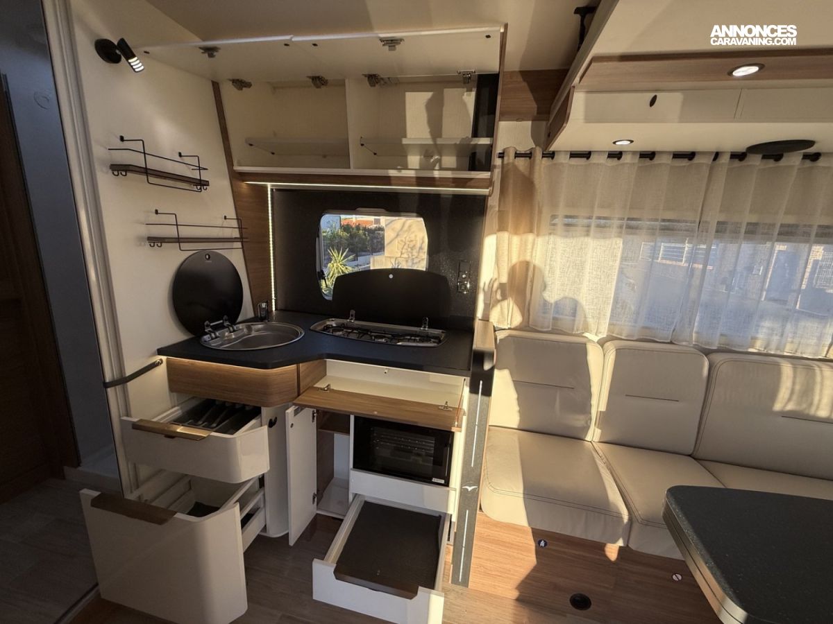 L’intérieur met en valeur la finition ÉVIDENCE, connue pour son excellent niveau d’équipement. L’implantation privilégie un maxi salon pouvant accueillir jusqu’à 6 convives, créant un véritable espace de convivialité rare dans cette catégorie.