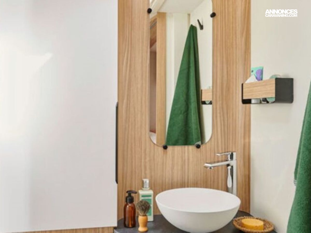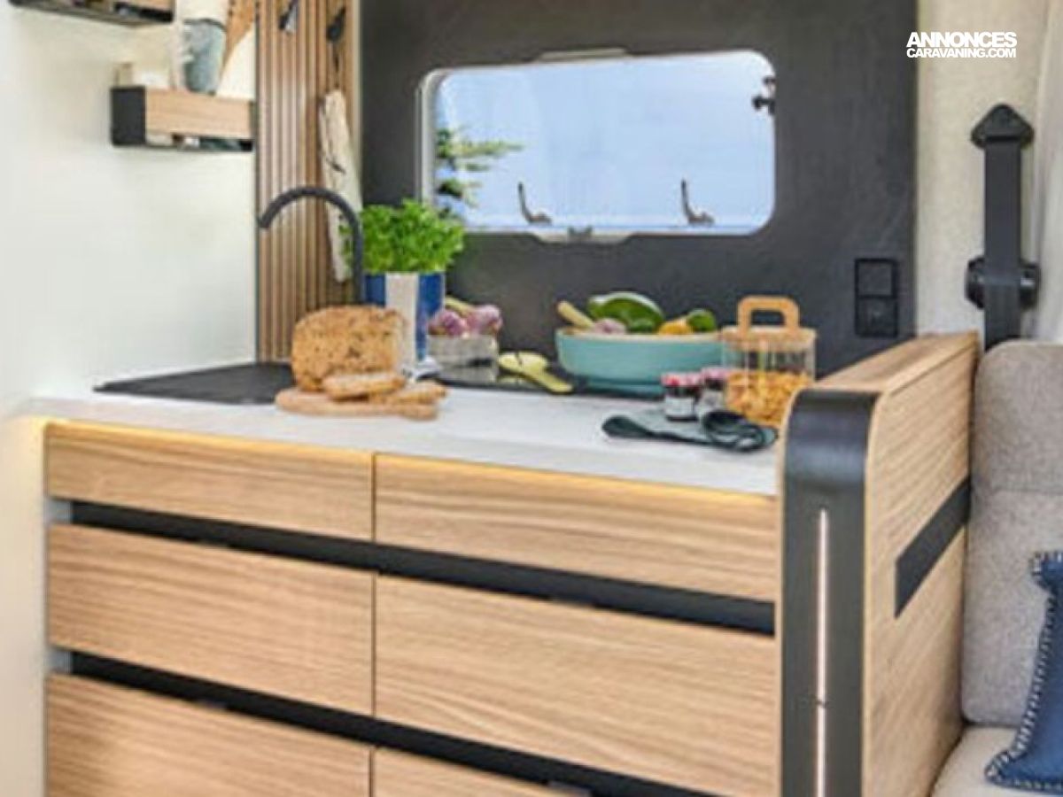 selon modèle. NOUVEAU • Store banne. • Tiroir bas de caisse. • Douchette eau froide/chaude dans la soute arrière. • Lit pavillon électrique avec sommier à lattes. • Sellerie bi-ton et bi-matière simili et tissu «Sand». NOUVEAU • Ambiance Pyla.