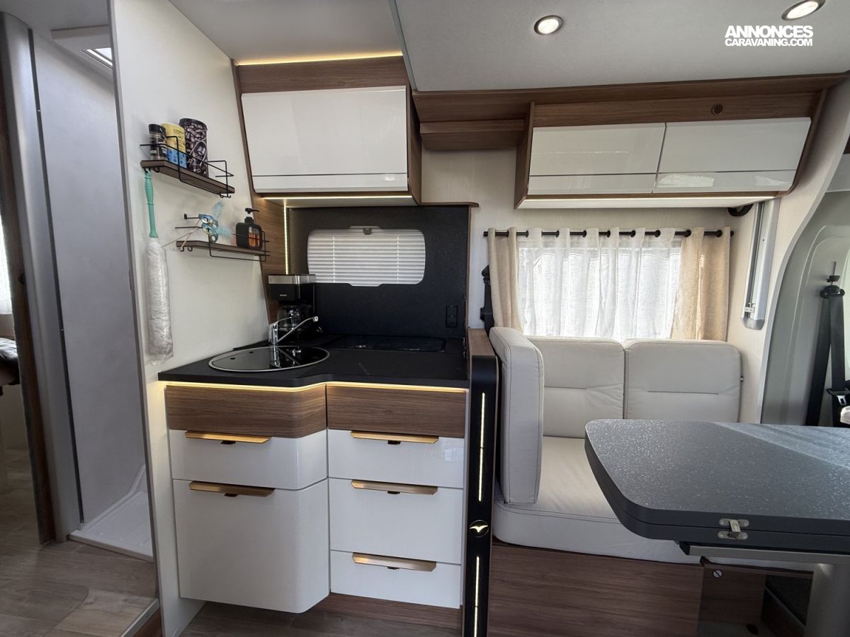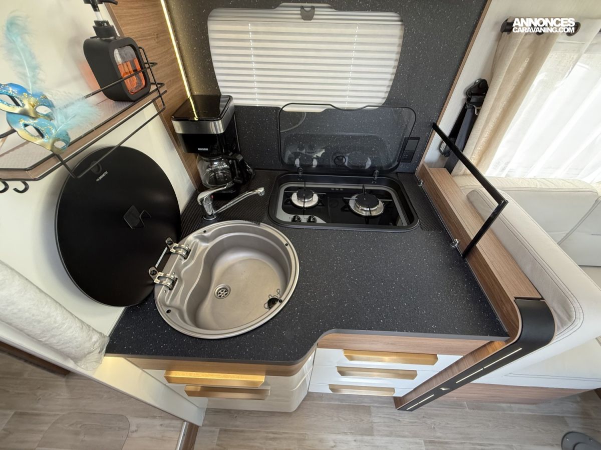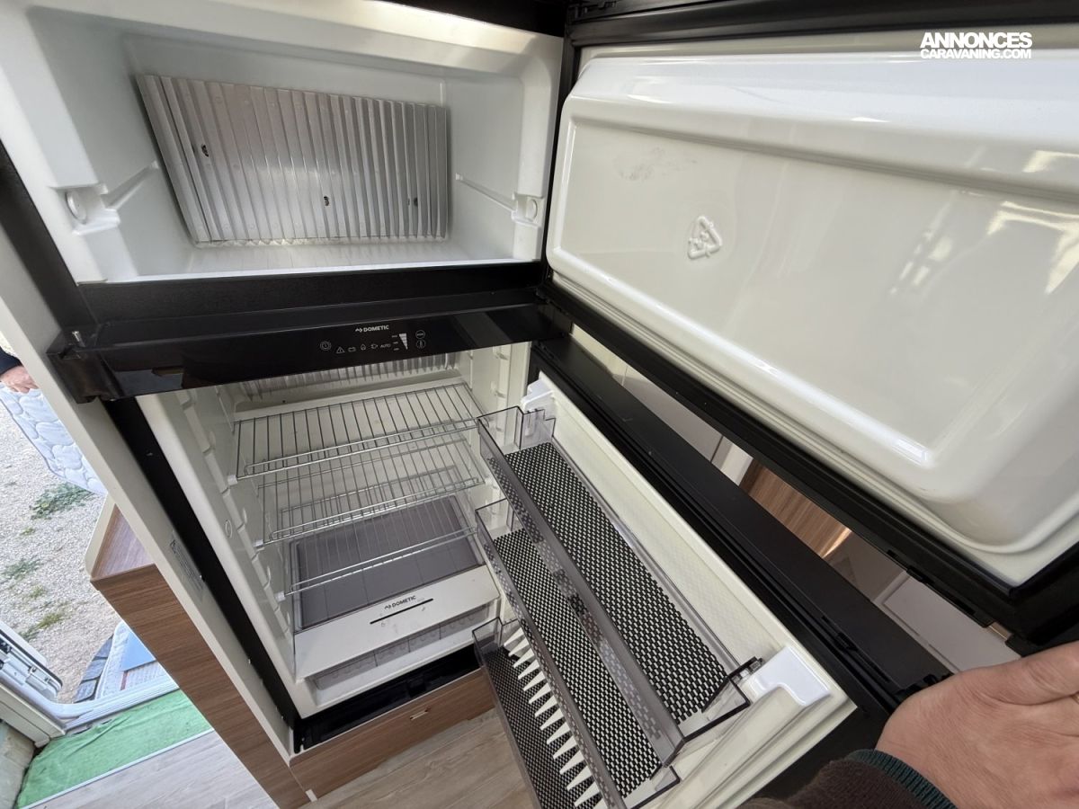 À l’intérieur, l’ambiance est lumineuse et chaleureuse. Le salon face-face accueille confortablement jusqu’à cinq personnes dans un véritable esprit « pièce de vie », sublimé par de larges baies vitrées et un grand lanterneau panoramique. La cuisine fonctionnelle dispose d’un grand plan de travail, de tiroirs à fermeture amortie, d’un casserolier et d’un réfrigérateur de 150 L à gestion automatique, permettant de cuisiner au quotidien avec un vrai confort.
