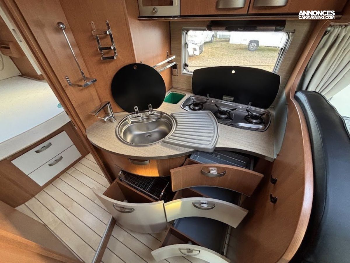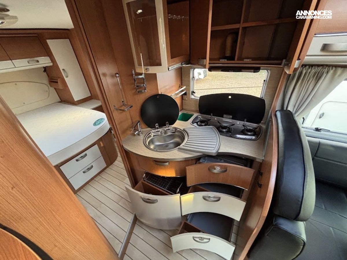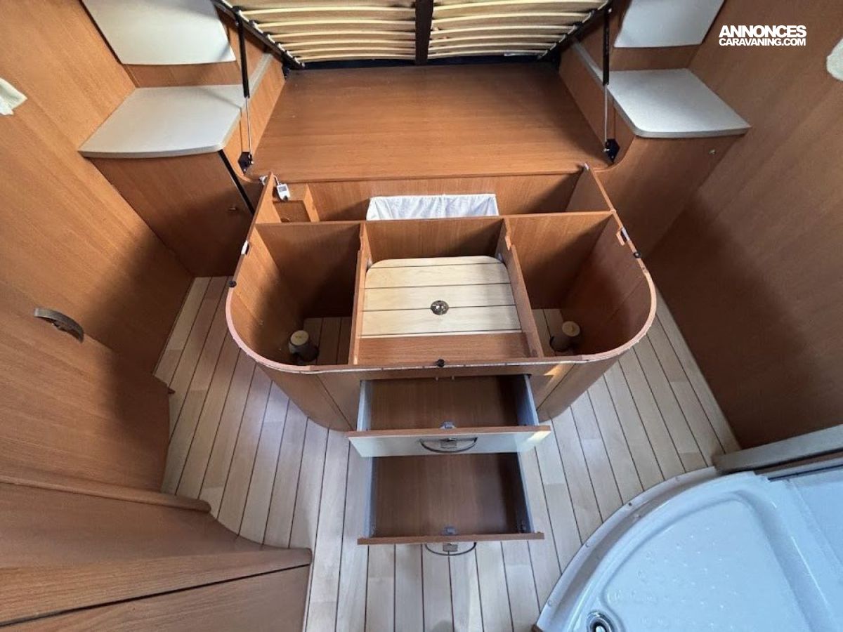Cuisine en L, Douche indépendante, Lit central, lit pavillon cabine, Salon avant sièges pivotants, Salon en L, Soute, WC Cassette.