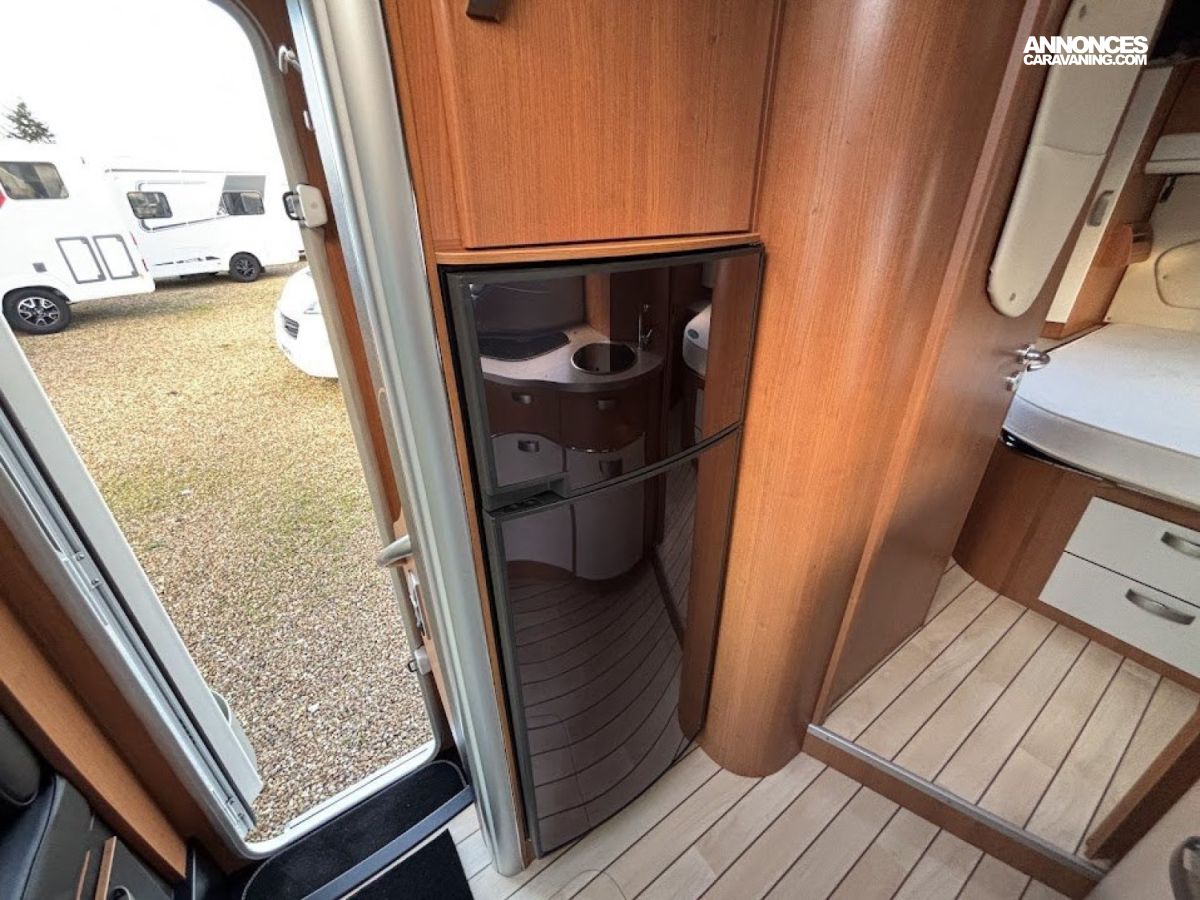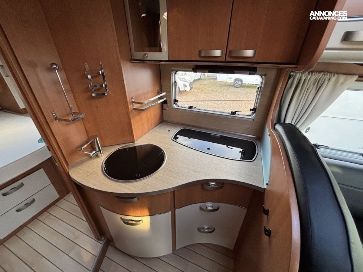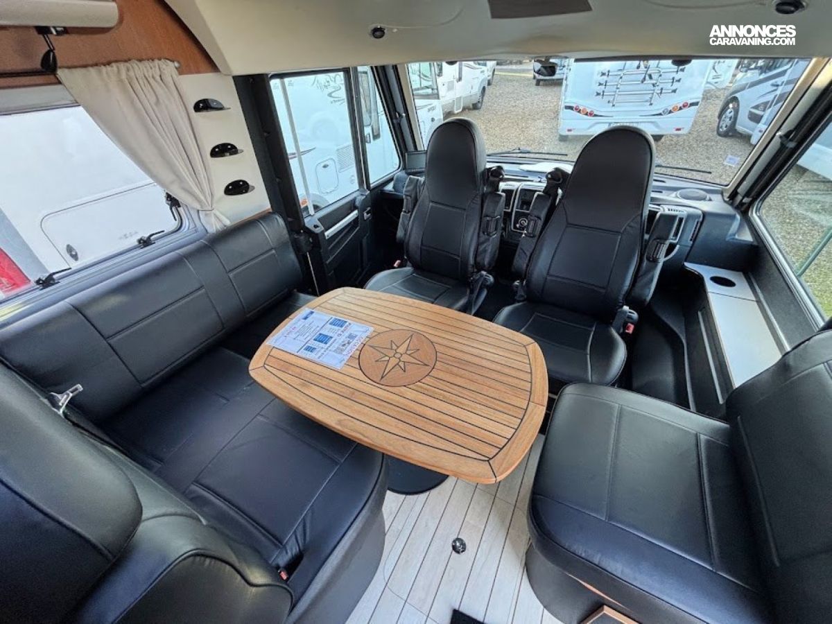 Cuisine en L, Douche indépendante, Lit central, lit pavillon cabine, Salon avant sièges pivotants, Salon en L, Soute, WC Cassette.