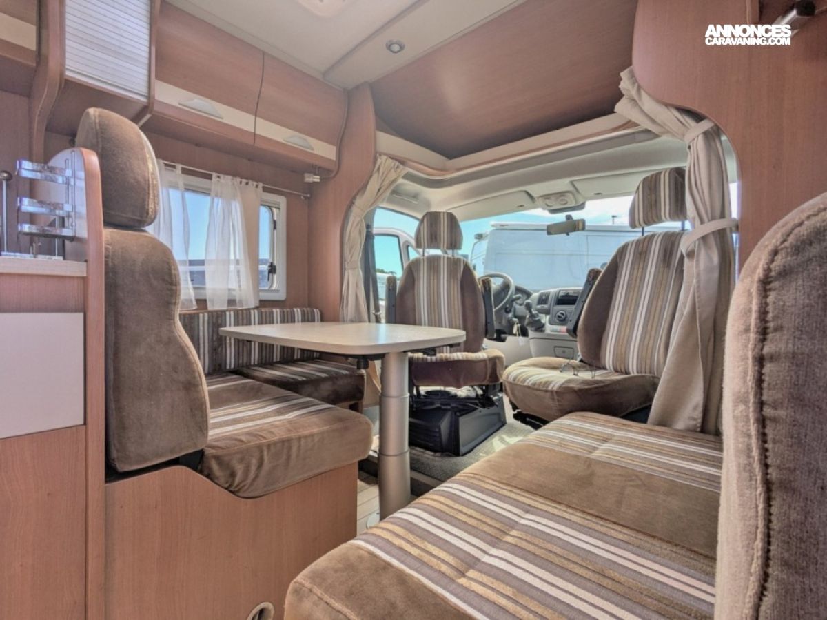 Camping-car profilé en très bon état sur Fiat 2,3 JTD 130 cv avec lit à la française, salle d'eau/WC, douche séparée, cuisine équipée de frigo conservateur de 150 L, plaque gaz 3 feux et de nombreux tiroirs fonctionnels, et salon avant avec sièges pivotants.