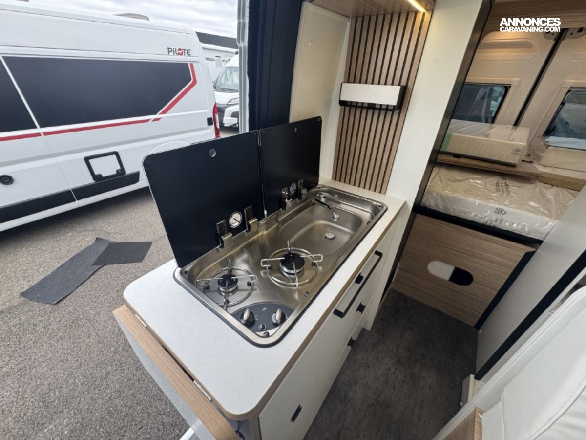 Le Pilote V600G Evidence est l’un des fourgons aménagés les plus complets et les plus polyvalents de sa catégorie. Long de 5,99 m, équipé du tout récent Fiat Ducato 2.2L Euro 6E 140 ch avec boîte automatique, il offre une expérience de conduite fluide, moderne et économique. Son aménagement intérieur haut de gamme propose un lit transversal confortable, une dînette convertible en couchage, une cuisine fonctionnelle, ainsi qu’un salon lumineux. Sa finition Evidence assure un équipement premium incluant caméra de recul, panneau solaire, écran tactile multimédia, CarPlay/Android Auto, chauffage gaz Truma, jantes alliage, et bien plus encore. Un fourgon idéal pour voyager à deux (ou trois avec l’option couchage) tout en bénéficiant d’autonomie et de confort.