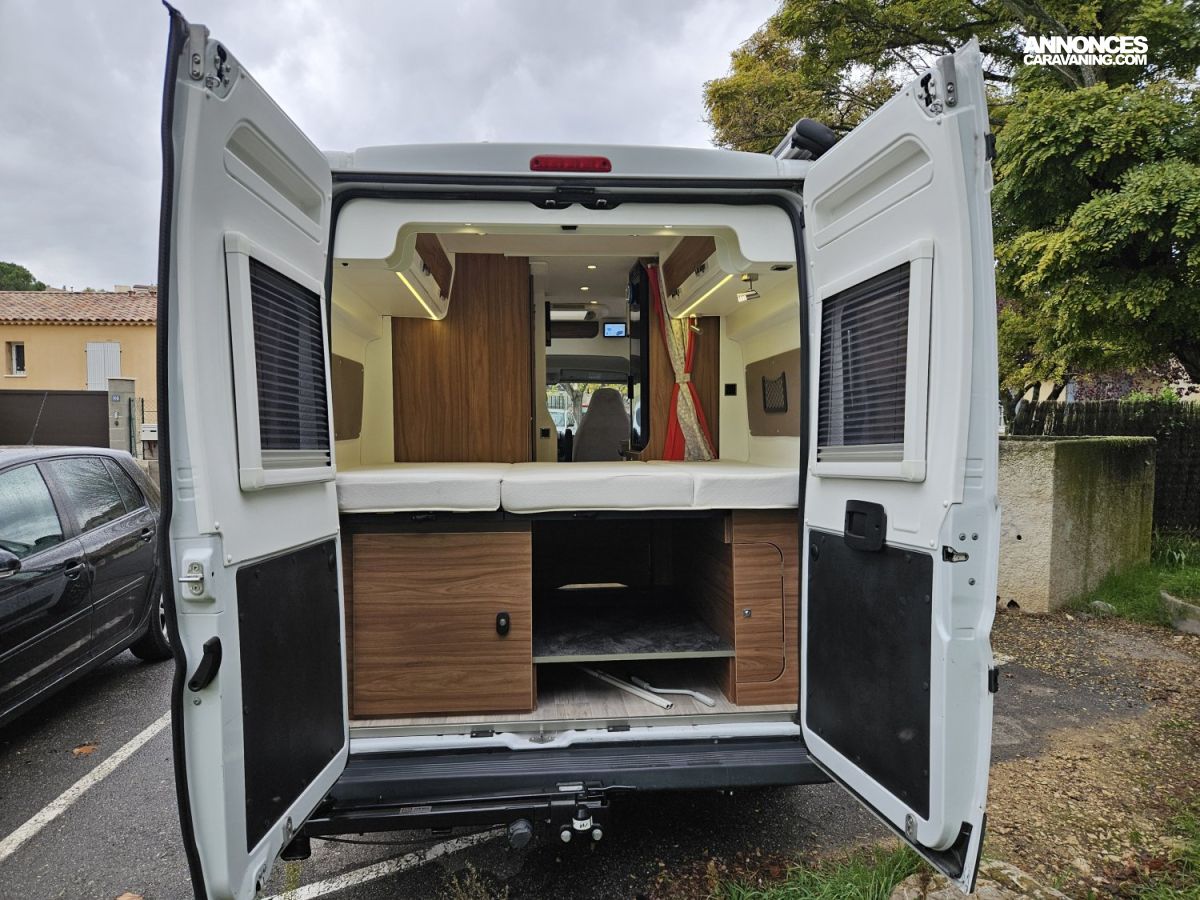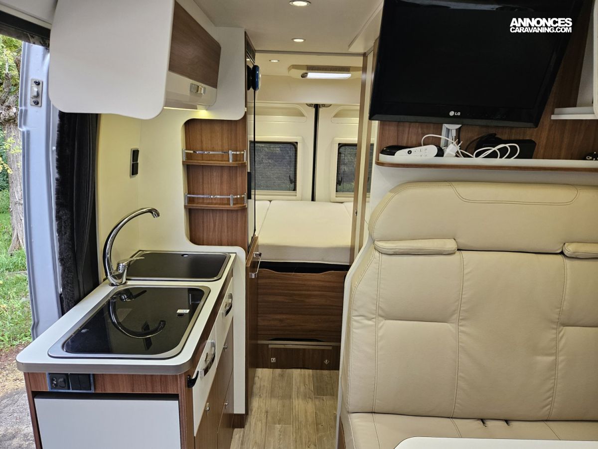 Ce modèle mesure 5,99 mètres de long, offre 4 places carte grise et repas, ainsi que 3 couchages grâce à un lit transversal et un lit sur table à l'avant et aussi des stores et des moustiquaires sur tous les ouvrants.