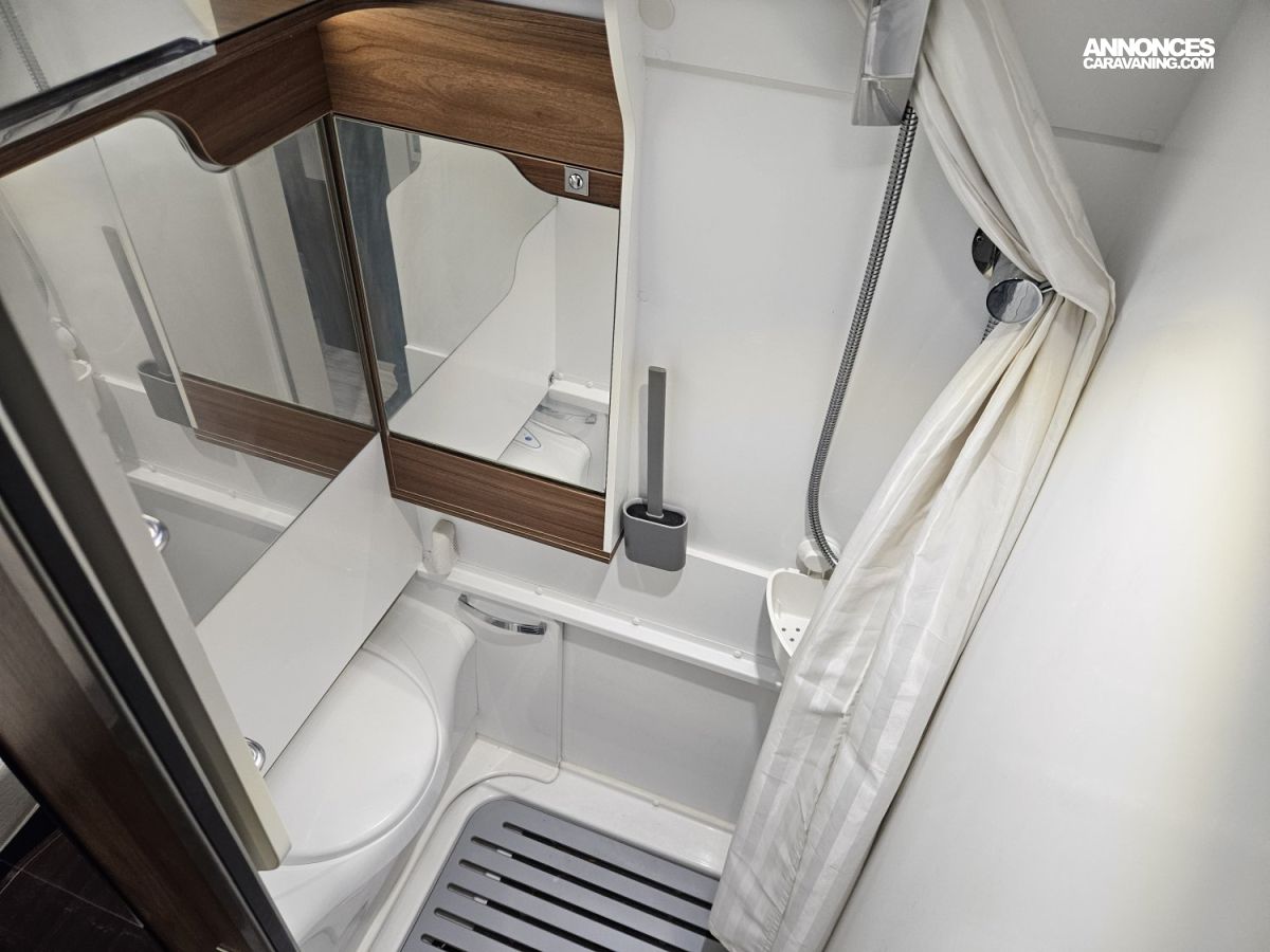 Un lanterneau panoramique, une fenêtre dans la salle de bain, une moustiquaire de porte cellule et une porte cellule XL très pratique. On trouve également un store extérieur de 4 mètres, des stores plissés en cabine, une rallonge de table et un porte vélos avec un bras articulé.