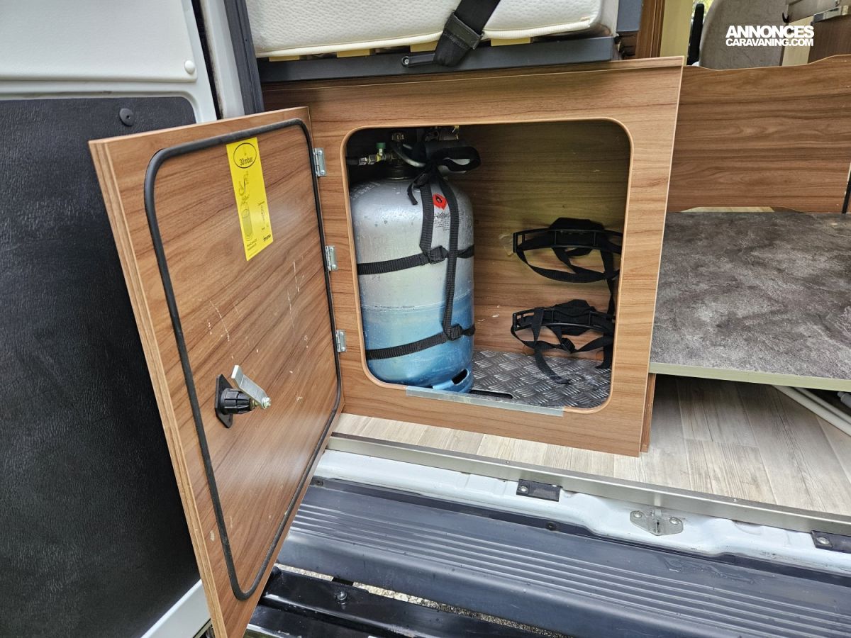 La partie cellule est très bien équipée avec un chauffage combi Truma 4, un éclairage LED, une gazinière deux feux, un réfrigérateur à compression en 12 volt avec freezer.