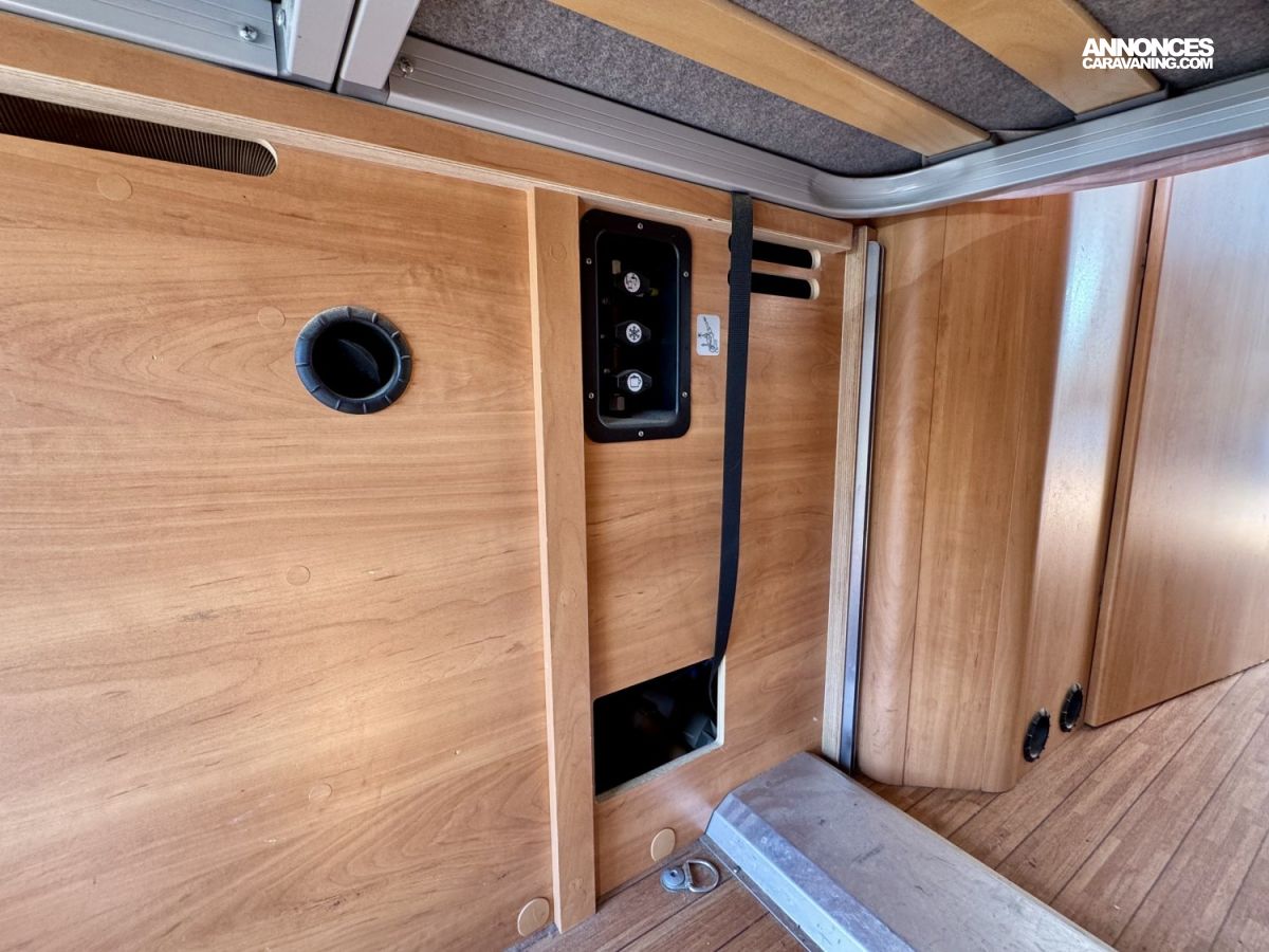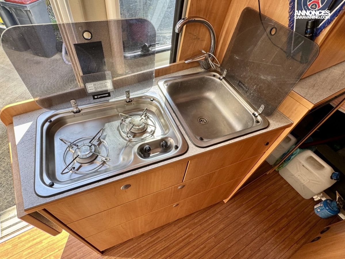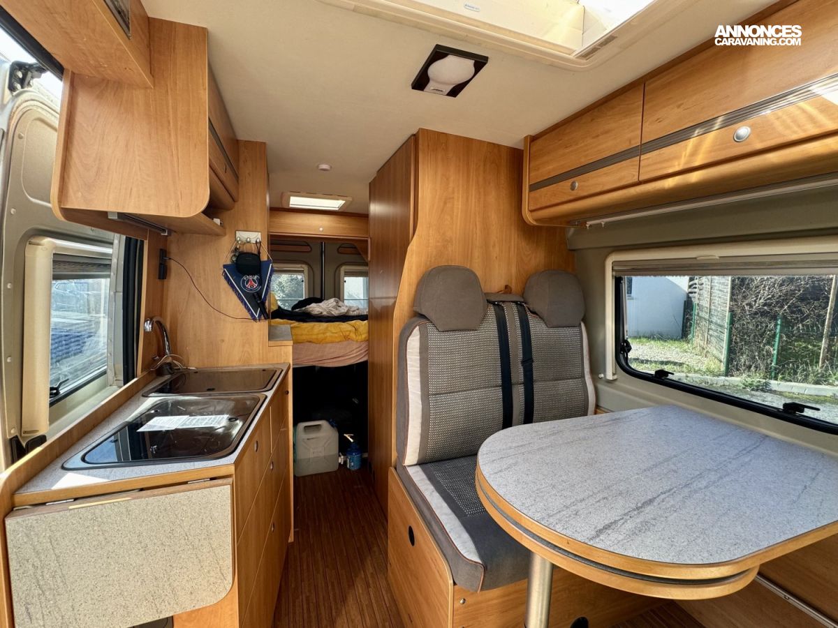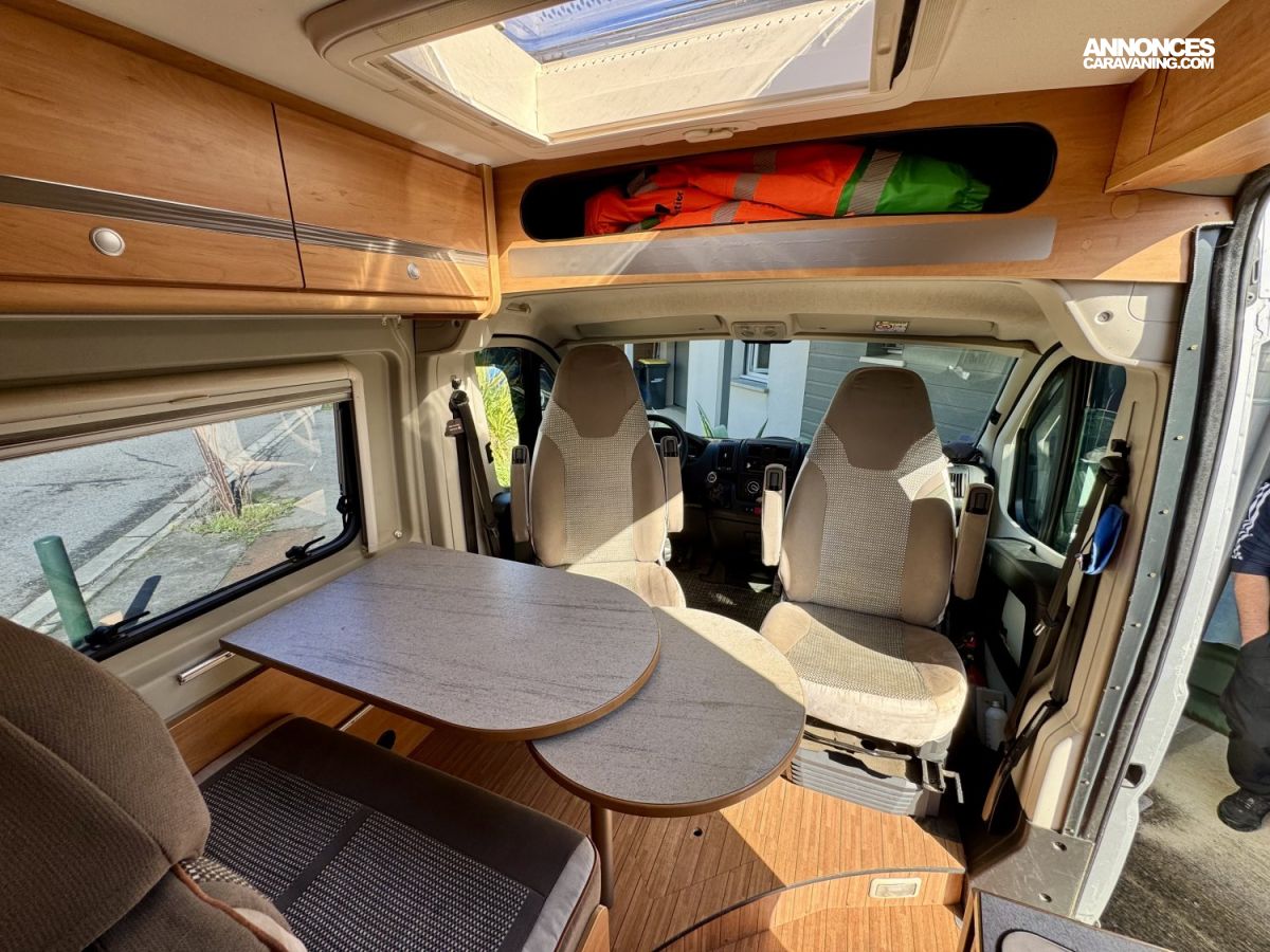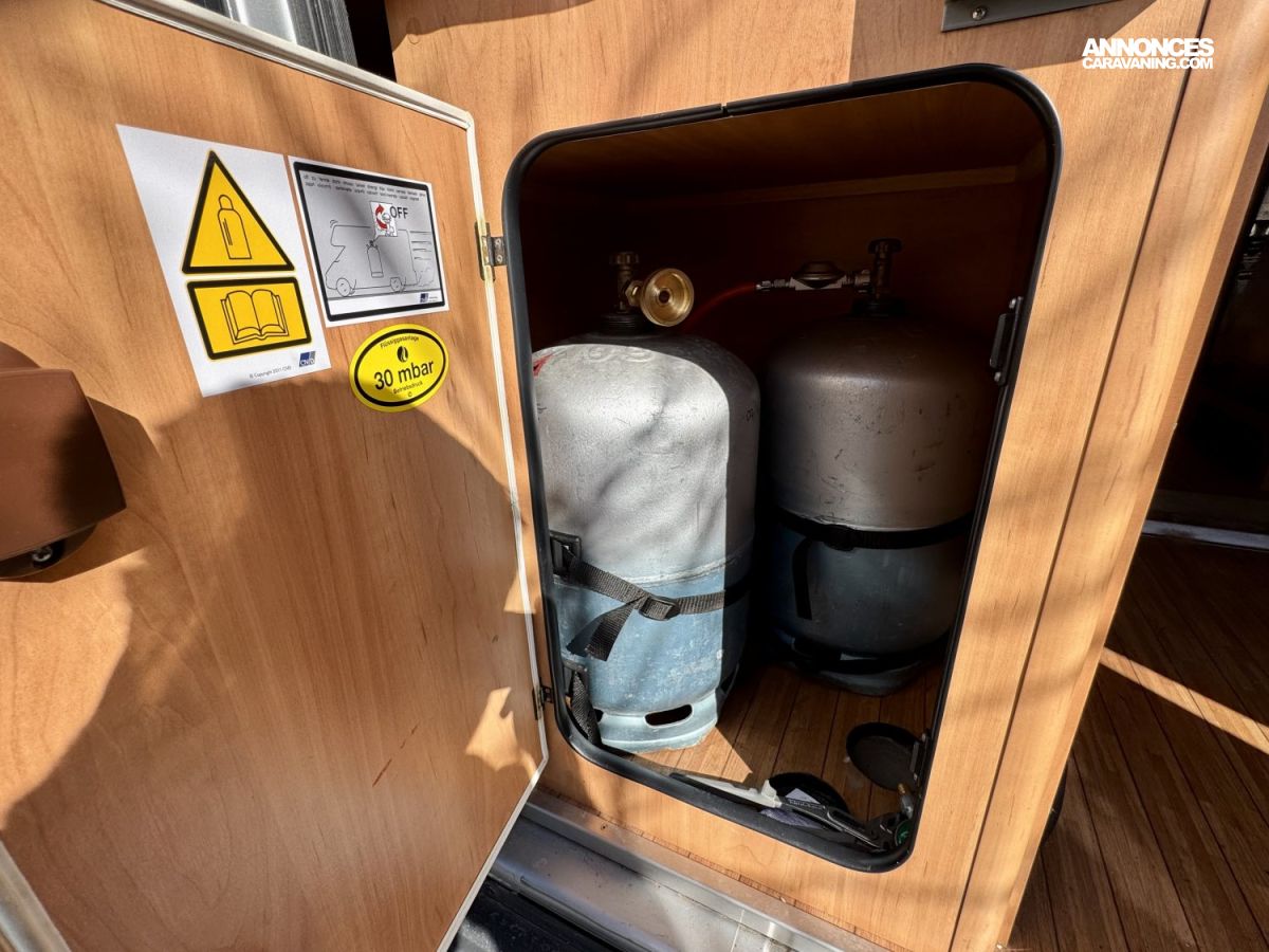 CHAUFFAGE COMBI TRUMA 4, STORE EXTERIEUR 3.5M, GAZINIERE 2 FEUX, ECLAIRAGE LED, MOQUETTE CABINE, RALLONGE DE TABLE, REFRIGERATEUR TRI MIX, STORES PLISSES DE CABINE, TABLE TELESCOPIQUE, LANTERNEAU PANORAMIQUE