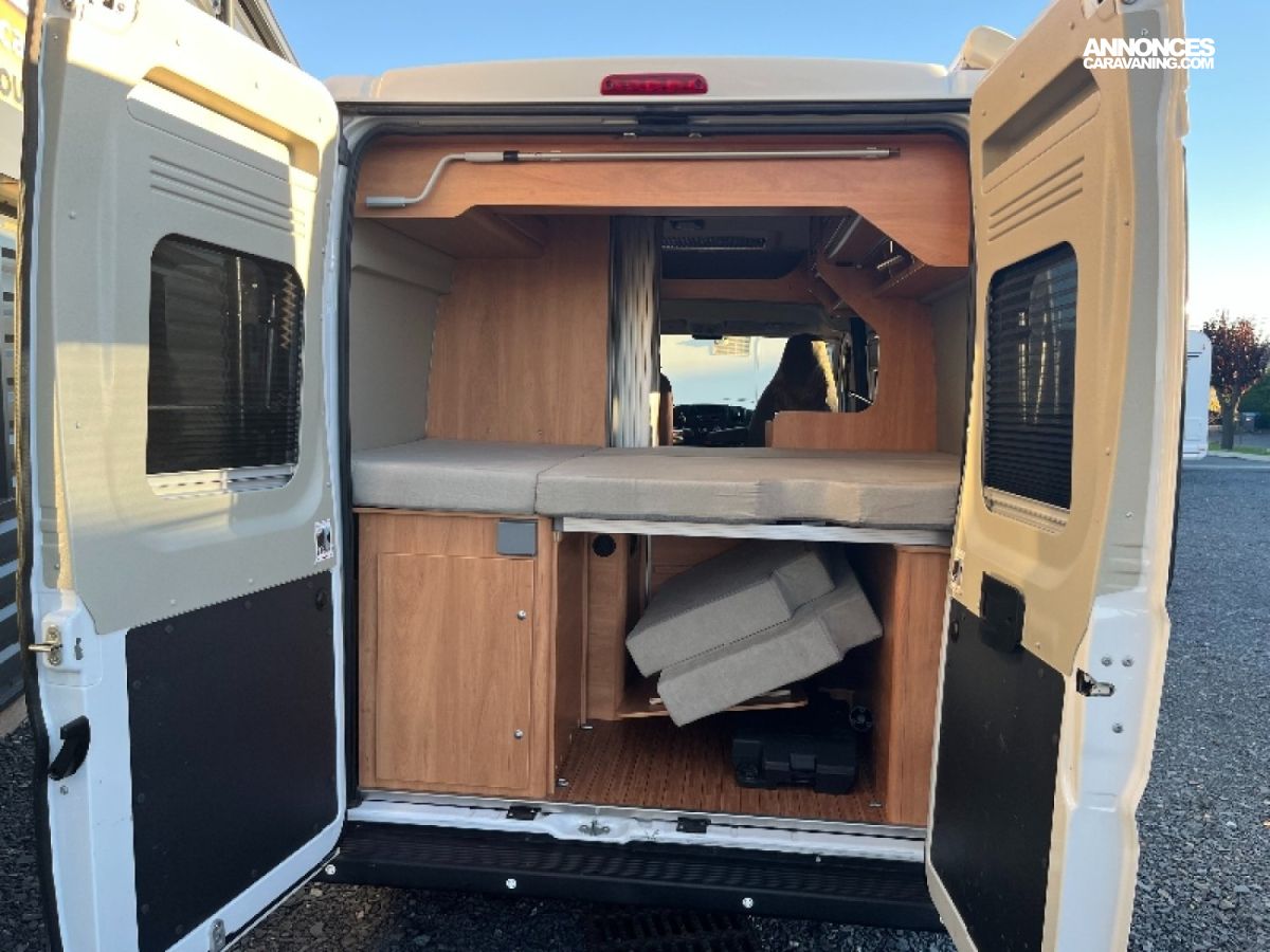 Porteur : Citroën Jumper 2,0 l 130 chL x l x h : 5.41 x 2.05 x 2.59 mPTAC/CU (kg) : 3300/580Clim cabine : OuiCarrosserie : Fourgon d'origineCuisine : avec réchaud 2 feux - réfrigérateur 64 litresCouchage : Lit permanent arrière (196 x 132 cm)Toilette : WC à cassetteDouche : Séparée