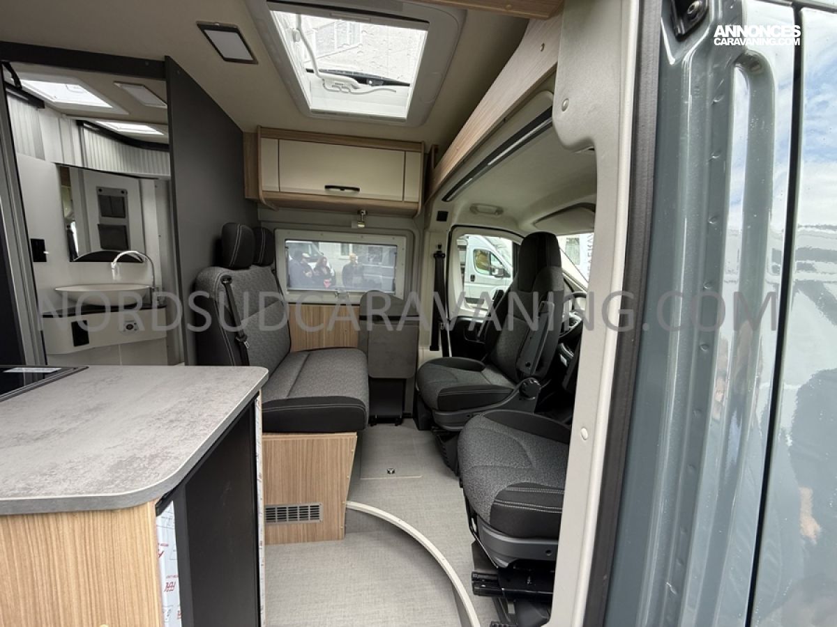 Sa dinette agréable et lumineuse pour une ambiance conviviale. Sa cuisine latérale, pratique et fonctionnelle est équipée d’un réchaud 2 feux, évier et plan de travail rabattable. En face, une salle d'eau avec WC, lavabo, et une douche spacieuse. A l’arrière, ce sont de lits jumeaux, pour plus d’espace. Sans oublier ses nombreux rangements astucieux !