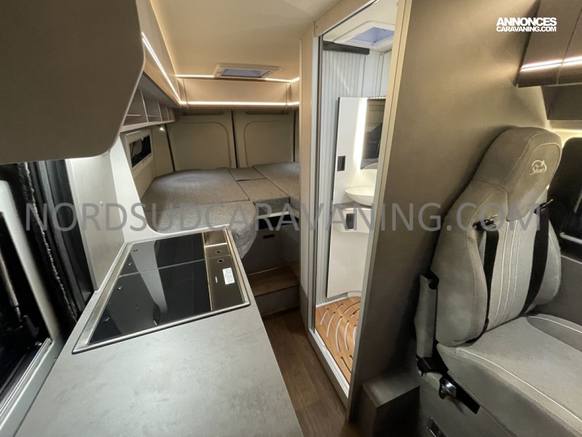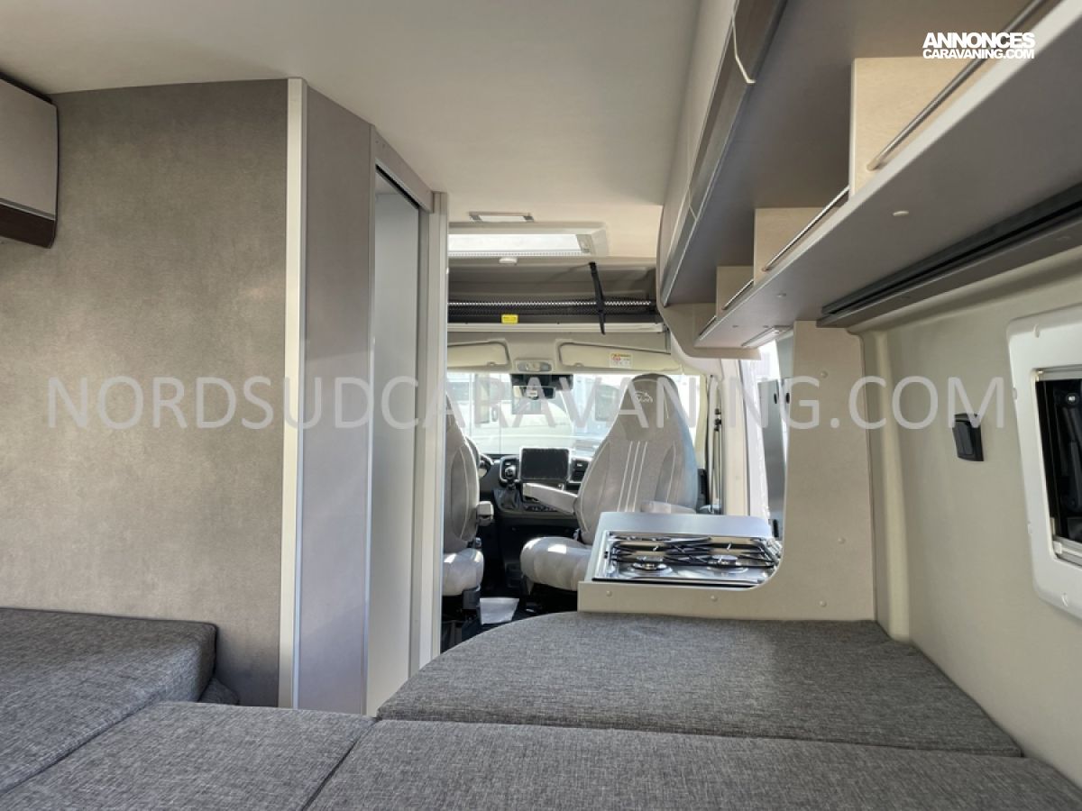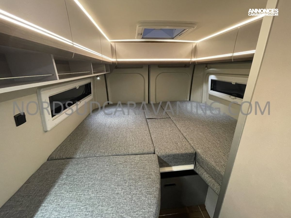 Long de 5.99 mètres, il offre à l’arrière une zone de nuit XXL avec lits jumeaux unifiables.