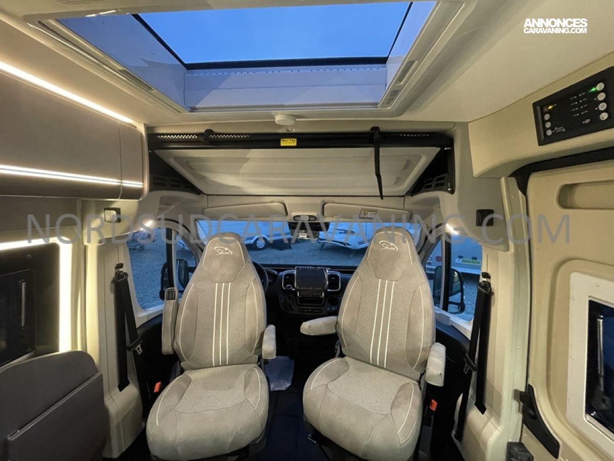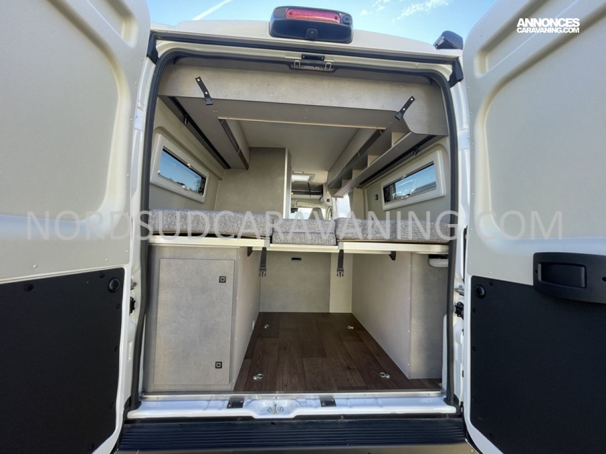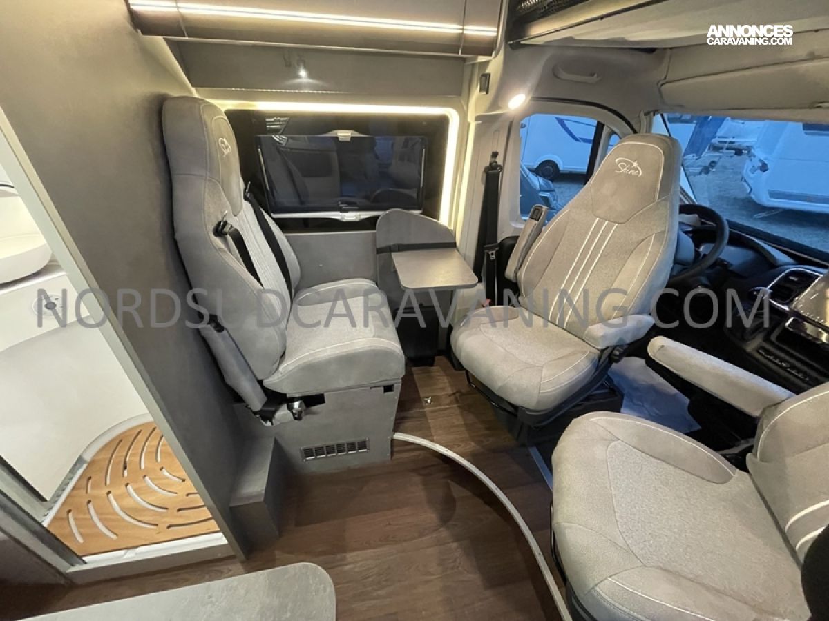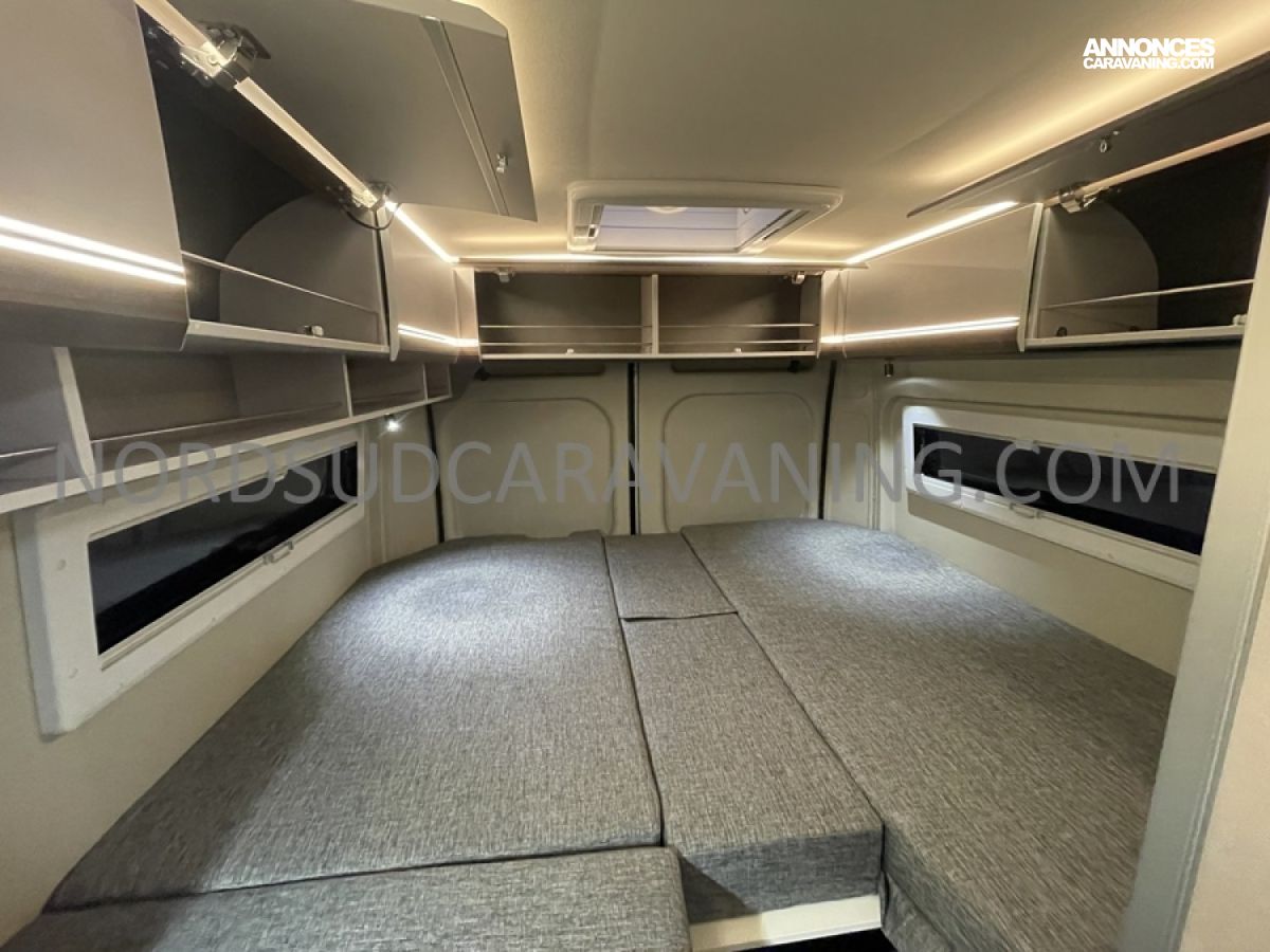 Long de 5.99 mètres, il offre à l’arrière une zone de nuit XXL avec lits jumeaux unifiables.