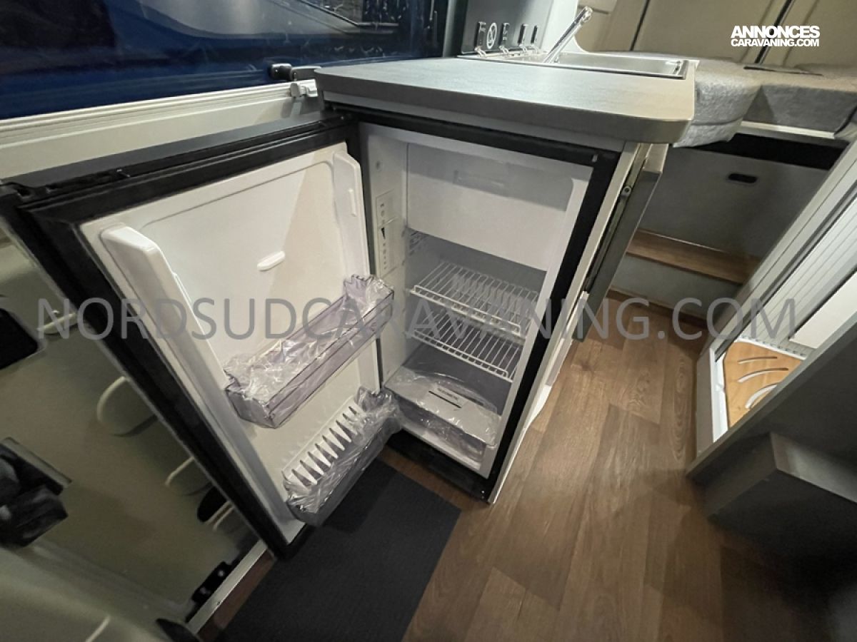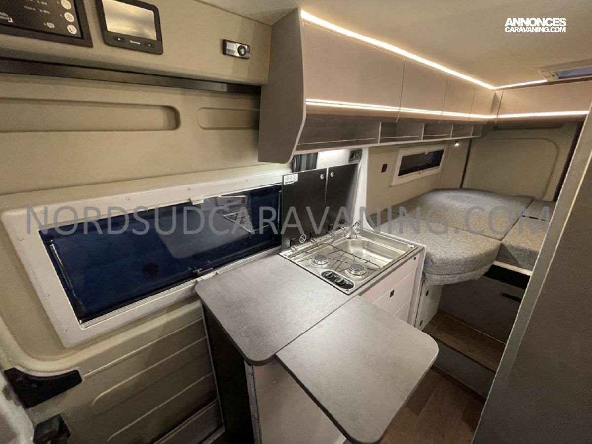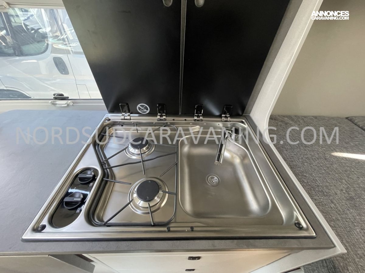Sa dinette est agréable et lumineuse pour une ambiance conviviale. Sa cuisine latérale, pratique et fonctionnelle est équipée d’un réchaud 2 feux, évier et plan de travail rabattable. En face, une jolie salle de bain avec WC, lavabo et une douche vario spacieuse. Sans oublier ses nombreux rangements astucieux !