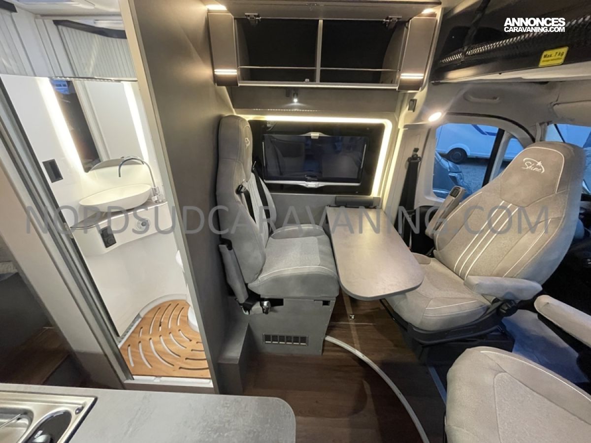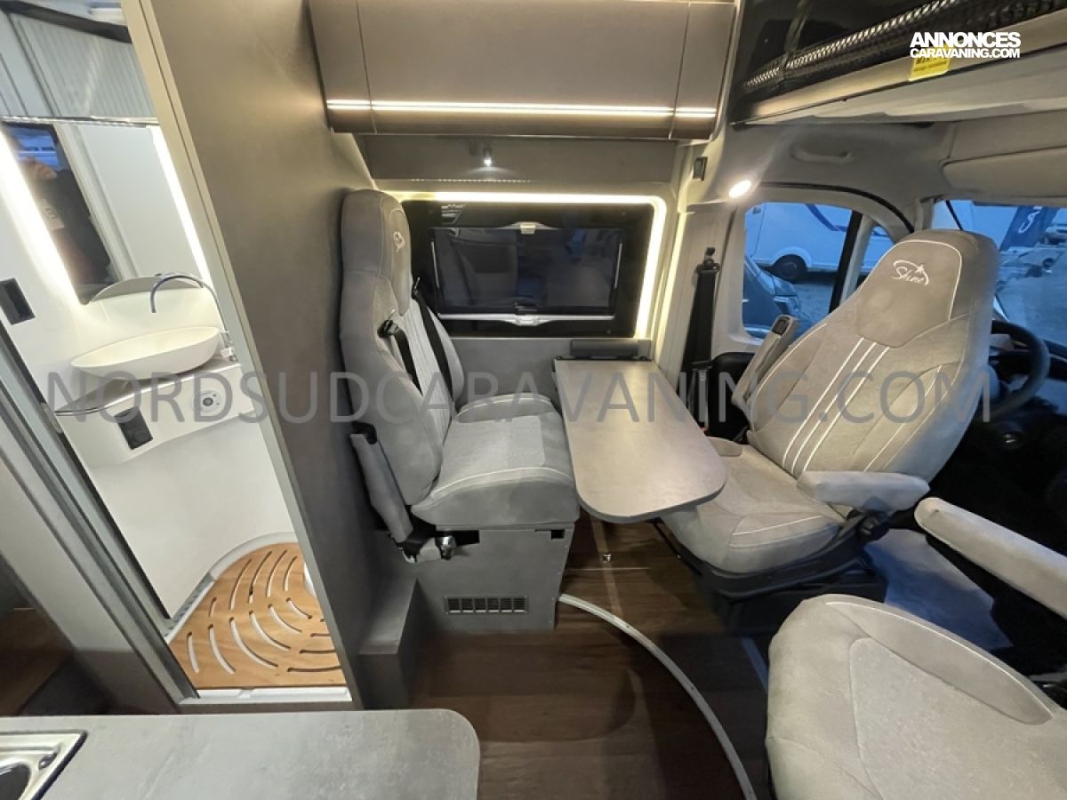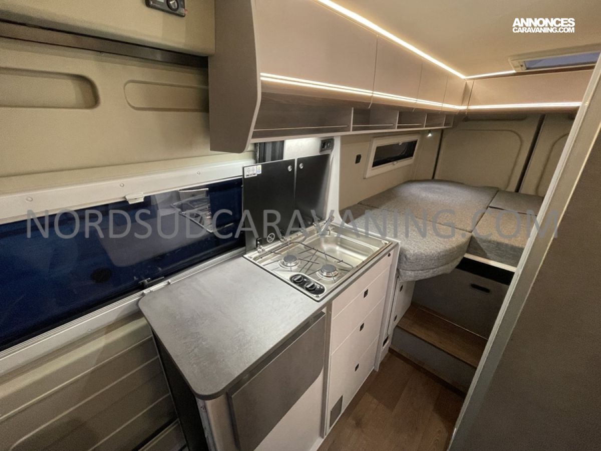 Sa dinette est agréable et lumineuse pour une ambiance conviviale. Sa cuisine latérale, pratique et fonctionnelle est équipée d’un réchaud 2 feux, évier et plan de travail rabattable. En face, une jolie salle de bain avec WC, lavabo et une douche vario spacieuse. Sans oublier ses nombreux rangements astucieux !