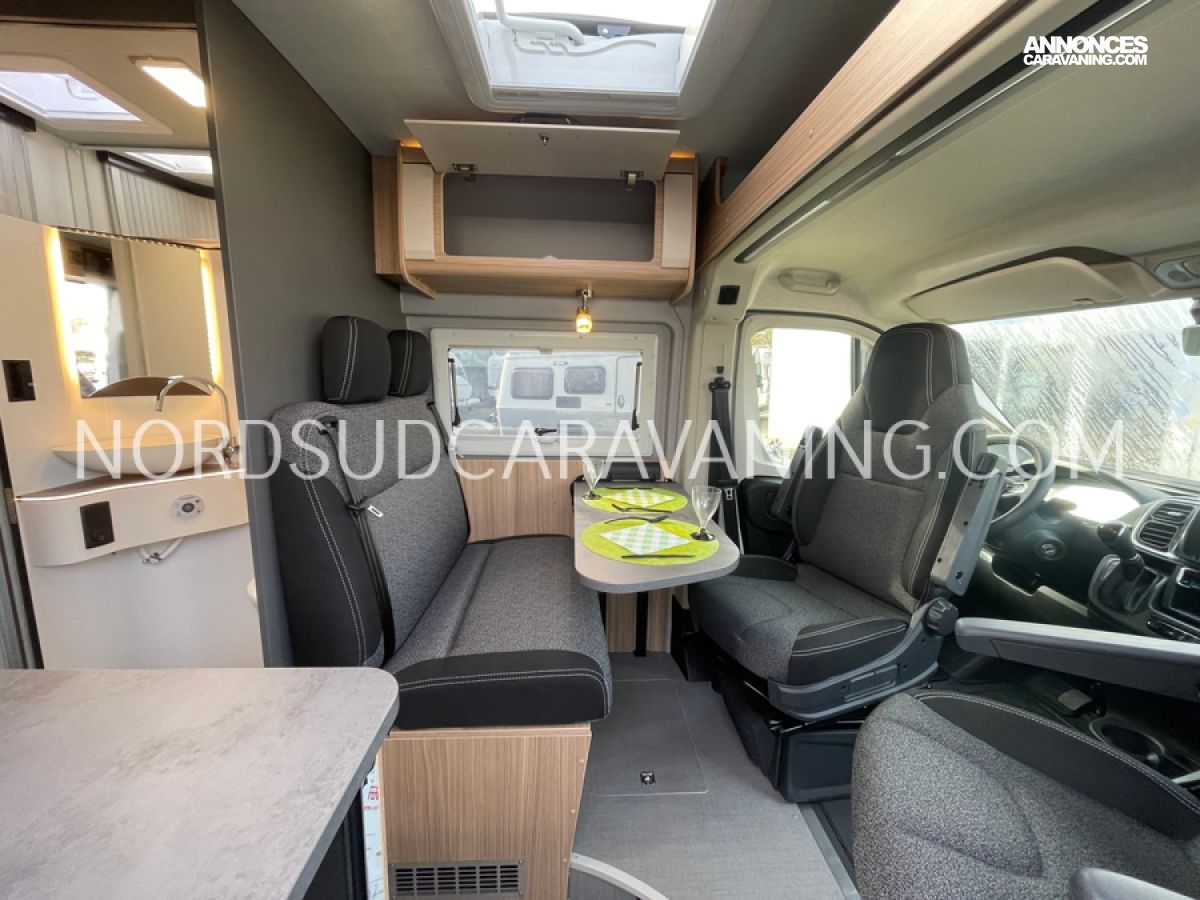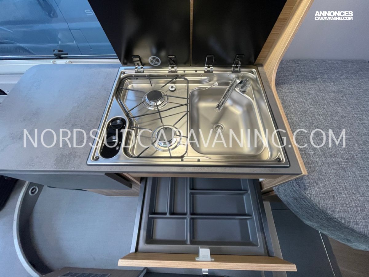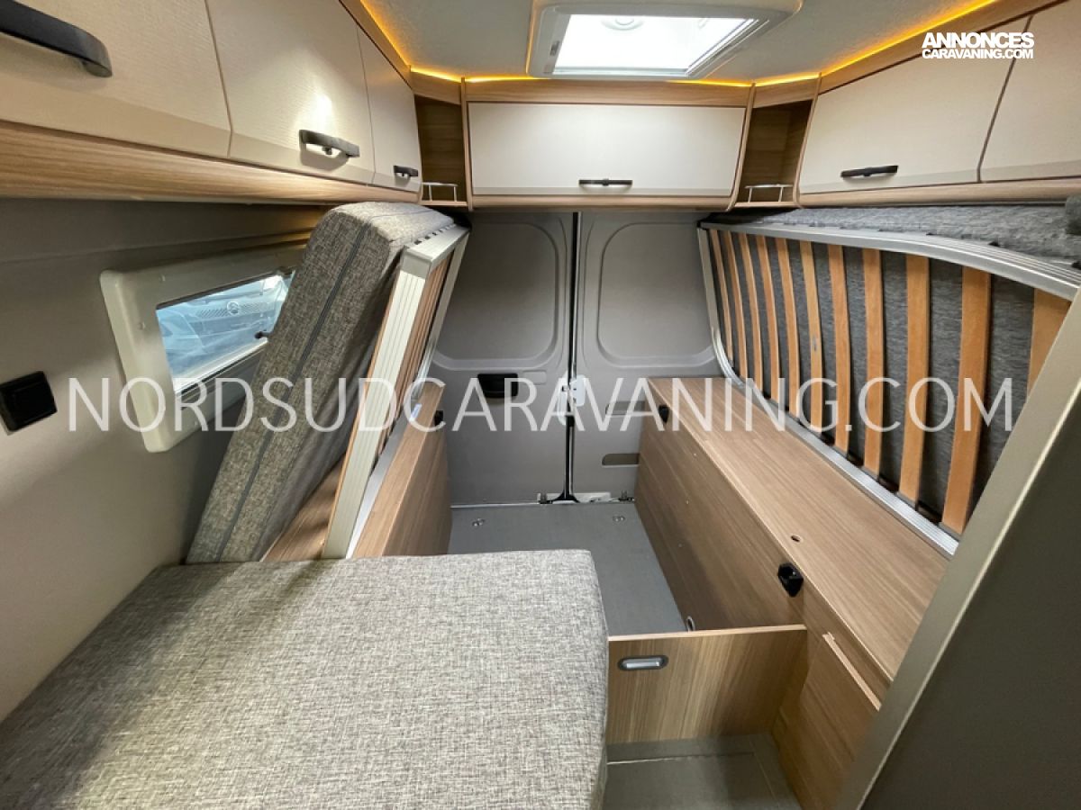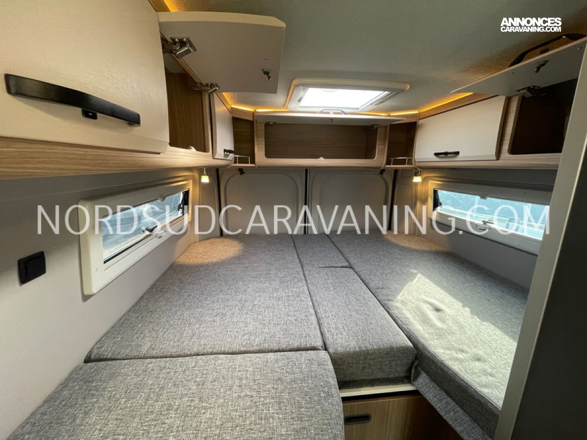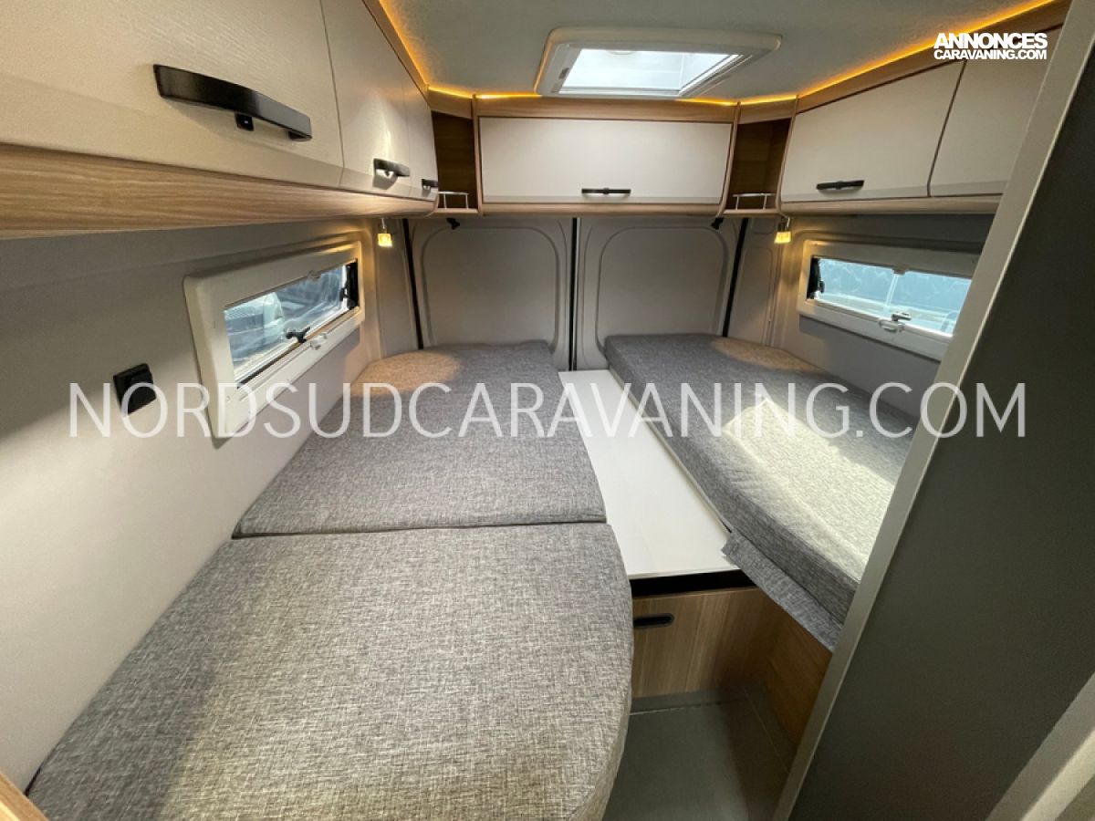 Sa dinette agréable et lumineuse pour une ambiance conviviale. Sa cuisine latérale, pratique et fonctionnelle est équipée d’un réchaud 2 feux, évier et plan de travail rabattable. En face, une salle d'eau avec WC, lavabo, et une douche spacieuse. A l’arrière, ce sont de lits jumeaux, pour plus d’espace. Sans oublier ses nombreux rangements astucieux !
