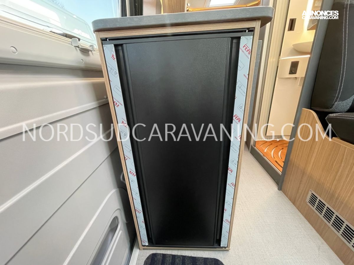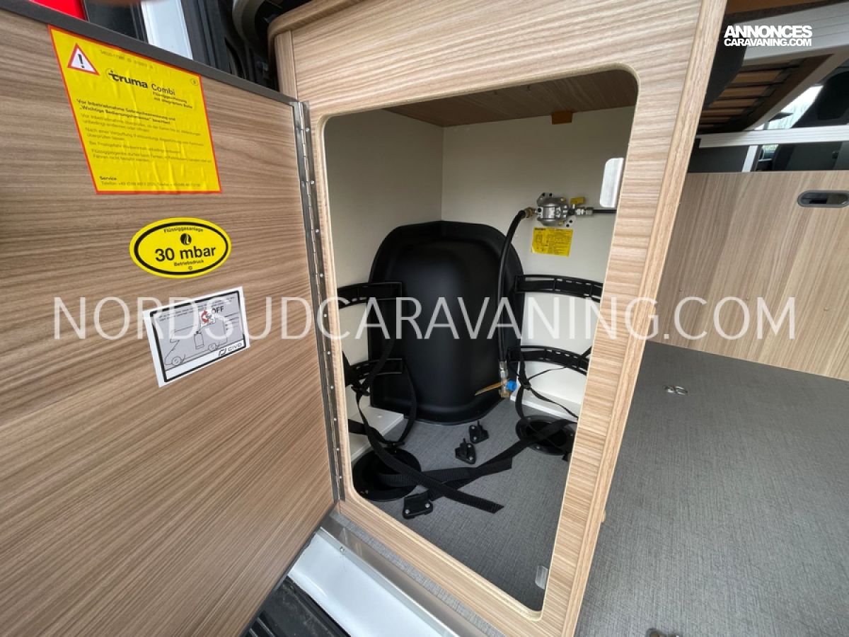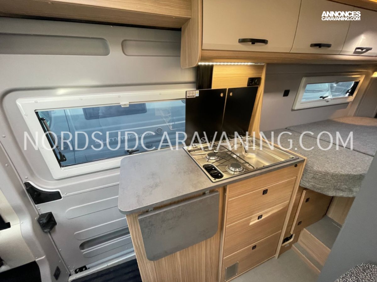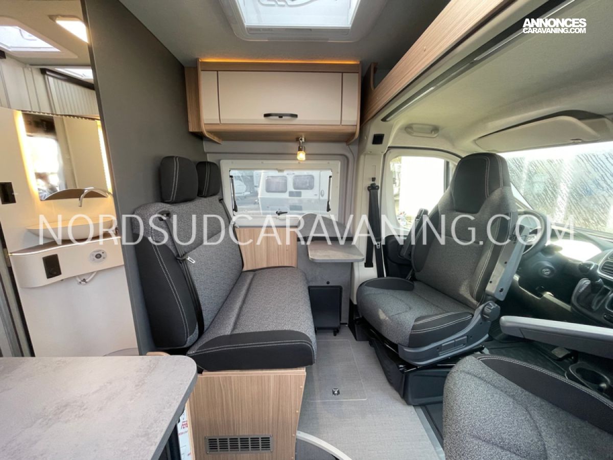 Sa dinette agréable et lumineuse pour une ambiance conviviale. Sa cuisine latérale, pratique et fonctionnelle est équipée d’un réchaud 2 feux, évier et plan de travail rabattable. En face, une salle d'eau avec WC, lavabo, et une douche spacieuse. A l’arrière, ce sont de lits jumeaux, pour plus d’espace. Sans oublier ses nombreux rangements astucieux !