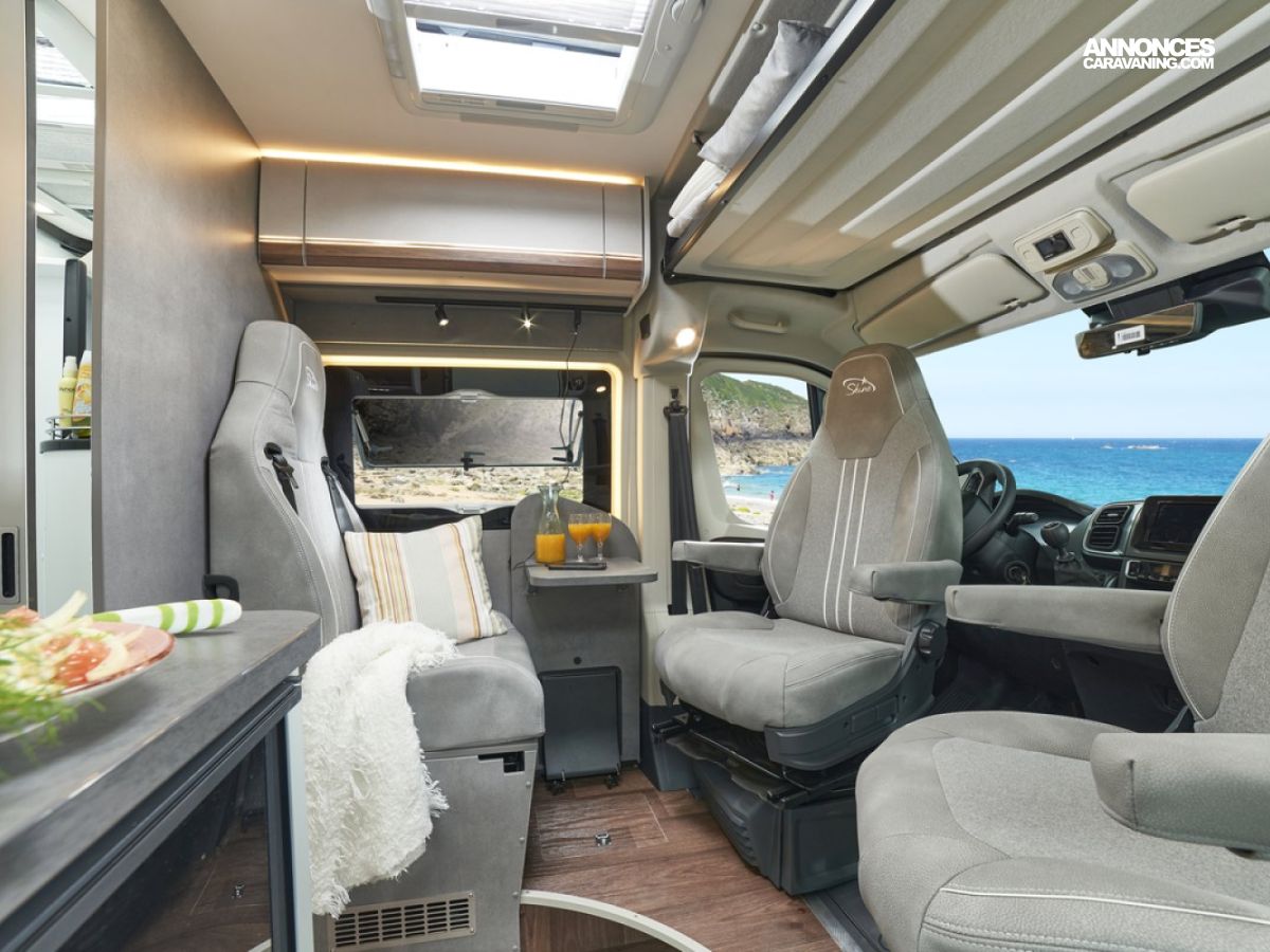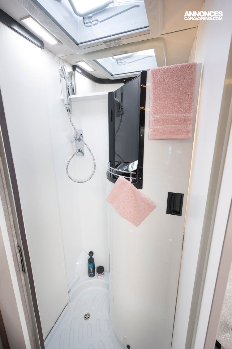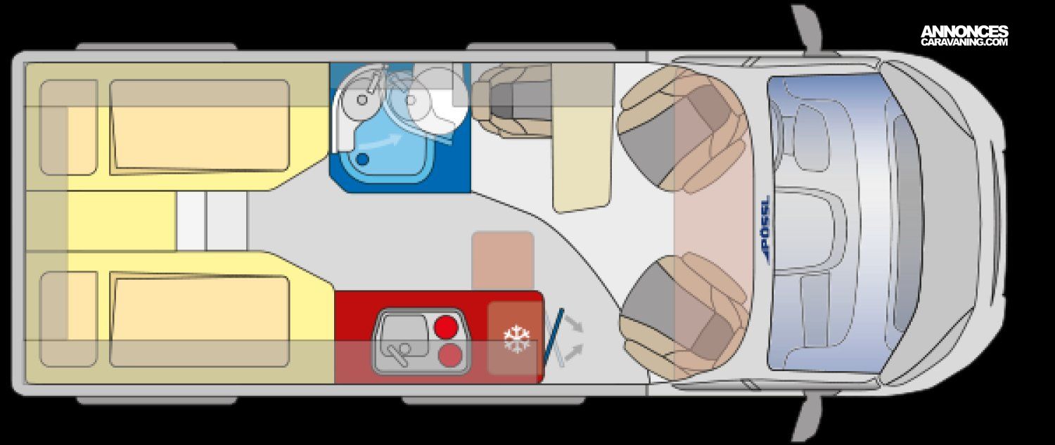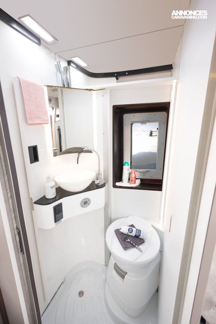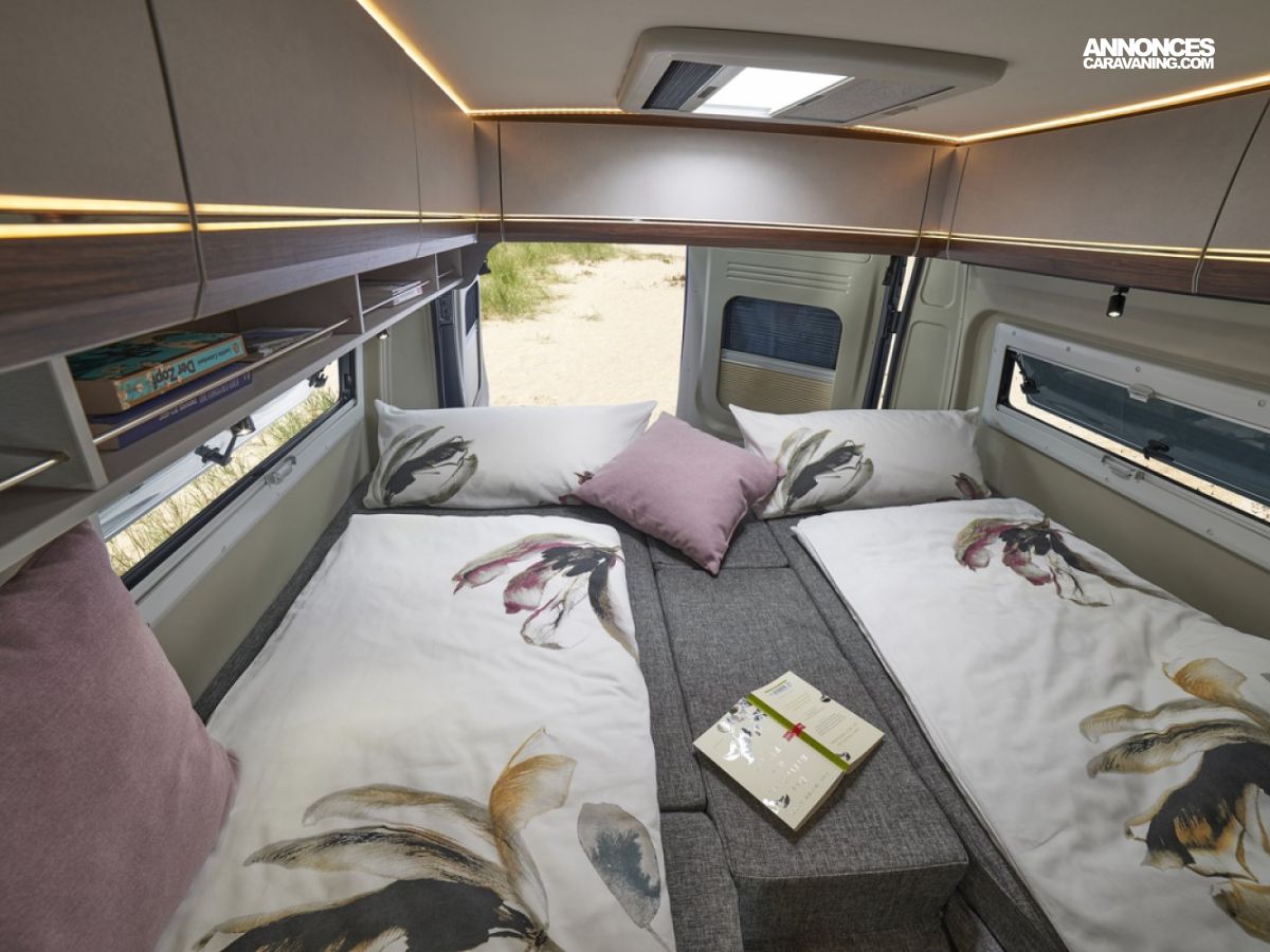 Sa dinette agréable et lumineuse pour une ambiance conviviale. Sa cuisine latérale pratique et fonctionnelle est équipée d’un réchaud 2 feux, évier et plan de travail rabattable. En face, une salle d’eau avec WC, lavabo, et une douche spacieuse. A l’arrière, ce sont des lits jumeaux, pour des nuits confortables et agréables. Sans oublier ses nombreux rangements astucieux !
