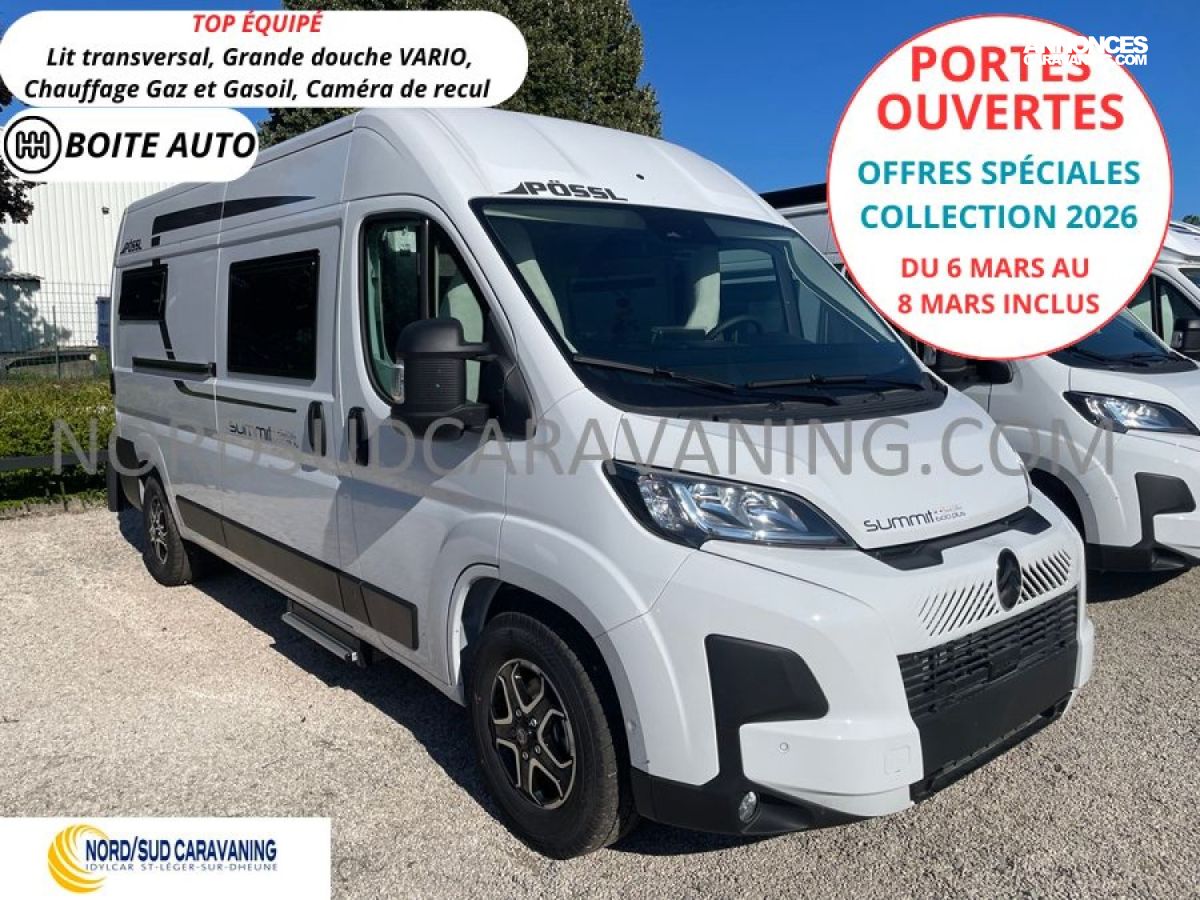 Magnifique Fourgon Compact Pössl sur Citroën Jumper, Top équipé, Boite Automatique, Caméra de recul, Marche pied électrique, Lit transversal, Chauffage gaz / gasoil…