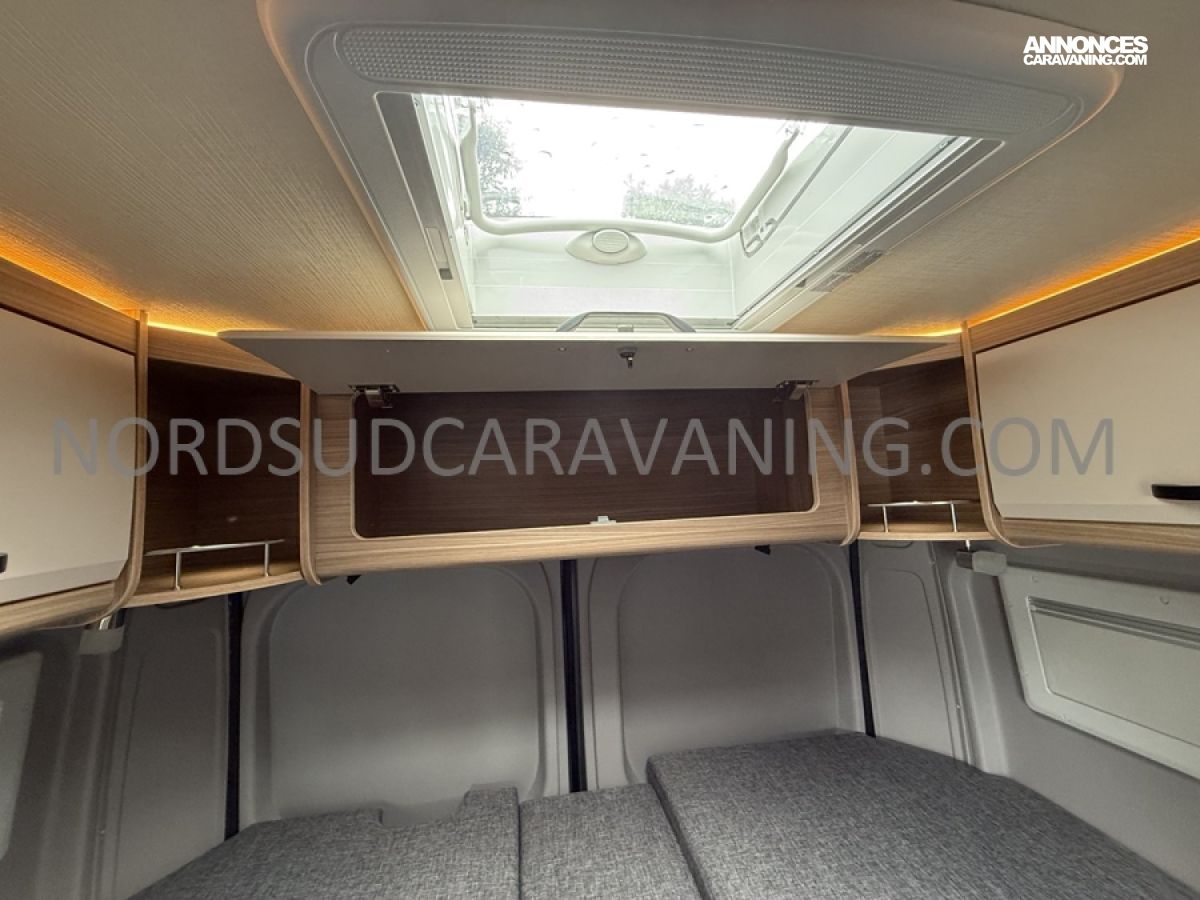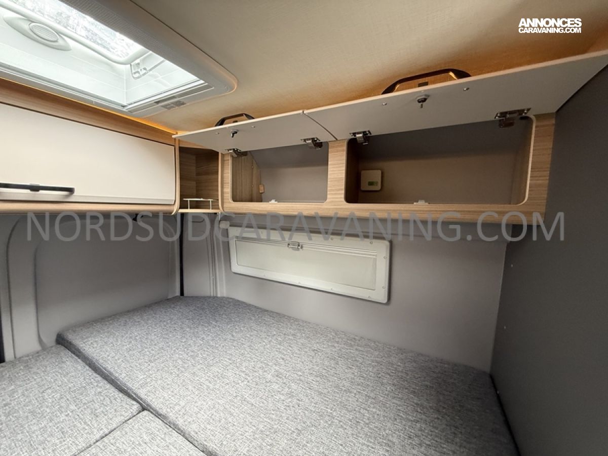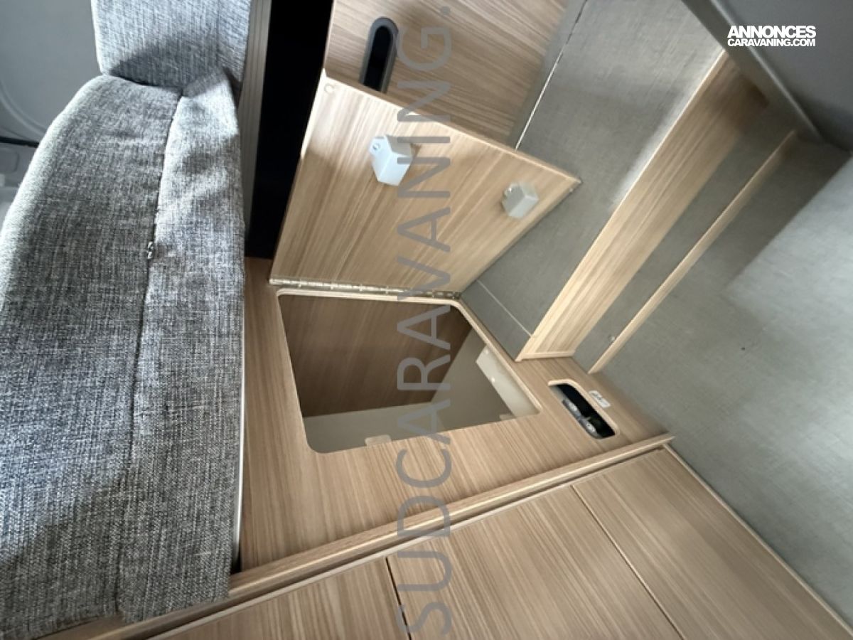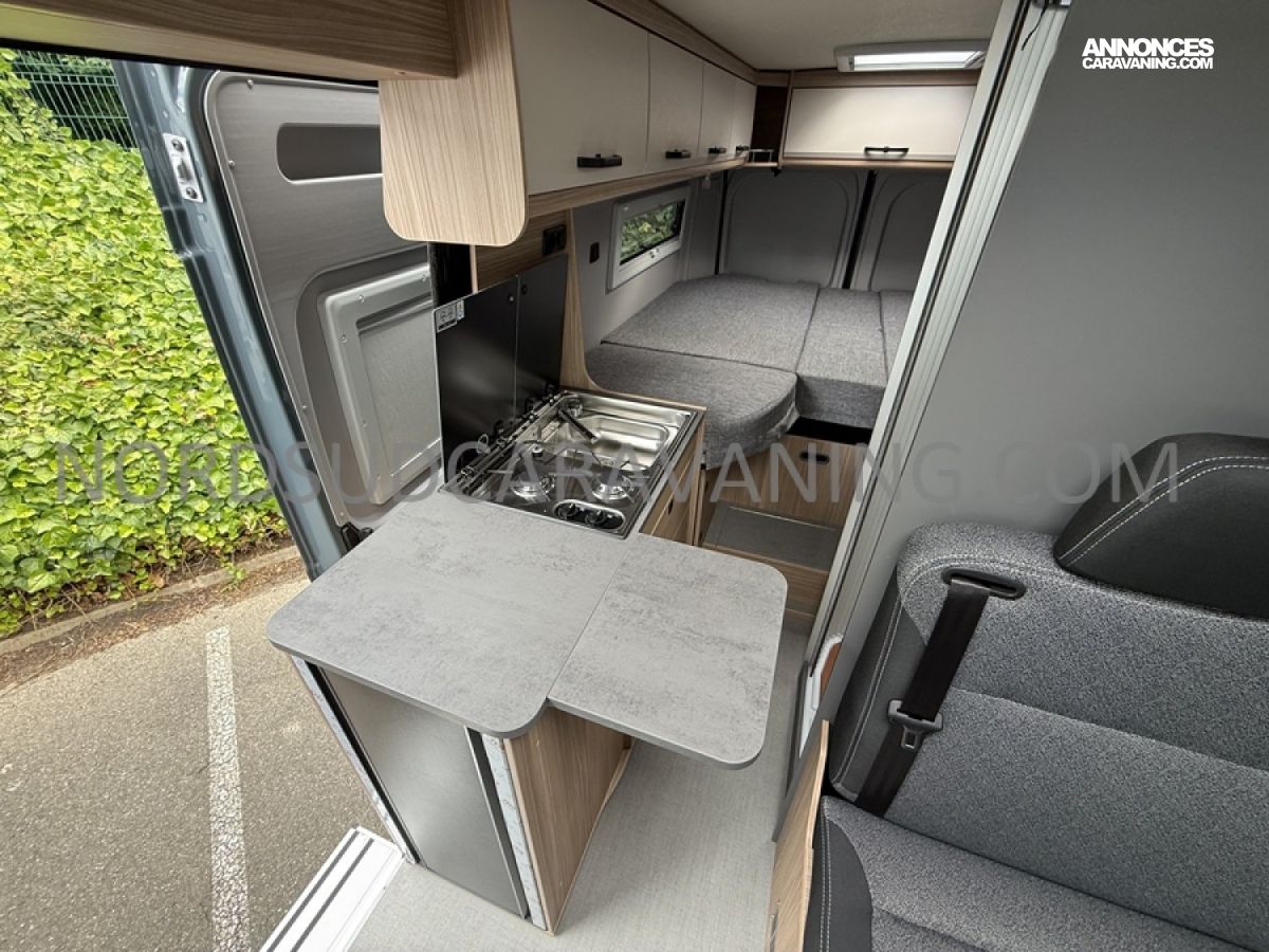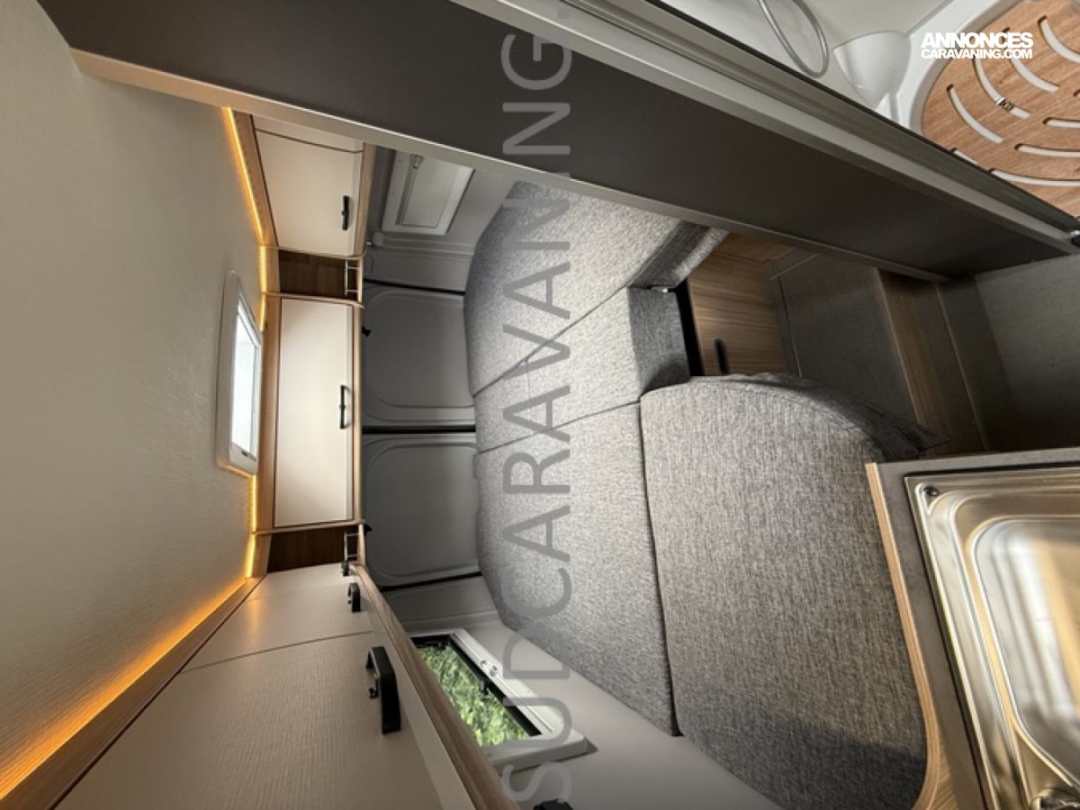 Sa dinette agréable et lumineuse pour une ambiance conviviale. Sa cuisine latérale, pratique et fonctionnelle est équipée d’un réchaud 2 feux, évier et plan de travail rabattable. En face, une salle d'eau avec WC, lavabo, et une douche spacieuse. A l’arrière, ce sont de lits jumeaux, pour plus d’espace. Sans oublier ses nombreux rangements astucieux !