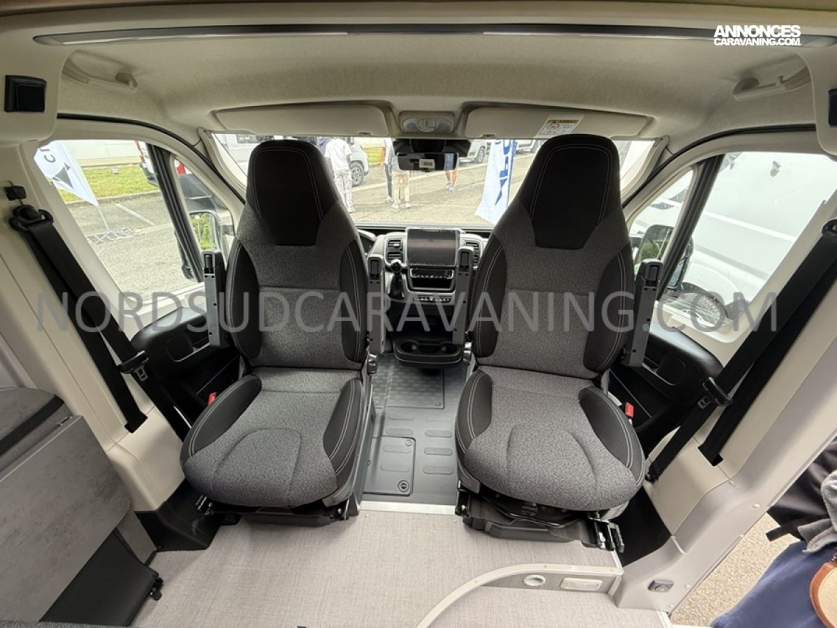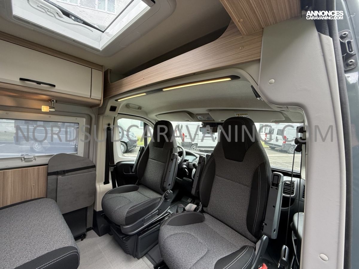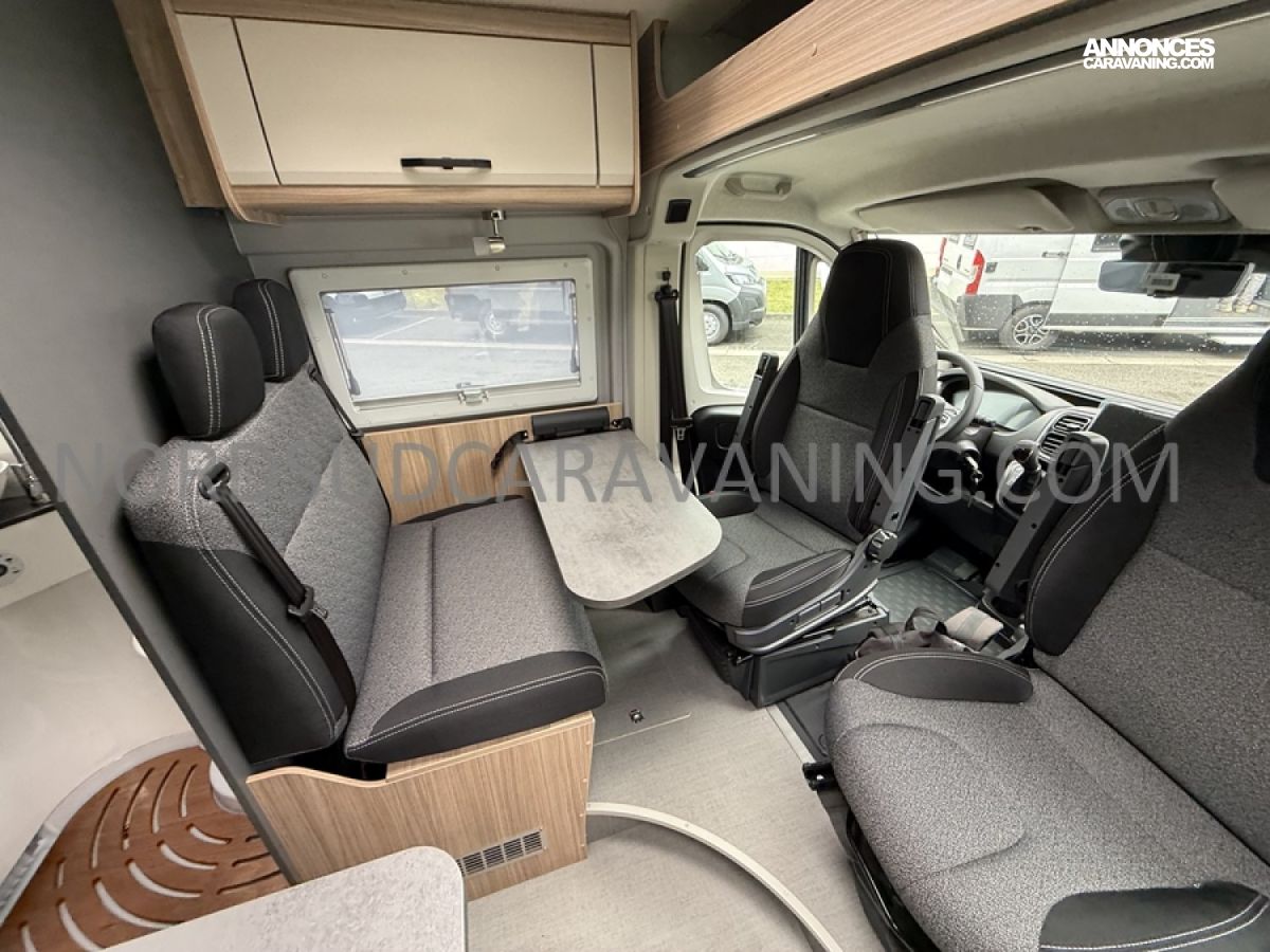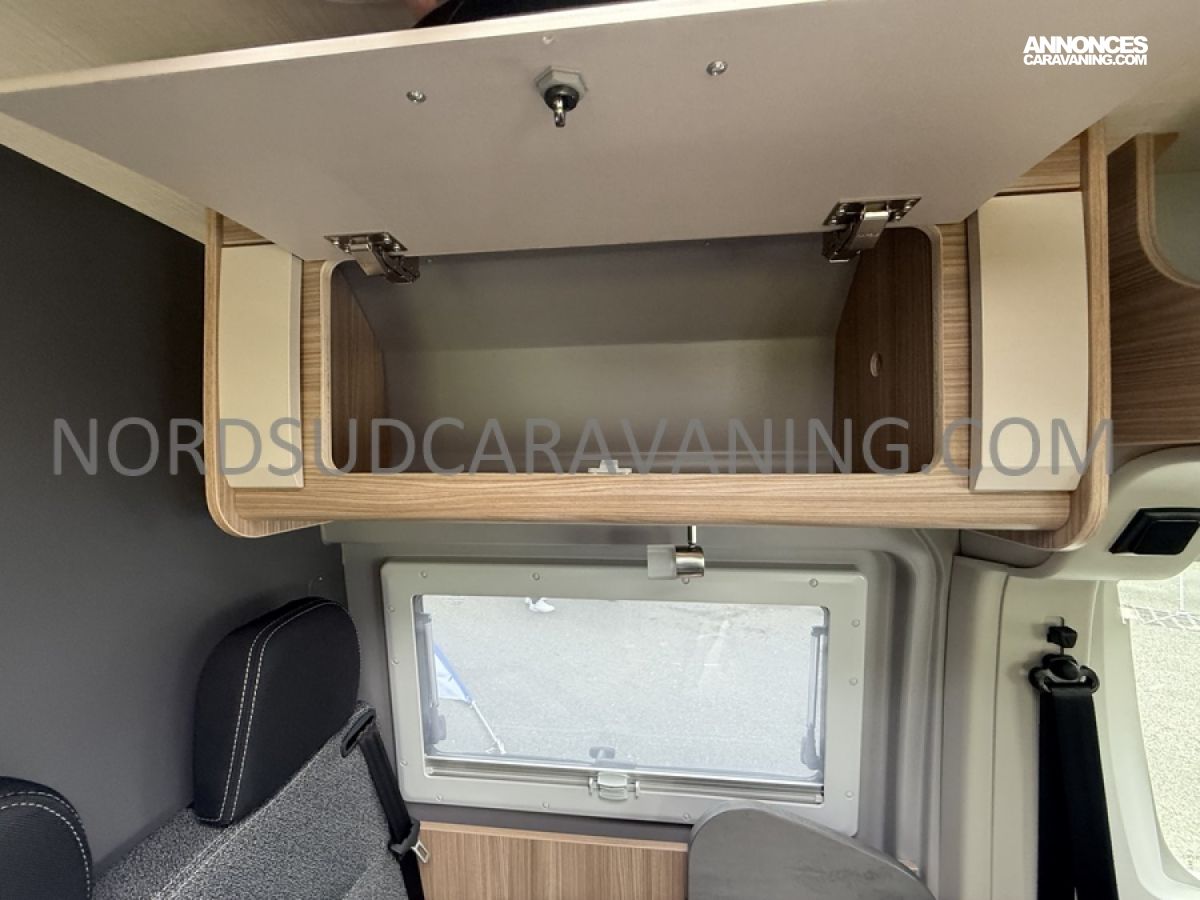 Sa dinette agréable et lumineuse pour une ambiance conviviale. Sa cuisine latérale, pratique et fonctionnelle est équipée d’un réchaud 2 feux, évier et plan de travail rabattable. En face, une salle d'eau avec WC, lavabo, et une douche spacieuse. A l’arrière, ce sont de lits jumeaux, pour plus d’espace. Sans oublier ses nombreux rangements astucieux !