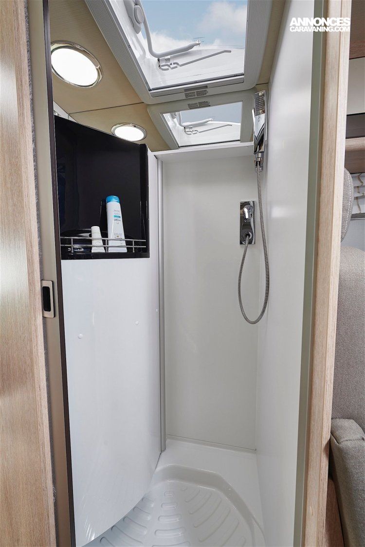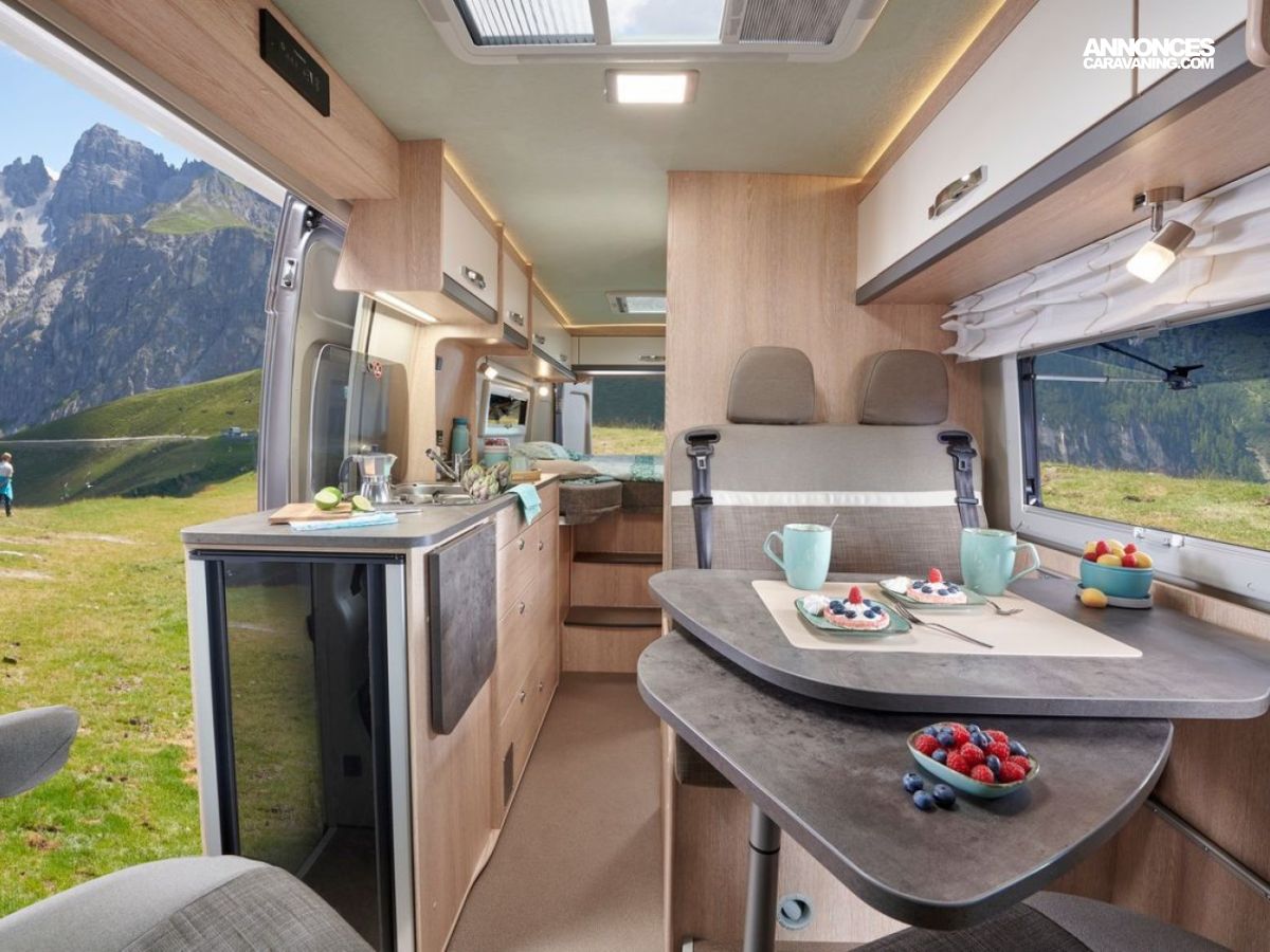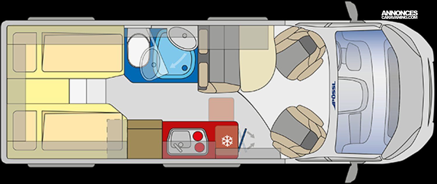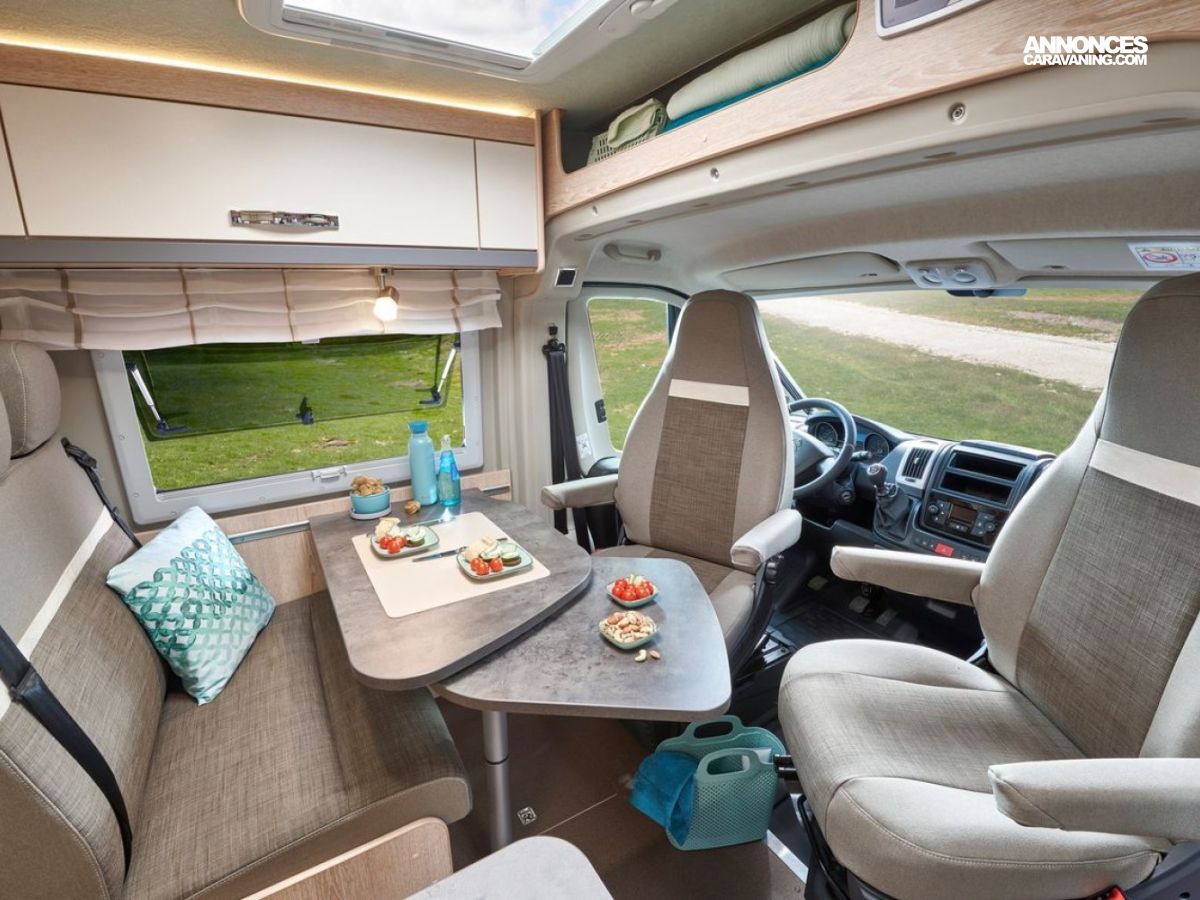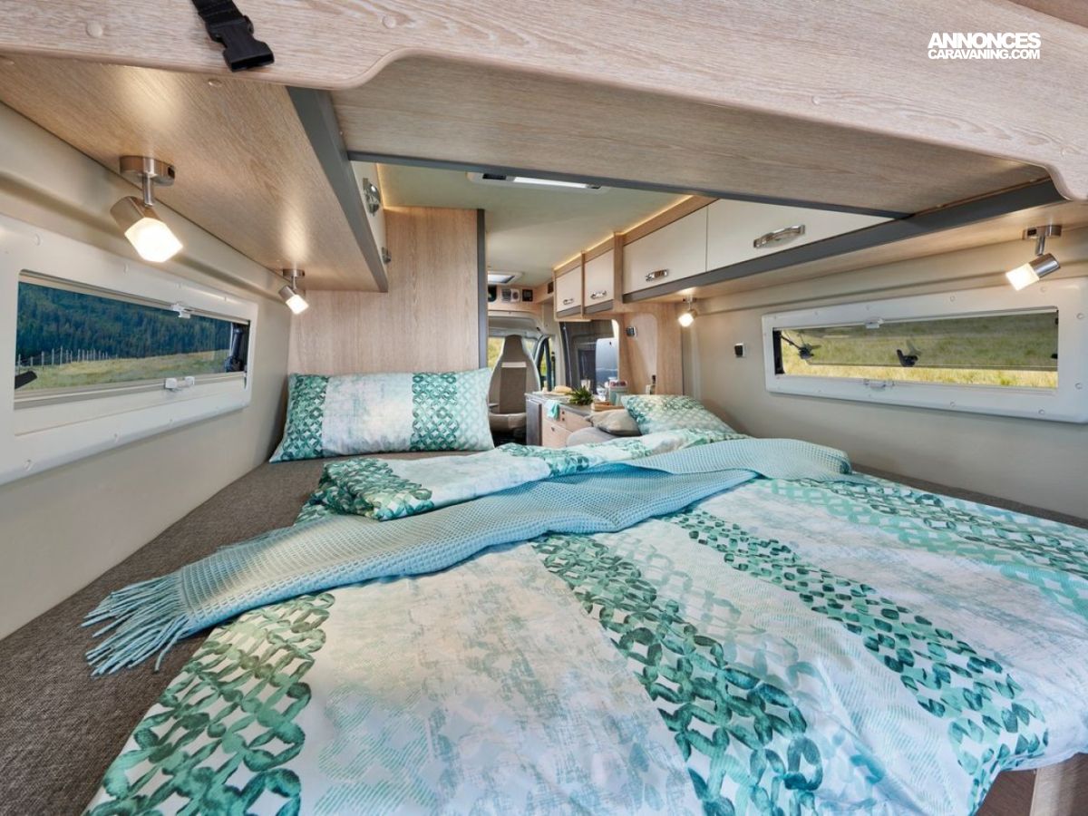 Sa dinette agréable et lumineuse pour une ambiance conviviale. Sa cuisine latérale pratique et fonctionnelle est équipée d’un réchaud 2 feux, évier et plan de travail rabattable. En face, une salle d'eau avec WC, lavabo, et une douche spacieuse. A l’arrière, ce sont des lits jumeaux, pour des nuits confortables et agréables, et plus d’espace. Sans oublier ses nombreux rangements astucieux !