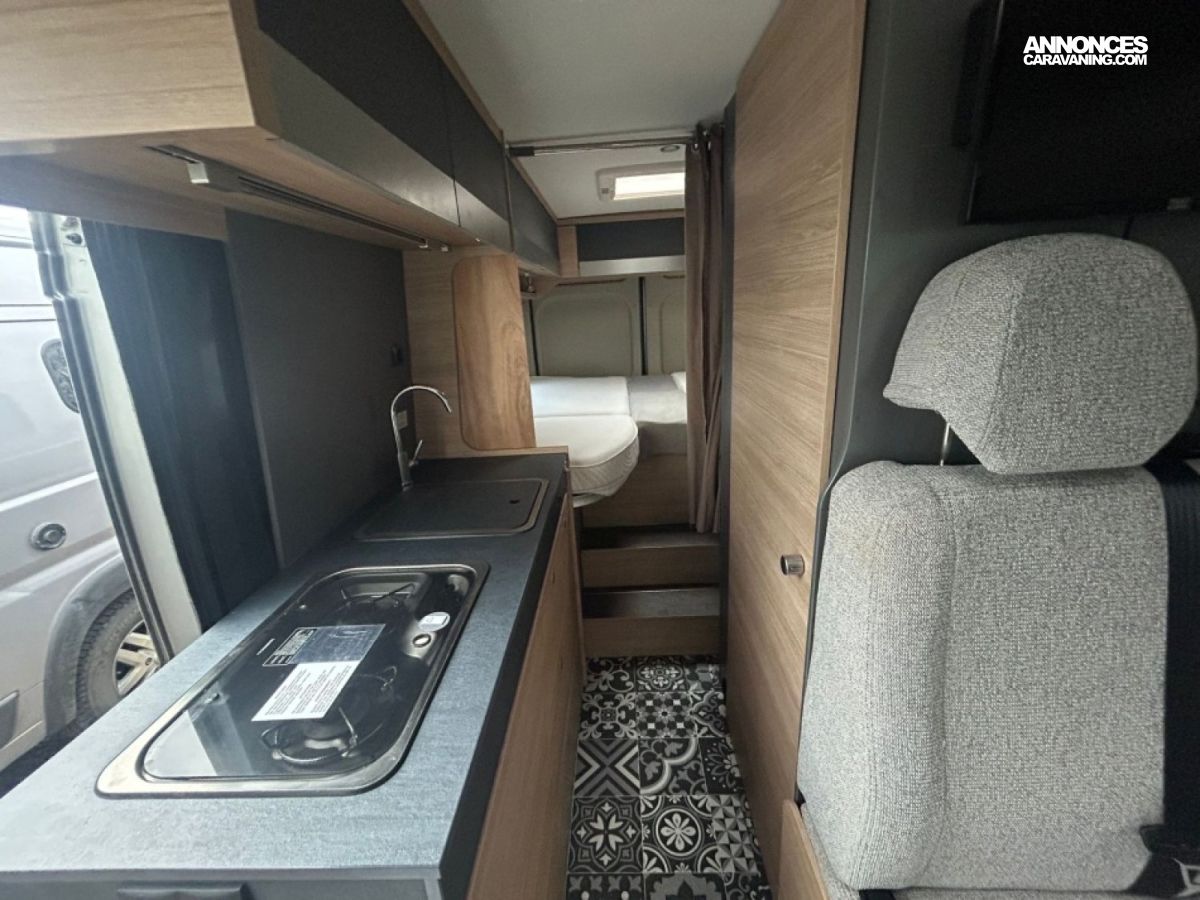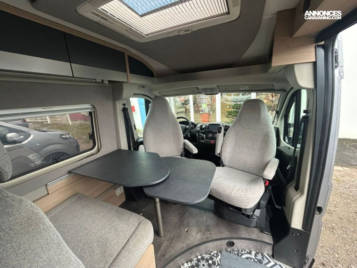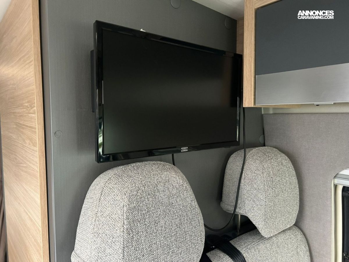 Fermeture porte coulissante latérale avec assistance électrique Softlock - Large marchepied électrique avec avertisseur sonore - moustiquaire de porte coulissante - Isolation performante - 2 trappes de rangement dans le plancher au niveau de la dinette - Mobilier de qualité - Réfrigérateur à absorption - Chauffage Truma avec chauffe-eau - Lit arrière empilable permettant d’agrandir le volume de la soute