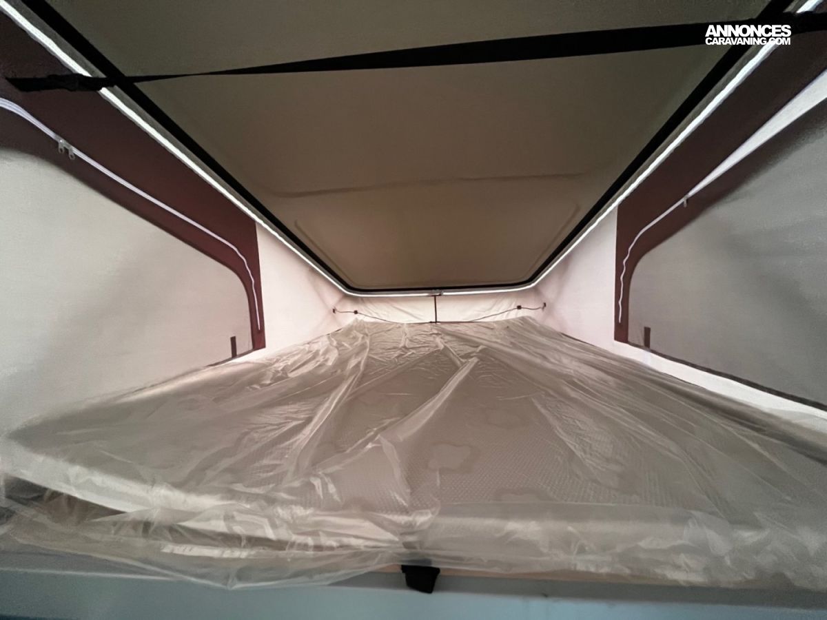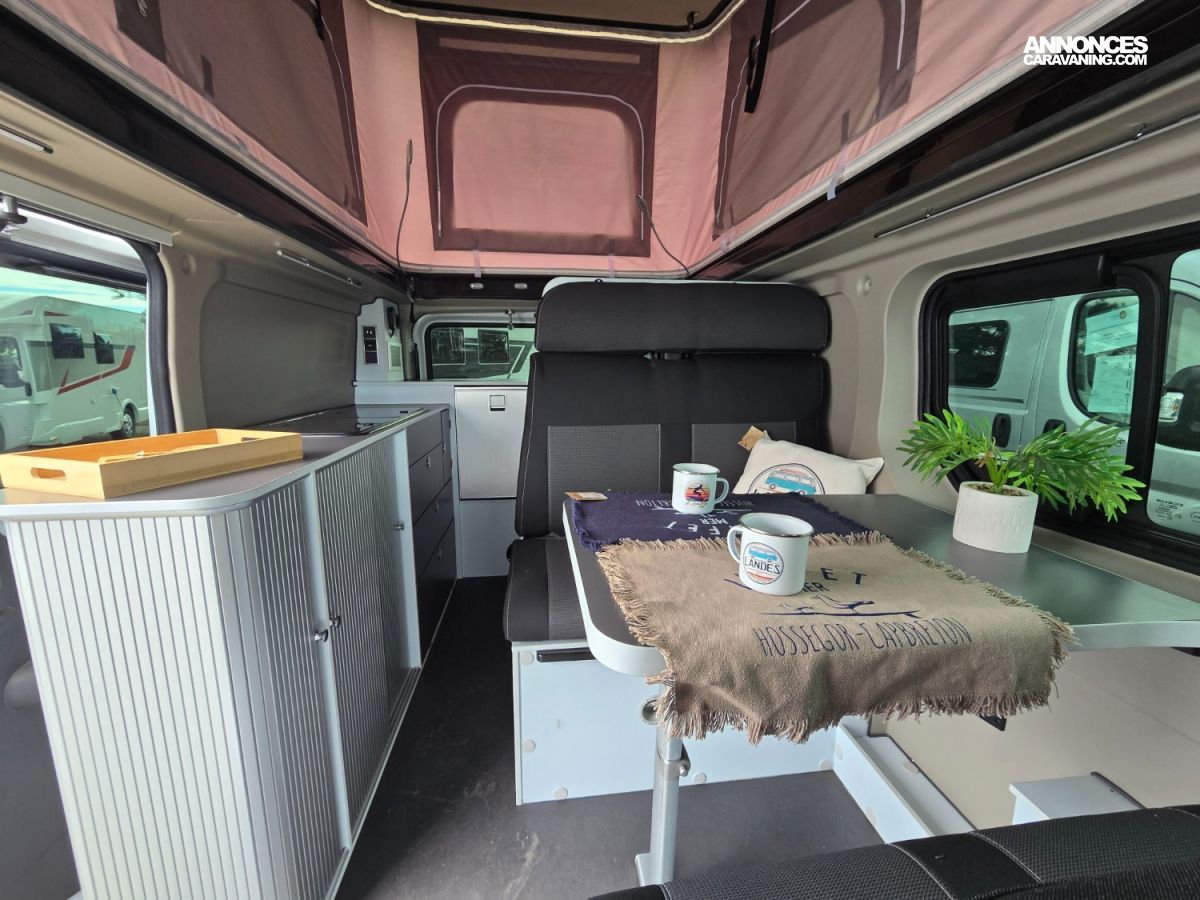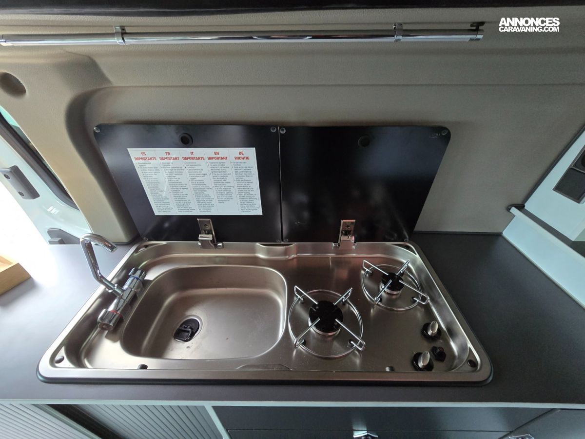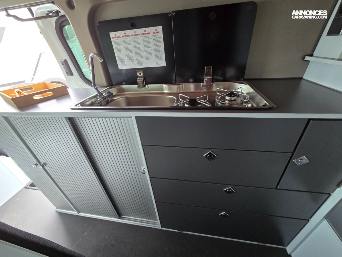 Comprenant un salon double banquette transformable en couchage pour 2 personnes + le toit relevable pour 2 personnes . Un côté cuisine très bien aménagée avec 2 feux de cuisson, un évier et de nombreux rangements.
