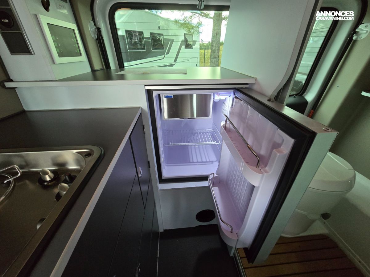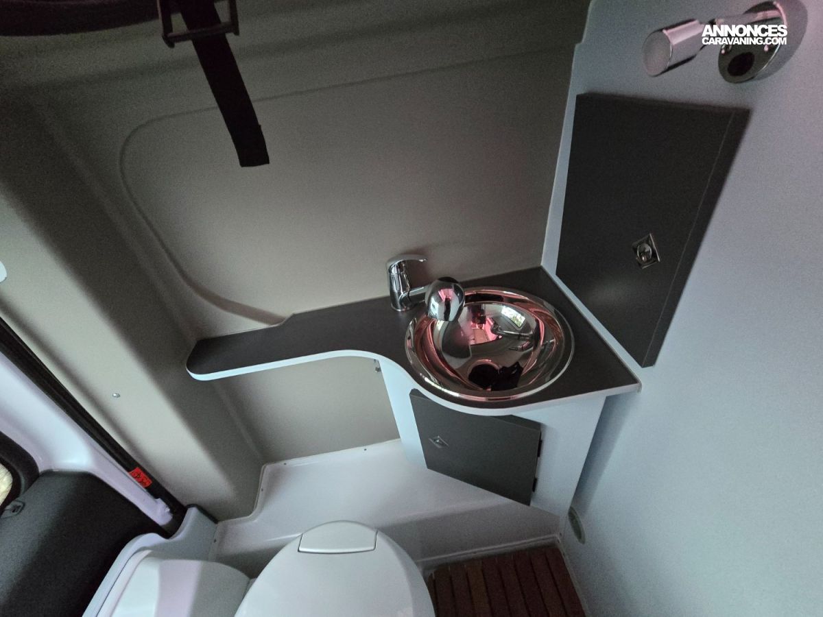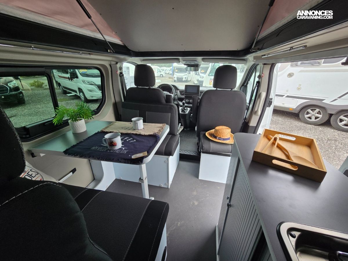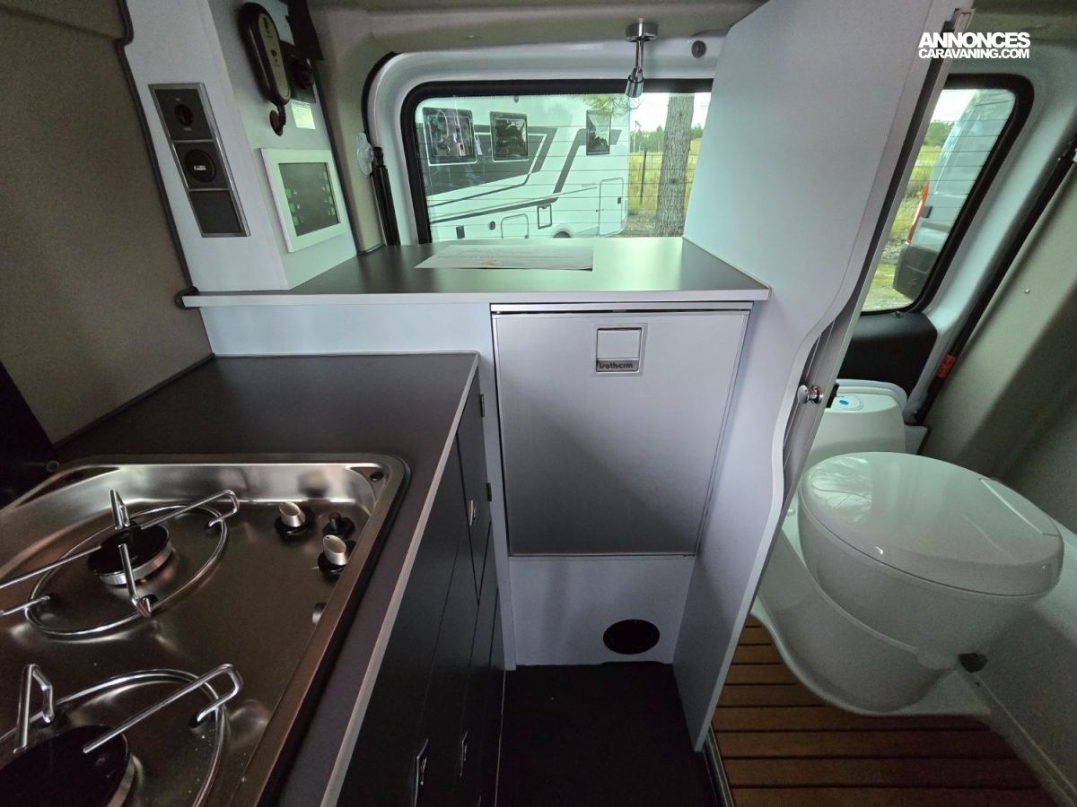 Comprenant un salon double banquette transformable en couchage pour 2 personnes + le toit relevable pour 2 personnes . Un côté cuisine très bien aménagée avec 2 feux de cuisson, un évier et de nombreux rangements.