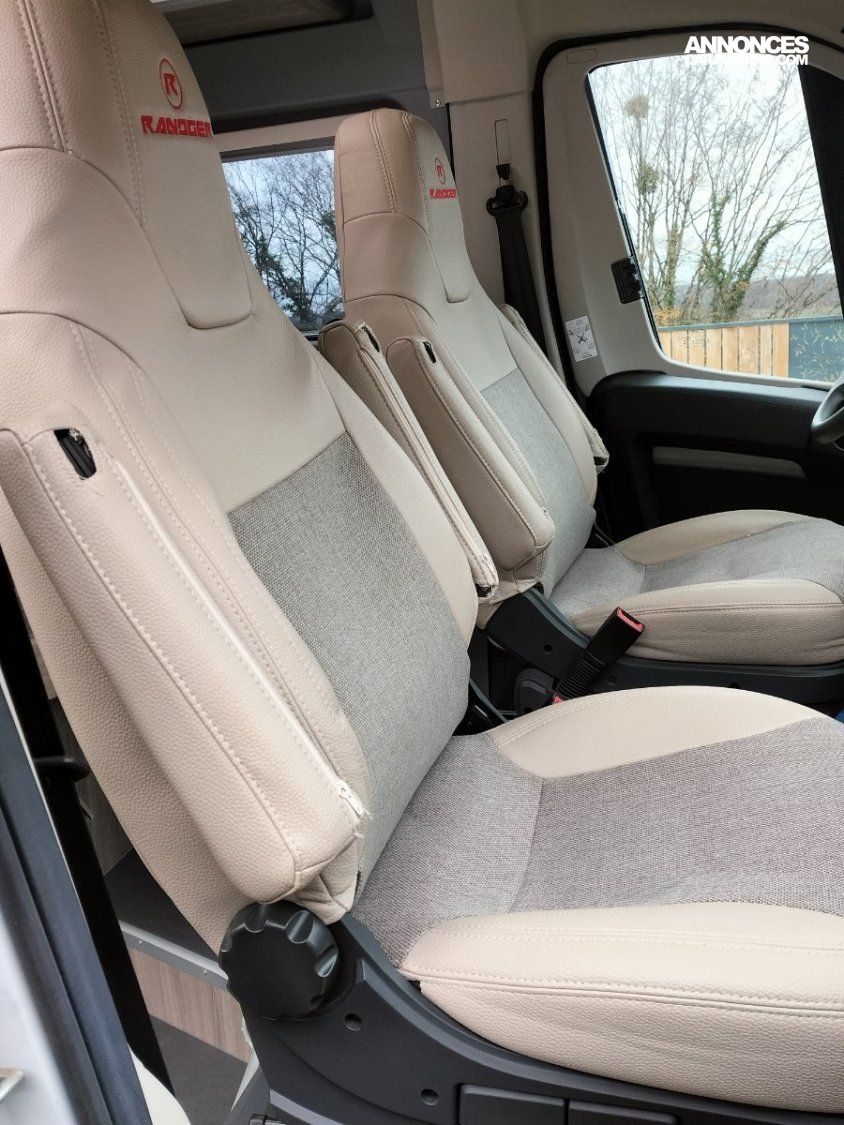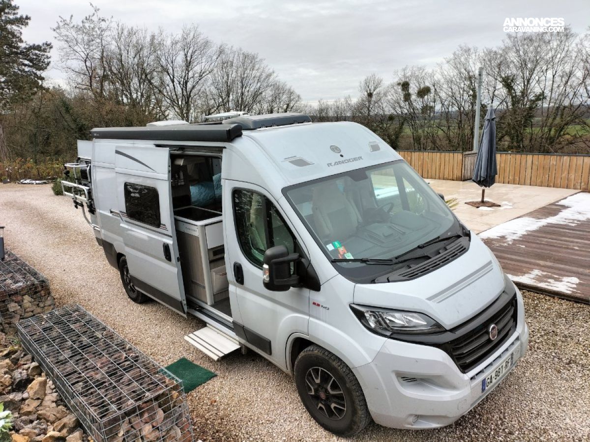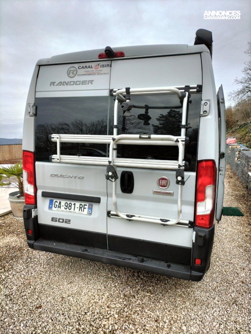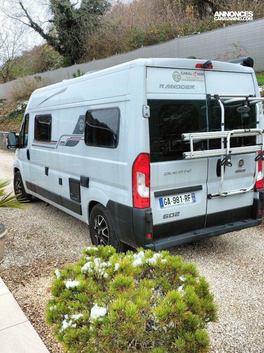 RANDGER 602 2,3l 140cv sur porteur fiat Ducato, en parfait état, boîte manuelle 6 rapports, peinture métallisée, grise (Campo volo), 4 places carte grise 3 places couchage, ptac 3500kg, dimensions L5,99xl2,05xh2,66, isolation plancher et parois, prises USB, climatisation cabine, télévision avec parabole auto, pack connect : radio/GPS/caméra de recul, pack loisirs: grand store extérieur/ porte vélo/ panneau solaire, régulateur et limiteur de vitesse, éclairage leds exter et Inter, moustiquaire porte coulissante, stores occultants et moustiquaires sur baies vitrées cellule, kit brise soleil pare brise avt et vitrages portes arrière, combiné chauffage et eau chaude sanitaire Truma diesel, cuisine gaz 2 bouteilles twin, baies extérieures affleurantes, sièges pivotants avec accoudoirs, marchepied électrique, table avec système d'accrochage rapide extérieur sous auvent, grand réfrigérateur 138l à compression, salle de bain avec compartiment douche à séparation en dur (c'est un plus) et lanterneau d'aération, douchette à l'arrière du fourgon, grande soute, vraie penderie, très bon couchage transversal arrière sur sommier à lattes de 1940x1485, plus lit banquette avant de 1810x1090, tapis de sol cabine, capacité eau propre 100l capacité eau usée 100l. Véhicule équipé de 4 pneus Michelin renforcés sur jantes Alu 16p, plus kit 4 roues hiver avec pneus Michelin agilis alpin 225/75 R16 neufs en sus valeur 1000€, véritable roue de secours. Véhicule toujours à l'abri, l'entretien est fait à Dole chez le concessionnaire Fiat agréé, le contrôle technique est valable jusqu'en 2017. Le propriétaire est un particulier et le véhicule est visible à byans sur doubs dans le 25. Professionnels s'abstenir svp.