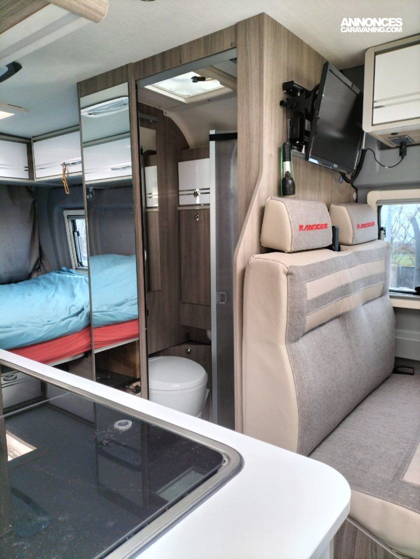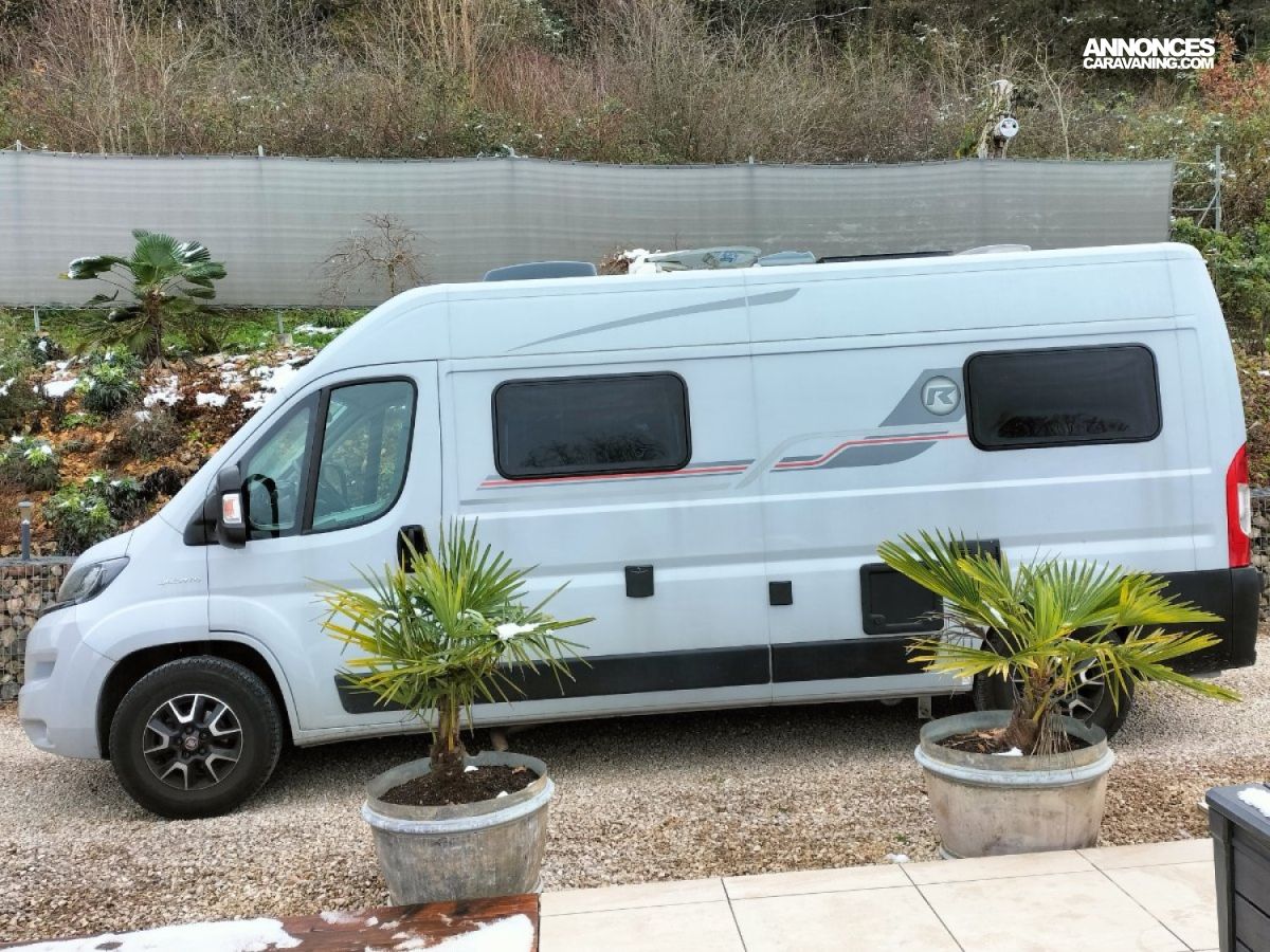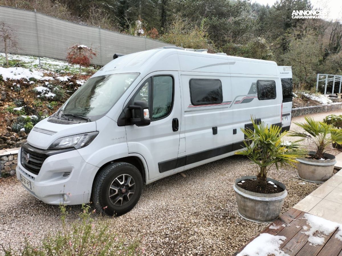 RANDGER 602 2,3l 140cv sur porteur fiat Ducato, en parfait état, boîte manuelle 6 rapports, peinture métallisée, grise (Campo volo), 4 places carte grise 3 places couchage, ptac 3500kg, dimensions L5,99xl2,05xh2,66, isolation plancher et parois, prises USB, climatisation cabine, télévision avec parabole auto, pack connect : radio/GPS/caméra de recul, pack loisirs: grand store extérieur/ porte vélo/ panneau solaire, régulateur et limiteur de vitesse, éclairage leds exter et Inter, moustiquaire porte coulissante, stores occultants et moustiquaires sur baies vitrées cellule, kit brise soleil pare brise avt et vitrages portes arrière, combiné chauffage et eau chaude sanitaire Truma diesel, cuisine gaz 2 bouteilles twin, baies extérieures affleurantes, sièges pivotants avec accoudoirs, marchepied électrique, table avec système d'accrochage rapide extérieur sous auvent, grand réfrigérateur 138l à compression, salle de bain avec compartiment douche à séparation en dur (c'est un plus) et lanterneau d'aération, douchette à l'arrière du fourgon, grande soute, vraie penderie, très bon couchage transversal arrière sur sommier à lattes de 1940x1485, plus lit banquette avant de 1810x1090, tapis de sol cabine, capacité eau propre 100l capacité eau usée 100l. Véhicule équipé de 4 pneus Michelin renforcés sur jantes Alu 16p, plus kit 4 roues hiver avec pneus Michelin agilis alpin 225/75 R16 neufs en sus valeur 1000€, véritable roue de secours. Véhicule toujours à l'abri, l'entretien est fait à Dole chez le concessionnaire Fiat agréé, le contrôle technique est valable jusqu'en 2017. Le propriétaire est un particulier et le véhicule est visible à byans sur doubs dans le 25. Professionnels s'abstenir svp.