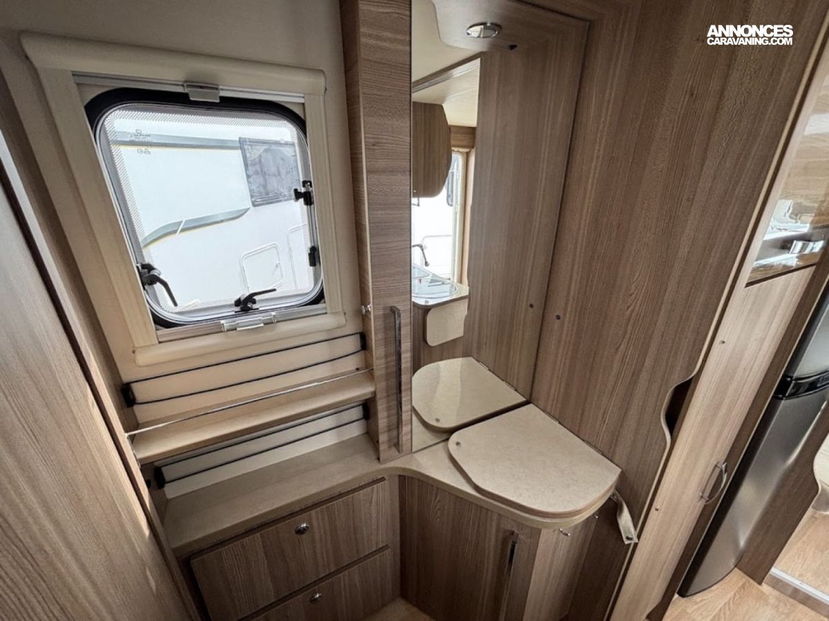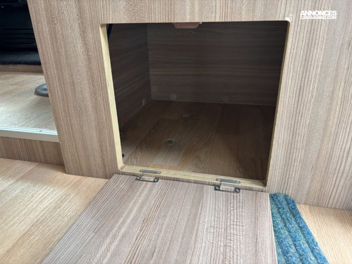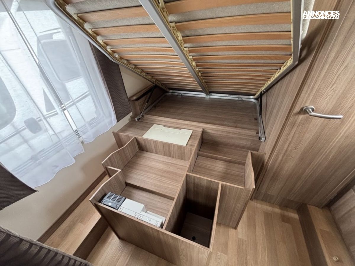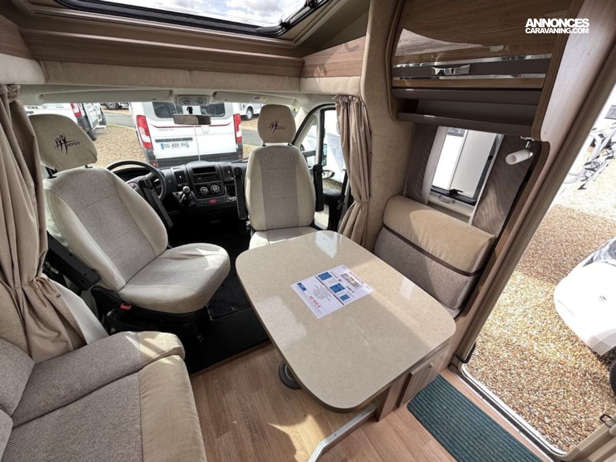 Bac de douche, Lit central, Lit dînette avant, Salon avant banquettes face à face, Salon avant sièges pivotants, Soute, WC Cassette.