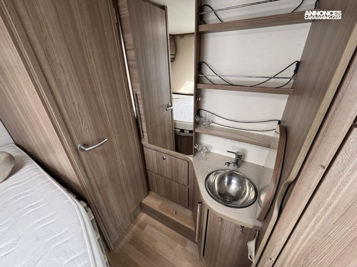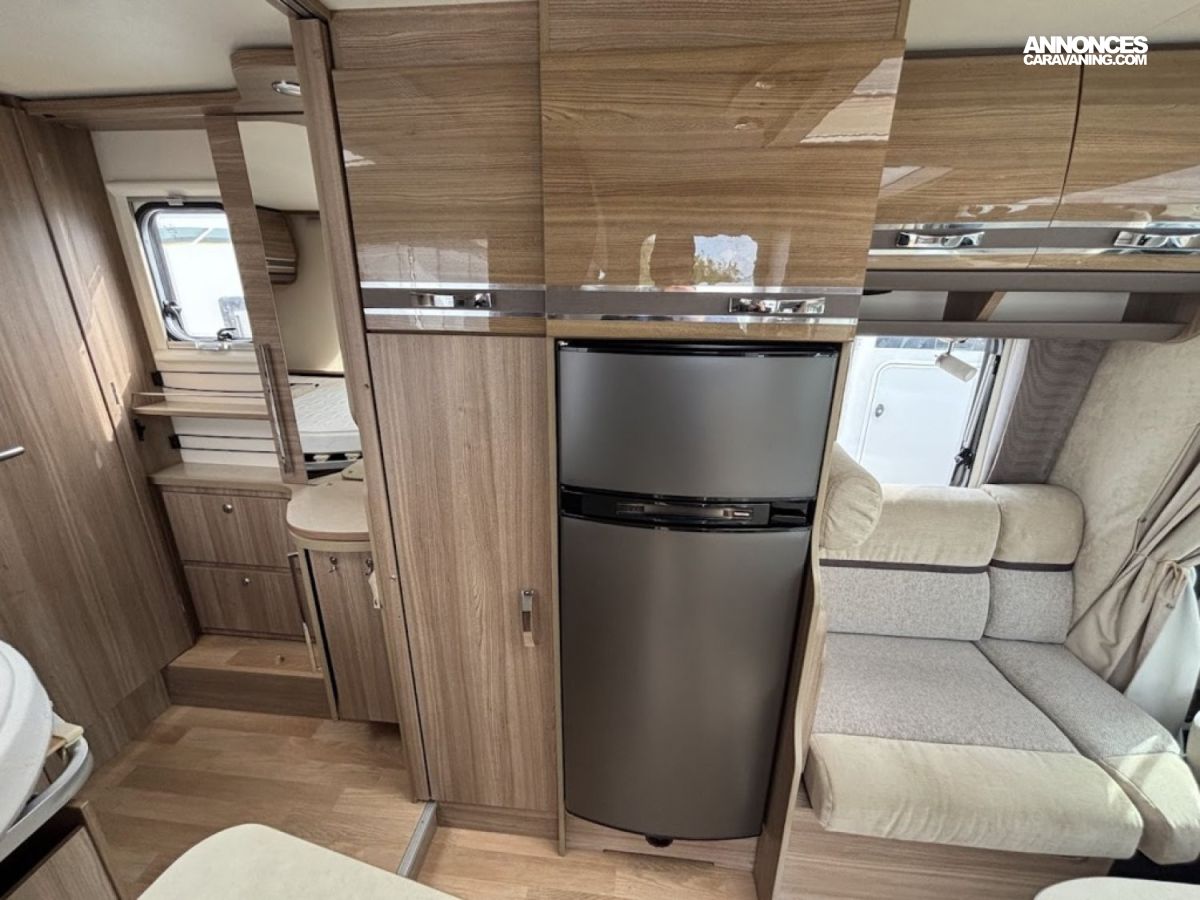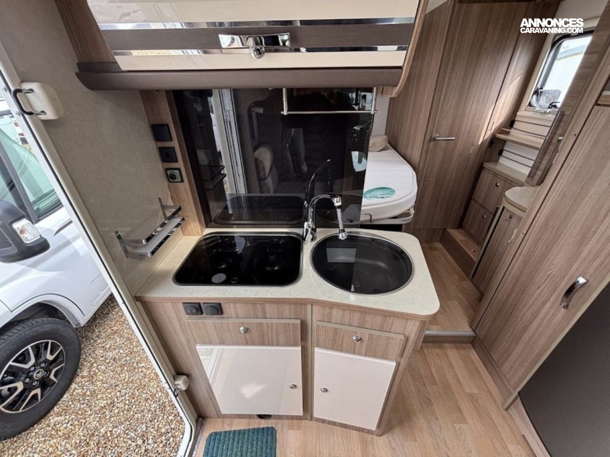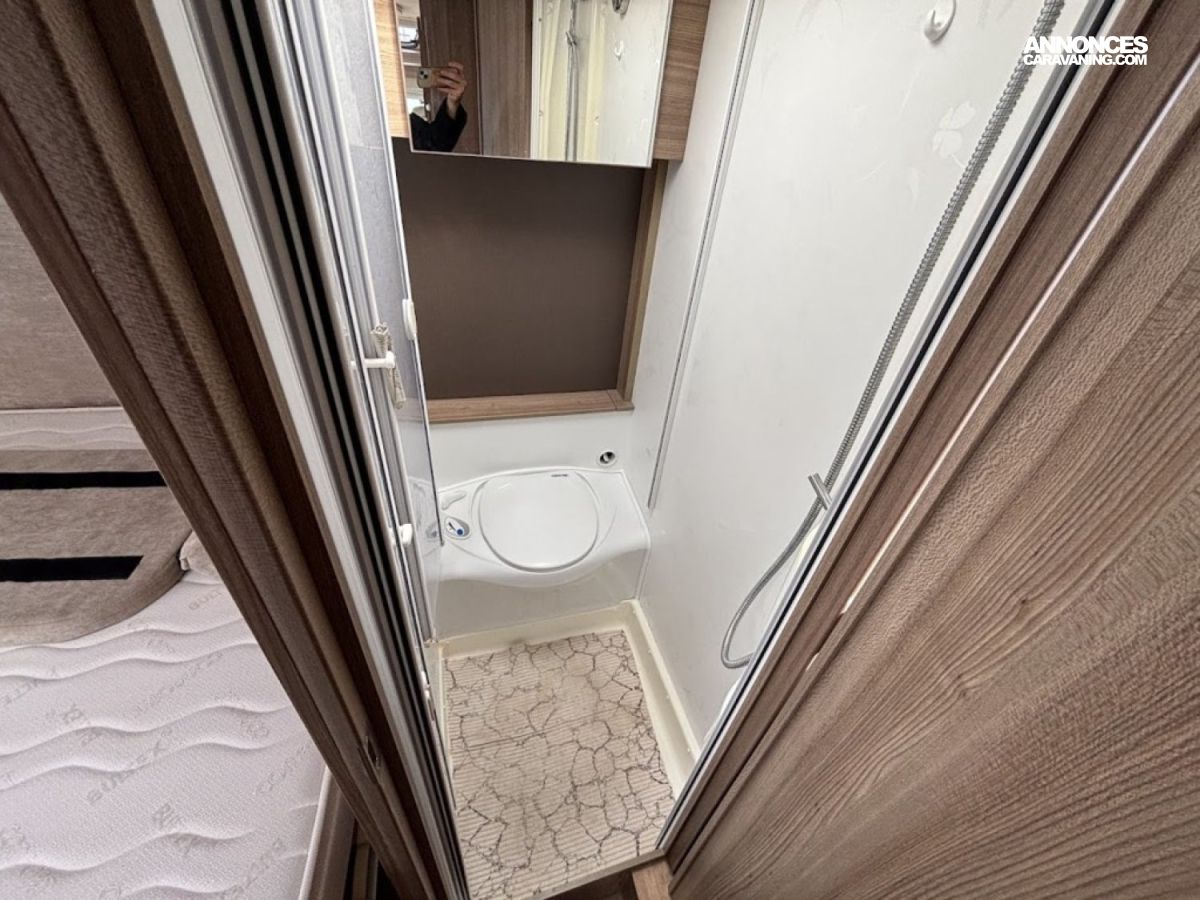 Bac de douche, Lit central, Lit dînette avant, Salon avant banquettes face à face, Salon avant sièges pivotants, Soute, WC Cassette.