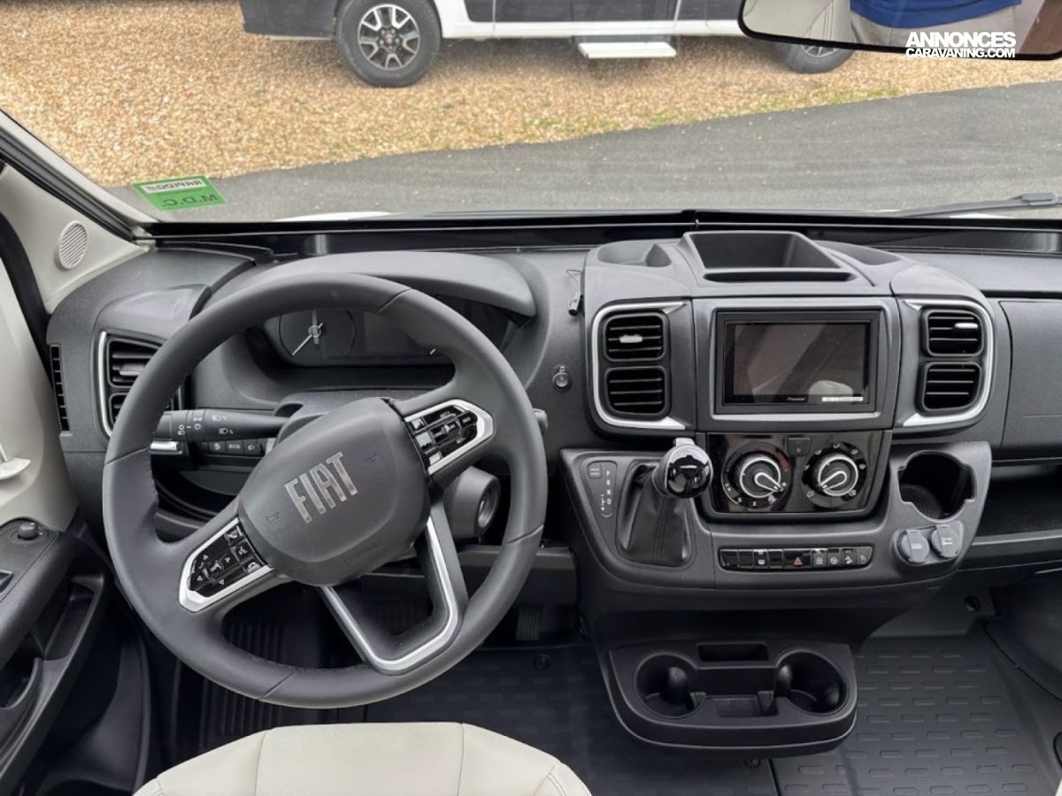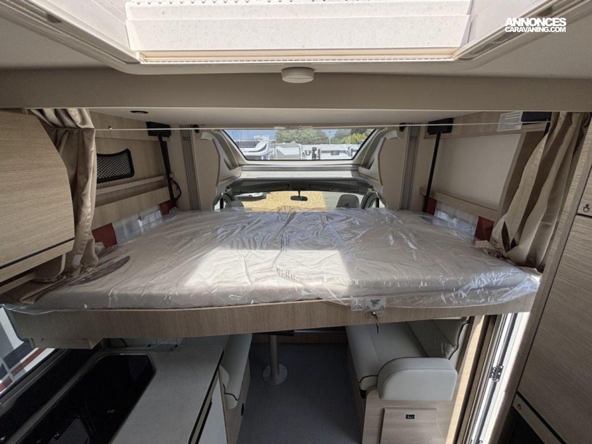 Cuisine en L, Douche indépendante, Lit central, lit pavillon, Salon avant banquettes face à face, Salon avant sièges pivotants, Soute réglable en hauteur, WC Cassette.