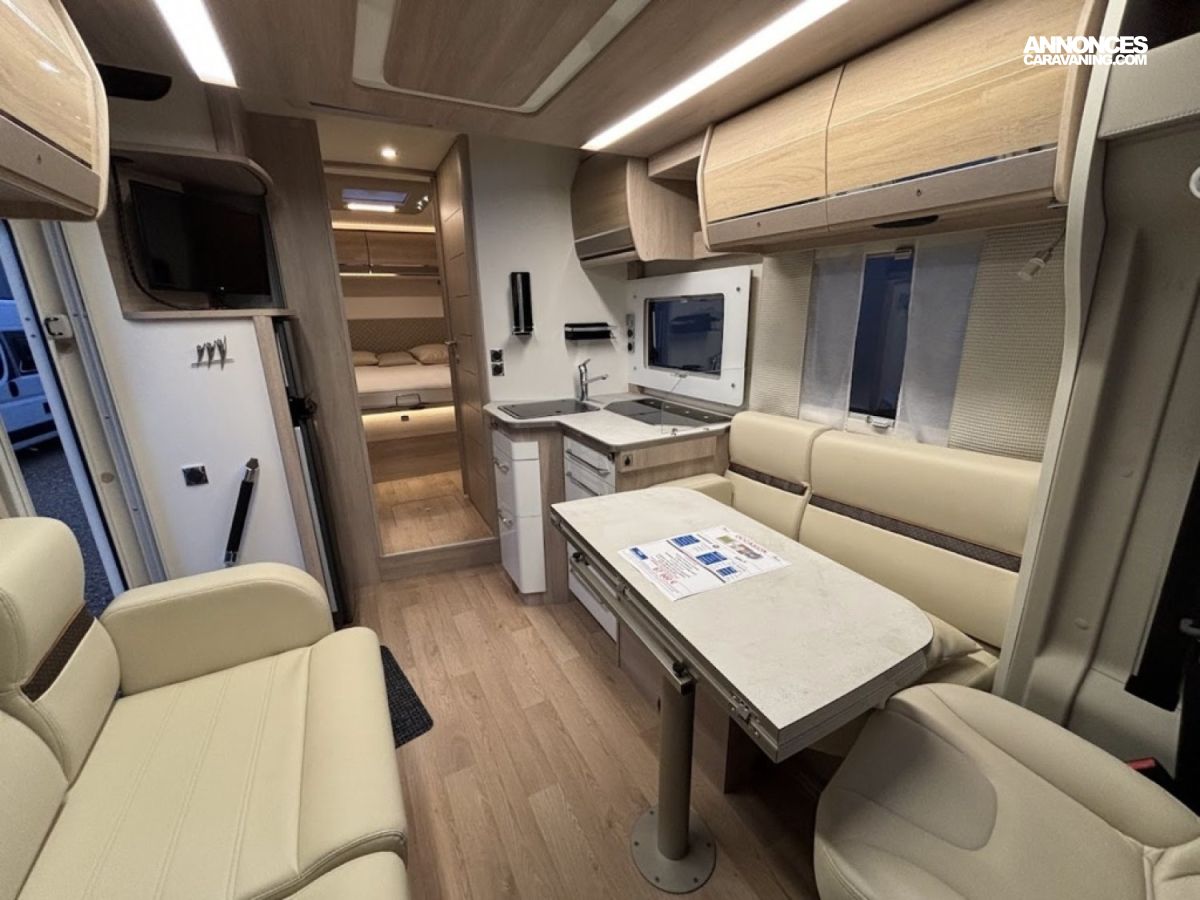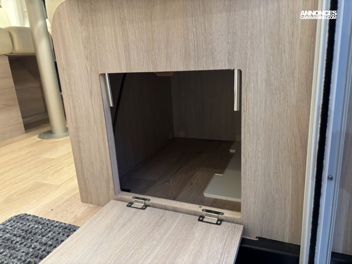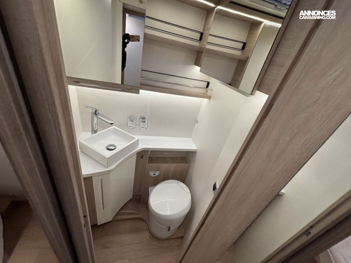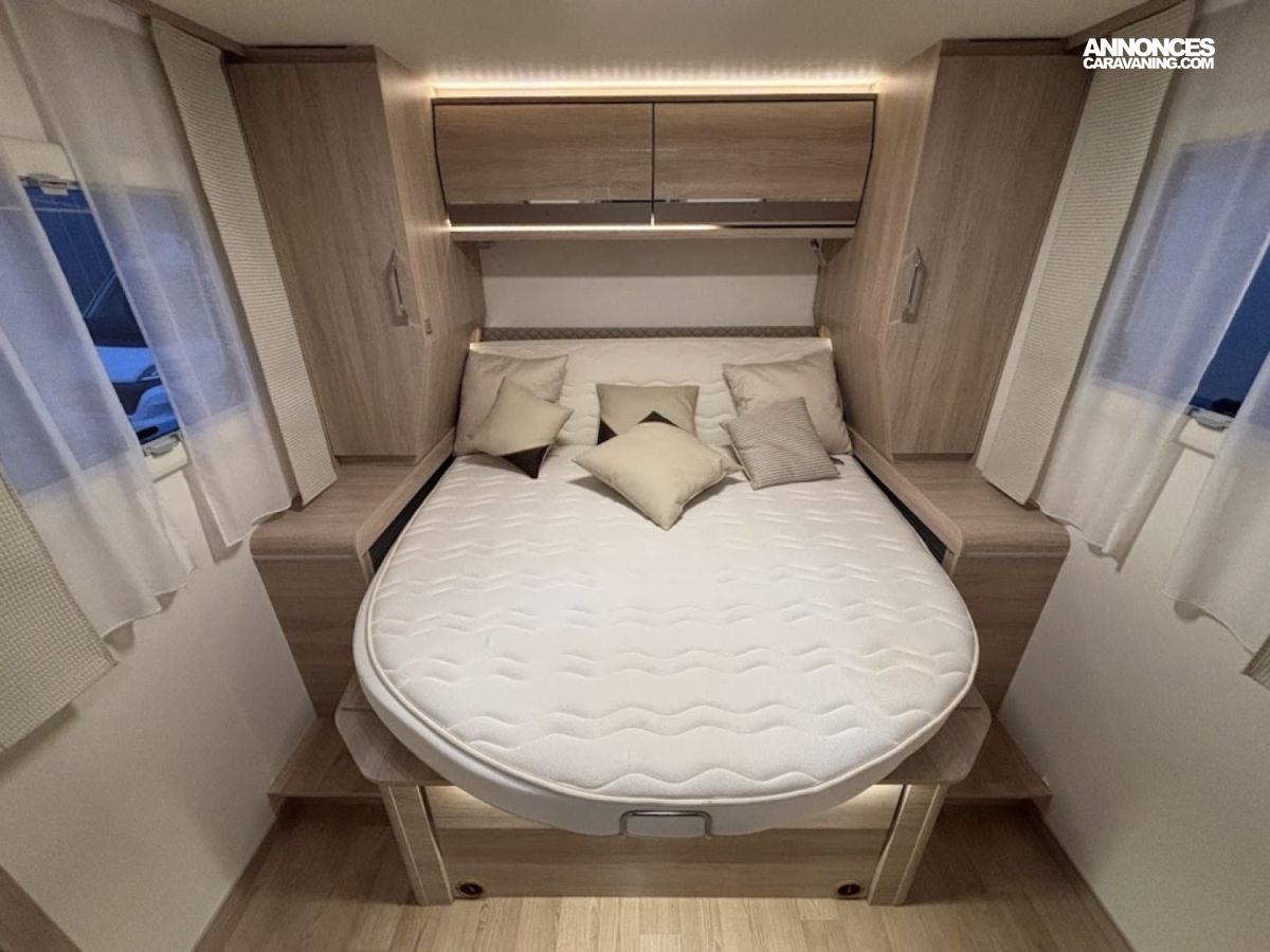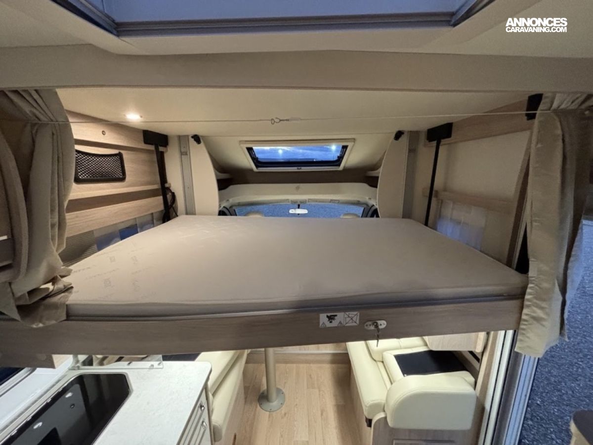 Cuisine en L, Douche indépendante, Lit central, lit pavillon, Salon avant banquettes face à face, Salon avant sièges pivotants, Soute réglable en hauteur, WC Cassette.