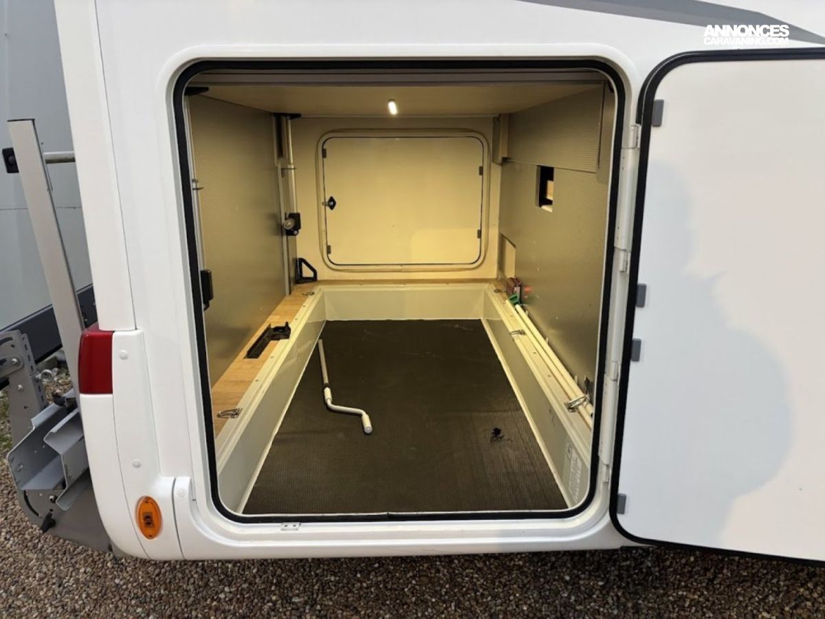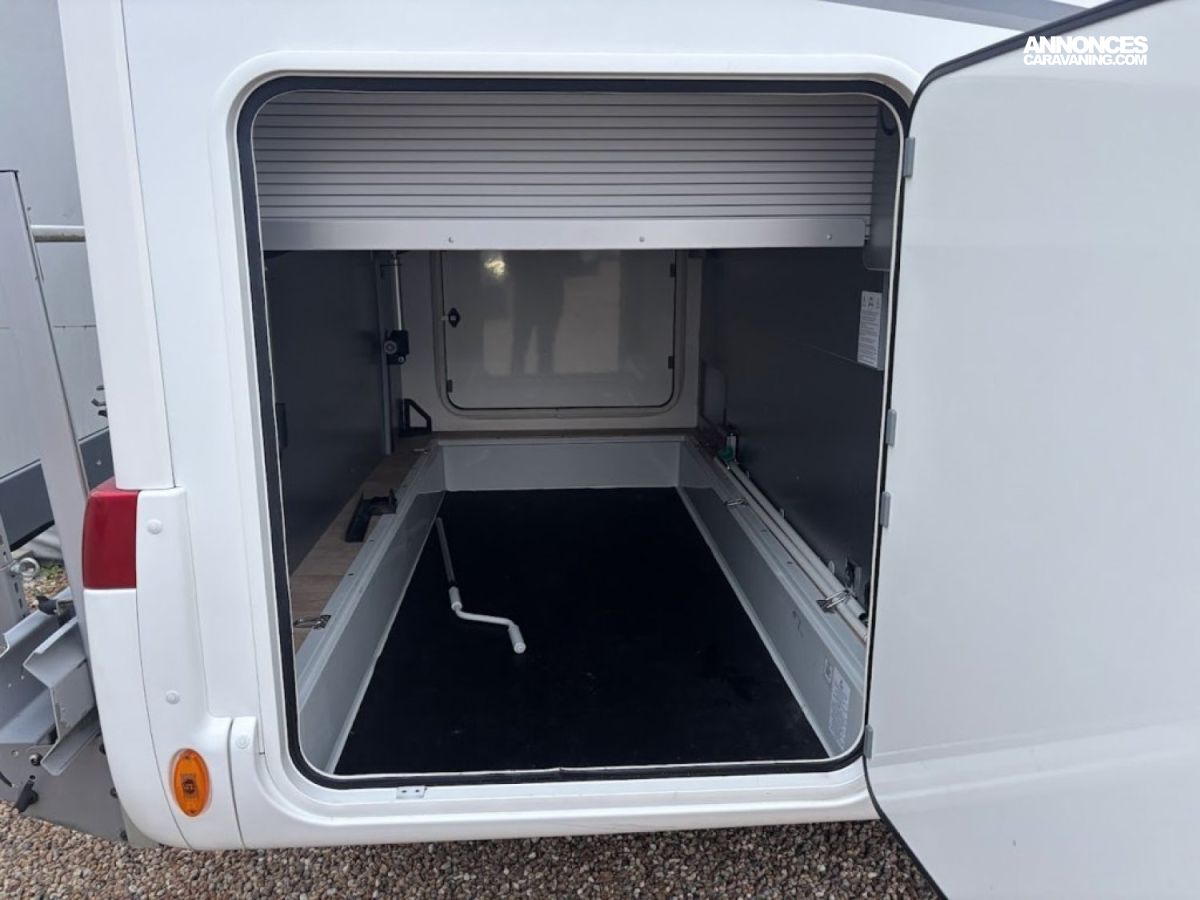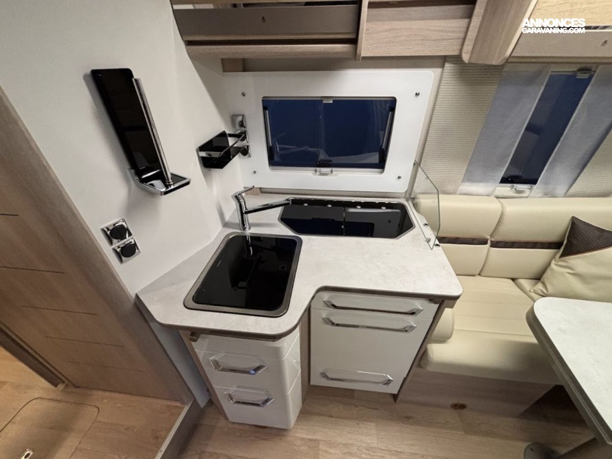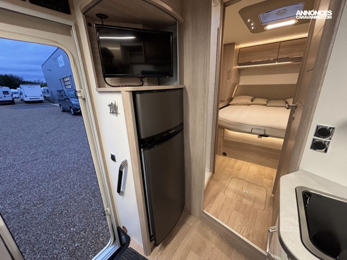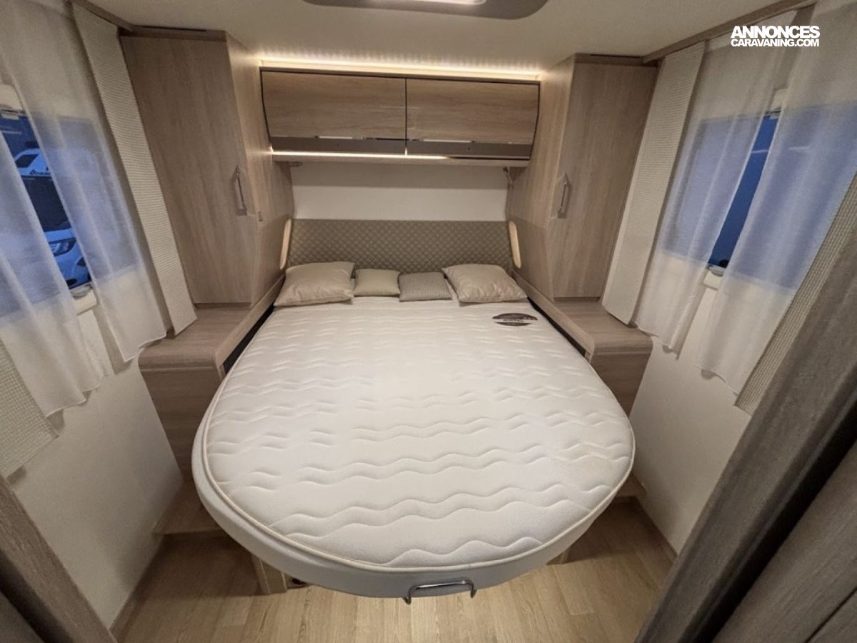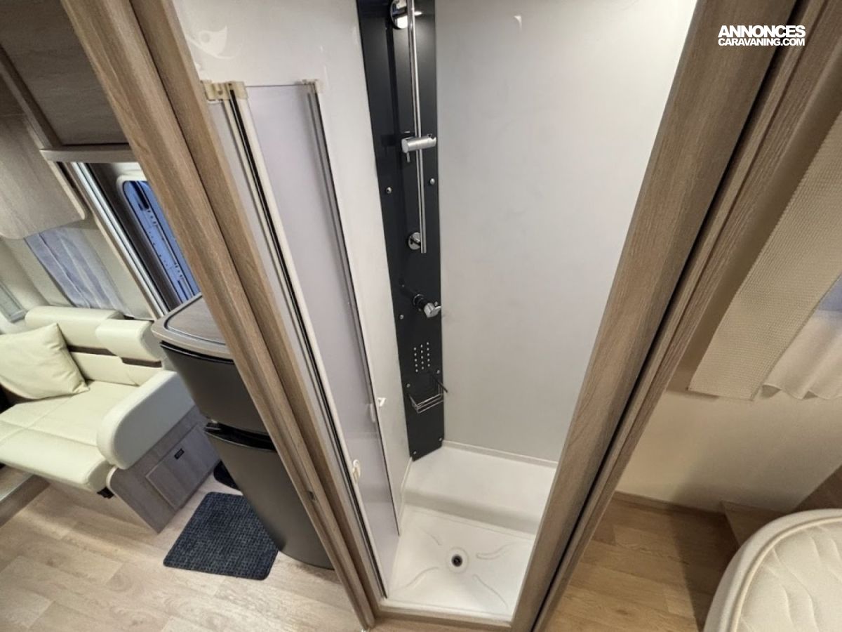 Cuisine en L, Douche indépendante, Lit central, lit pavillon, Salon avant banquettes face à face, Salon avant sièges pivotants, Soute réglable en hauteur, WC Cassette.