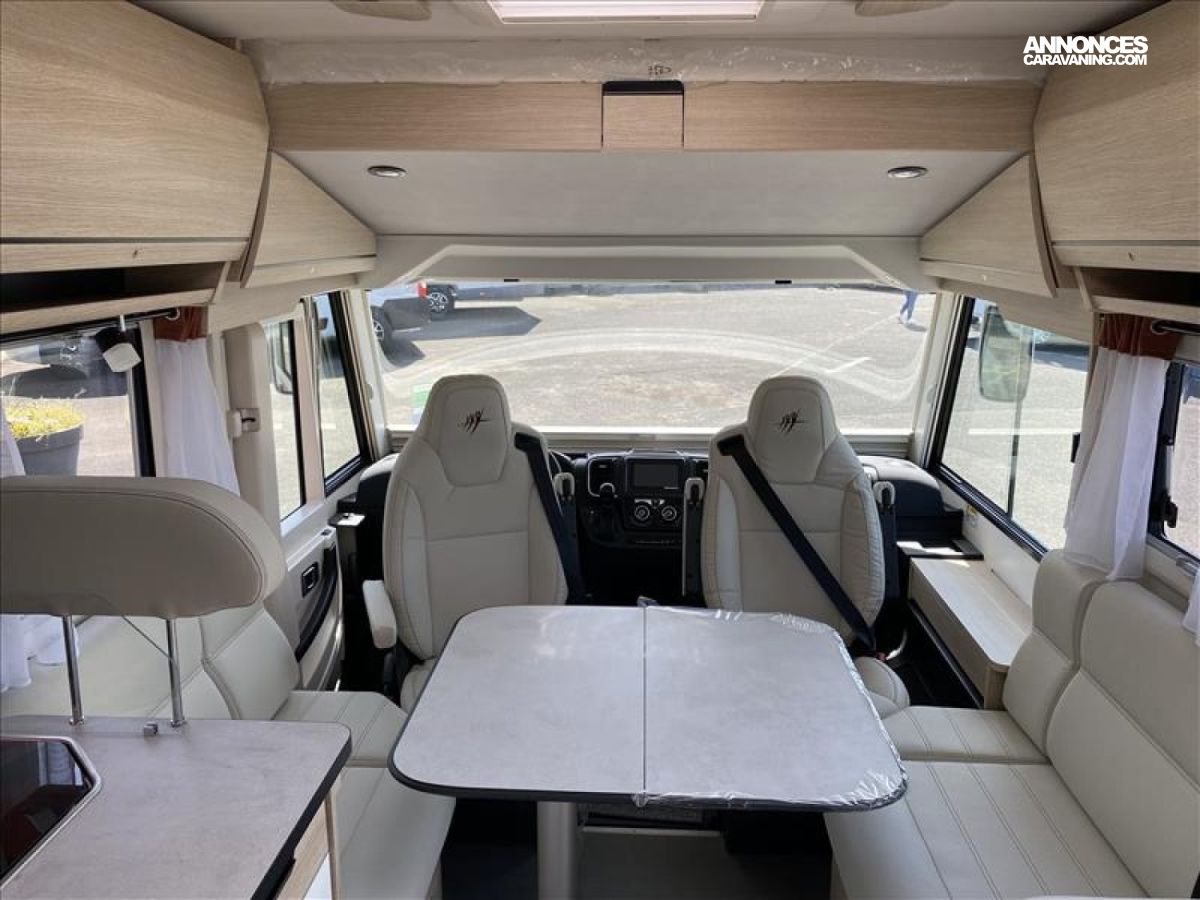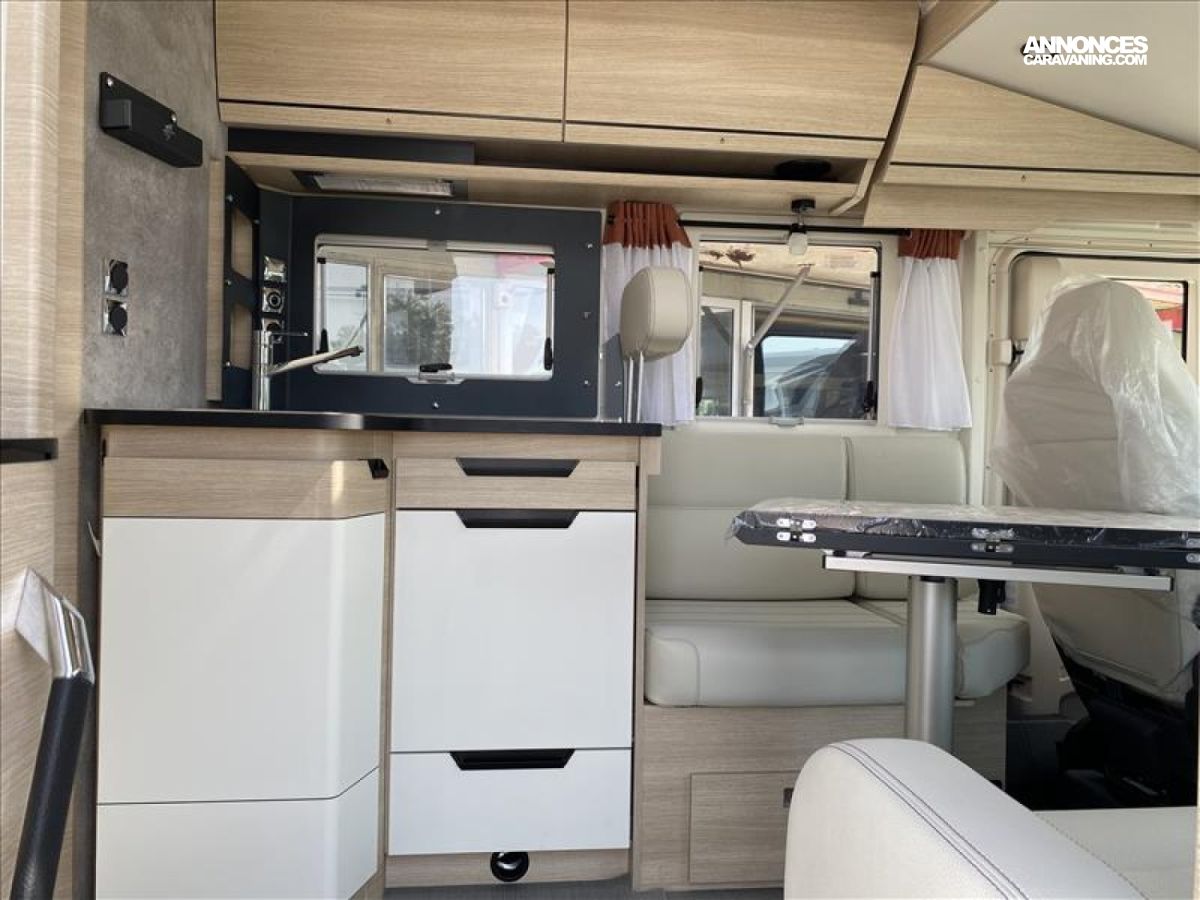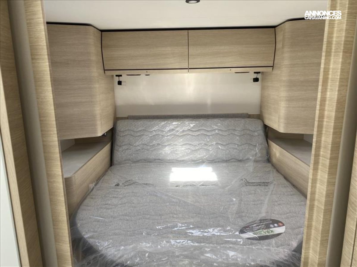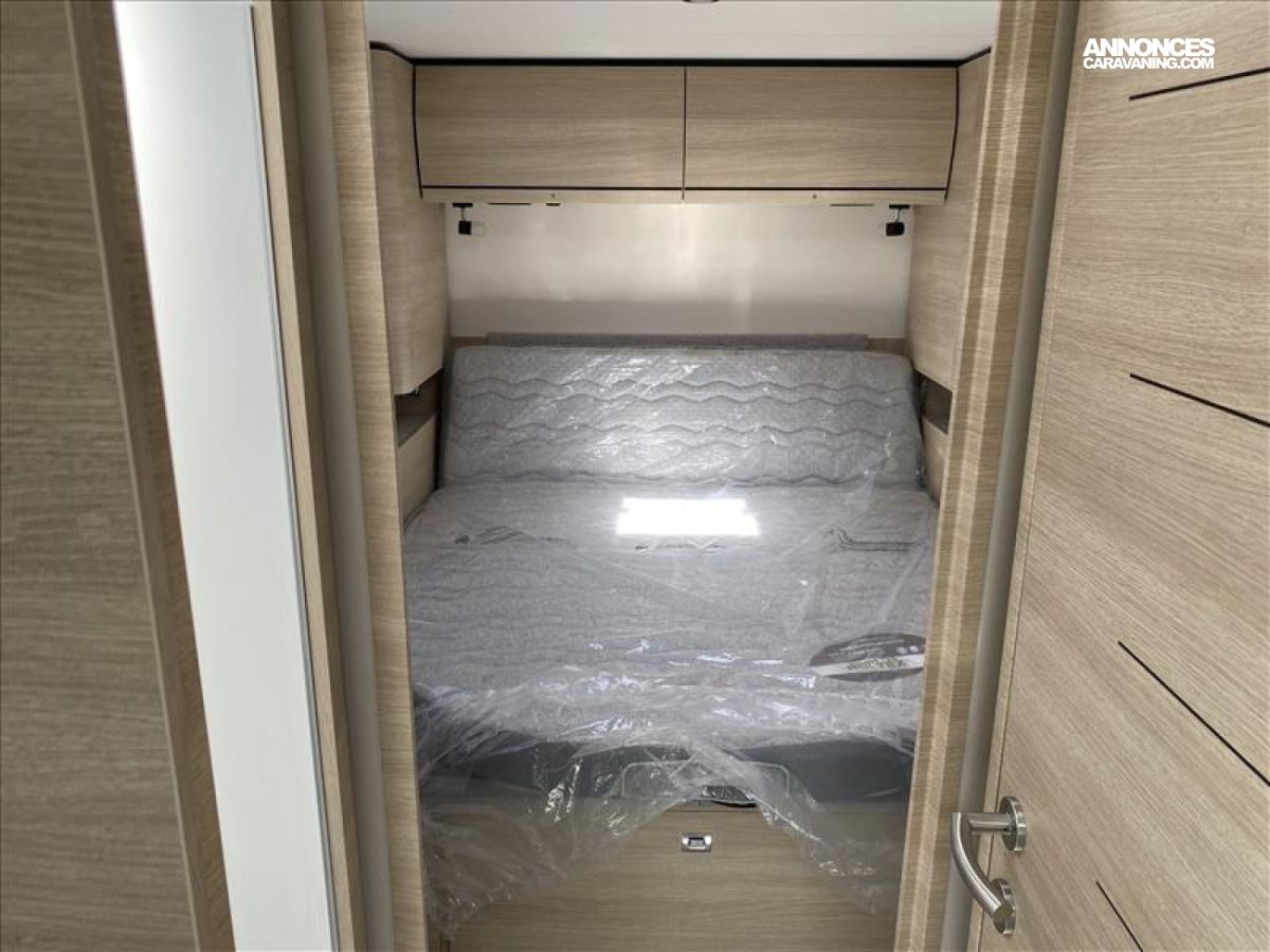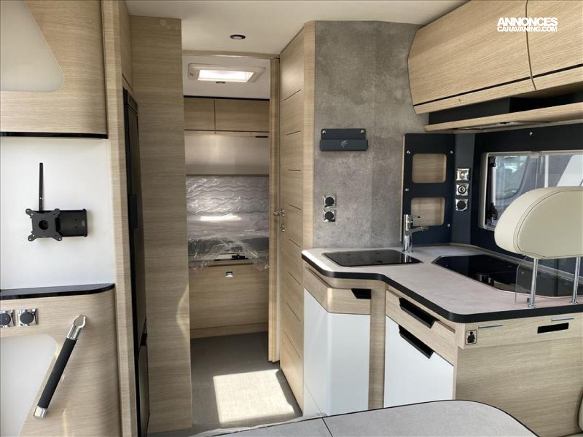 Accès double plancher intérieur/extérieur, Châssis AL-KO suspensions à roues indépendantes, Direction assistée électrique, Double plancher chauffé et éclairé, Hotte cuisine encastrée avec éclairage LED, Soute/garage chauffé, Système anticrash, permet de rouler avec le chauffage gaz, Grand réfrigérateur AES 135 L avec tiroir à bouteilles