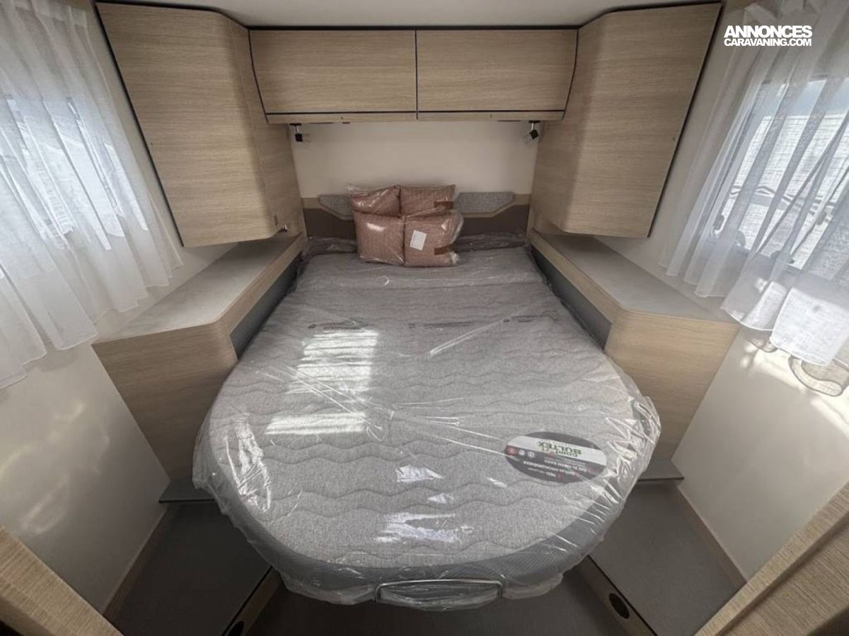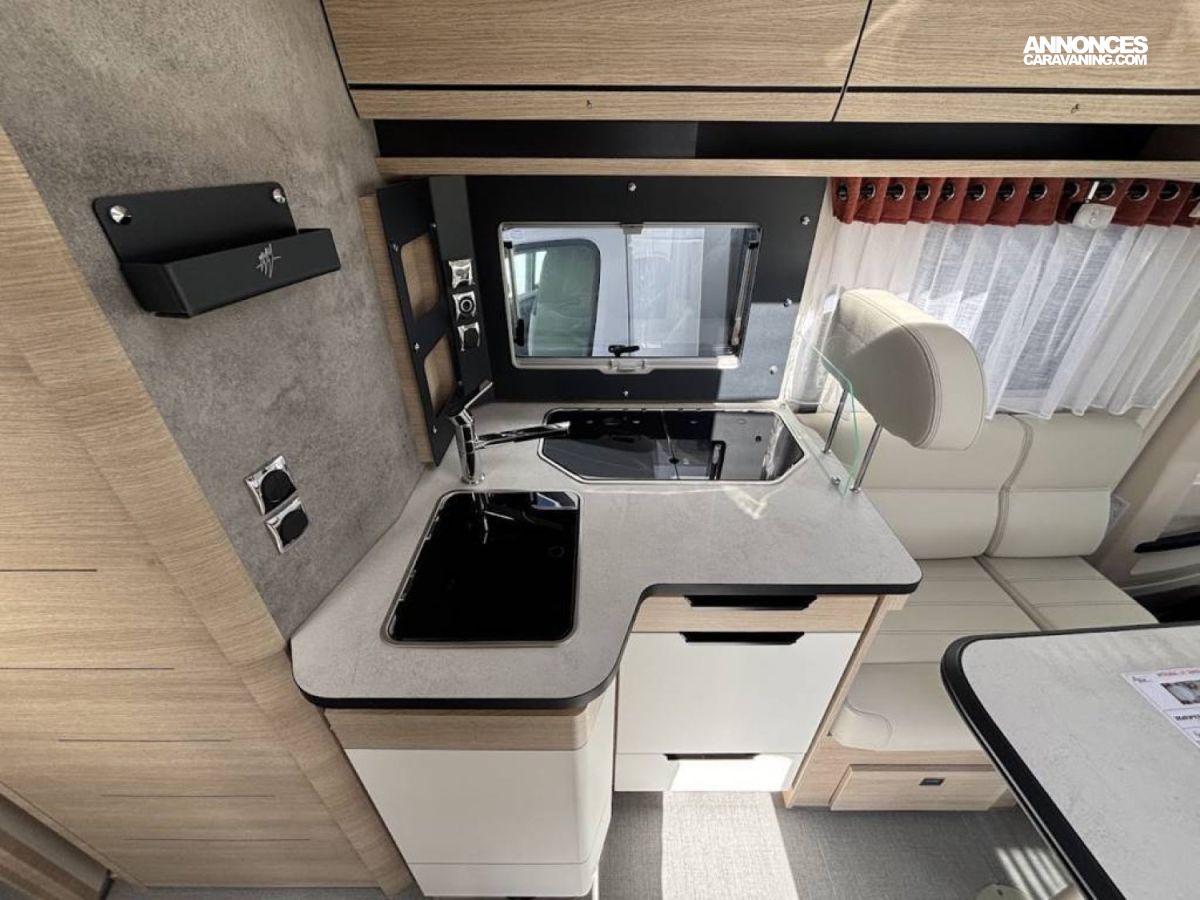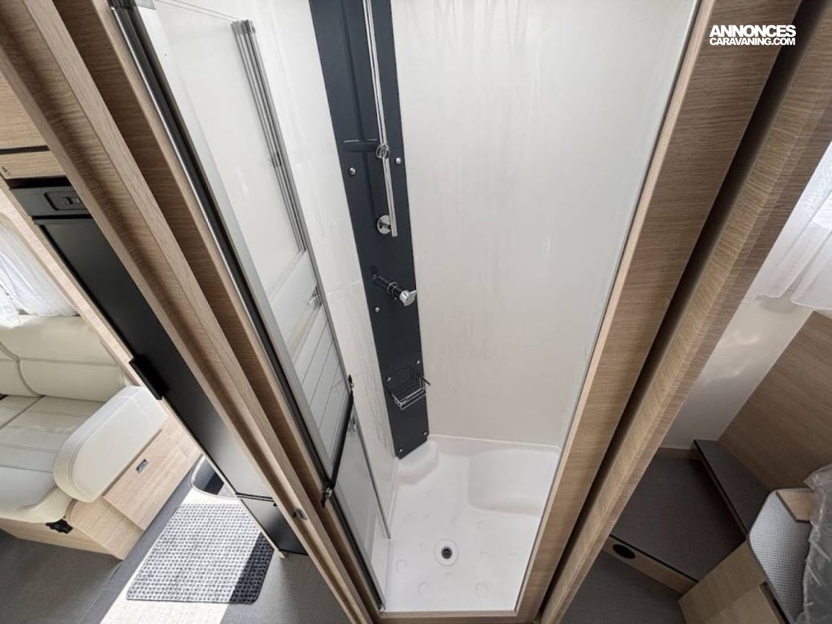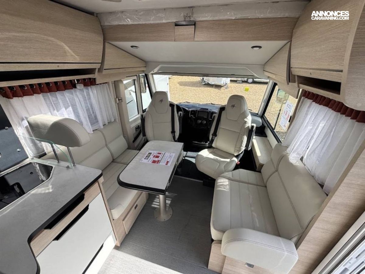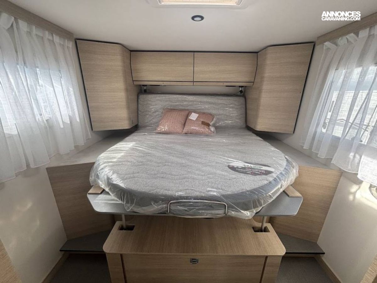 Cuisine en L, Douche indépendante, Lit central, lit pavillon, Salon avant banquettes face à face, Salon avant sièges pivotants, Soute réglable en hauteur, WC Cassette.