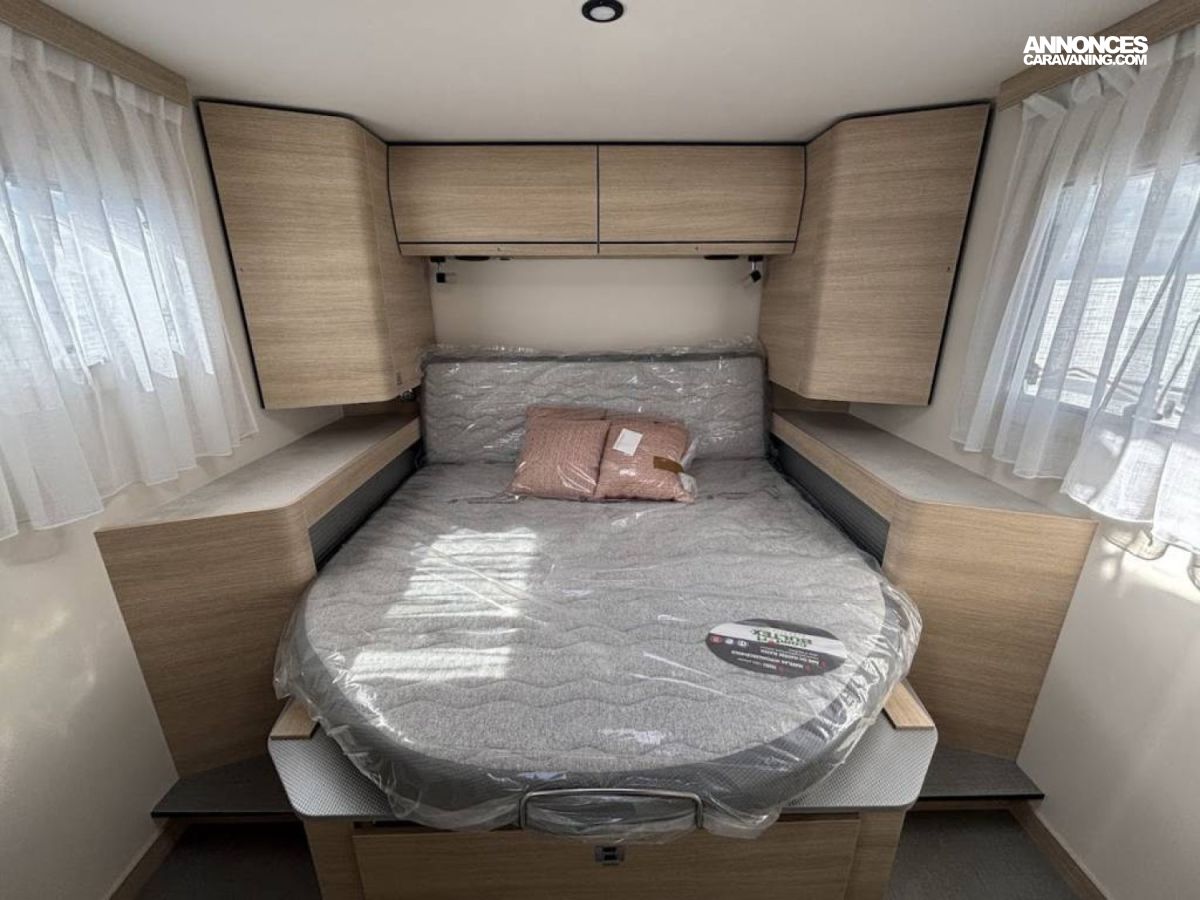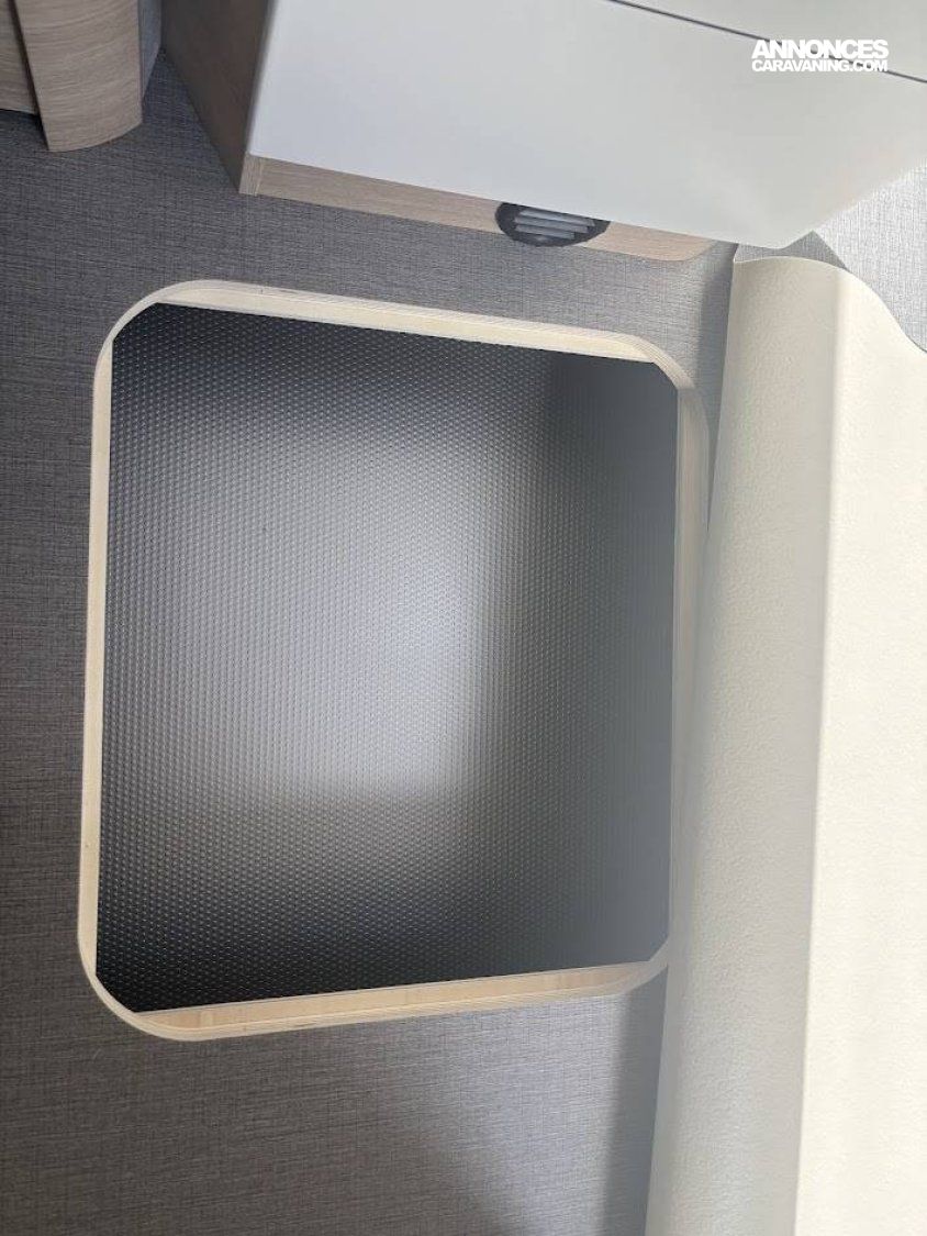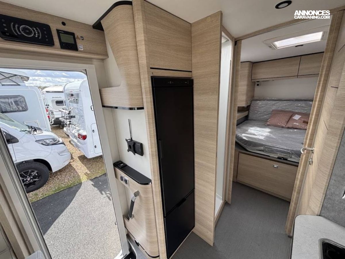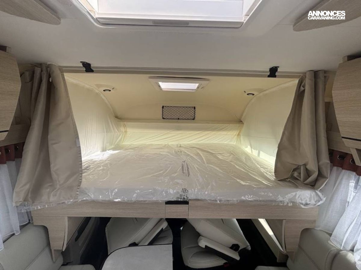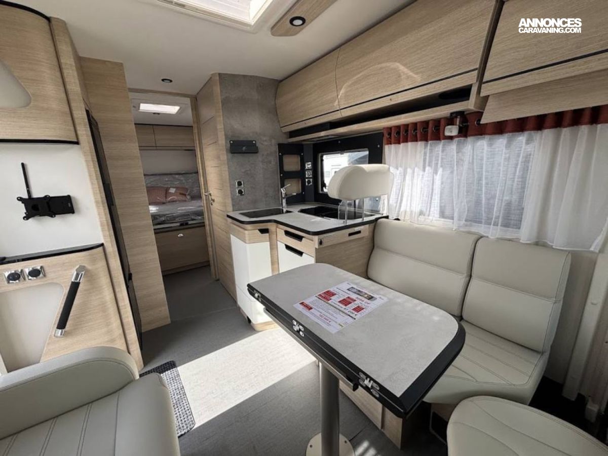 Cuisine en L, Douche indépendante, Lit central, lit pavillon, Salon avant banquettes face à face, Salon avant sièges pivotants, Soute réglable en hauteur, WC Cassette.
