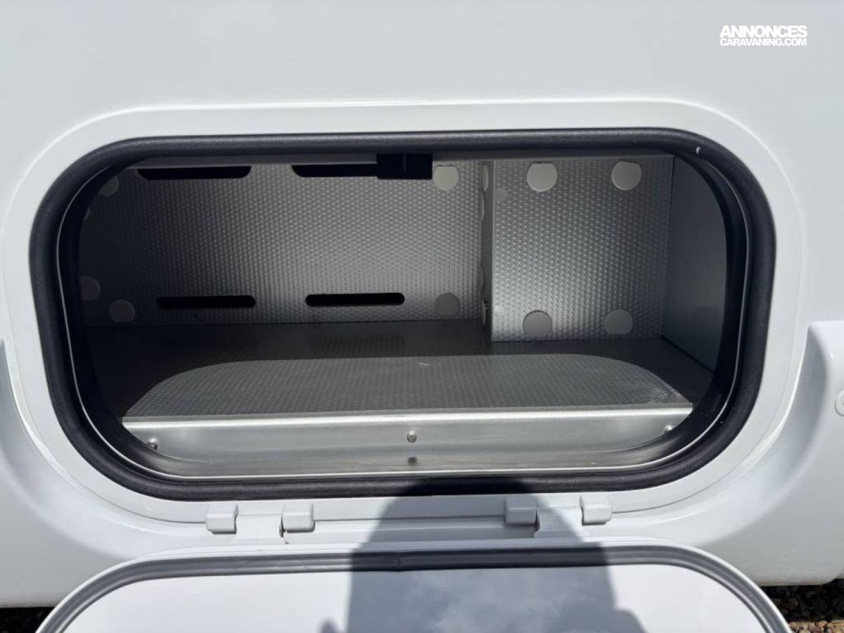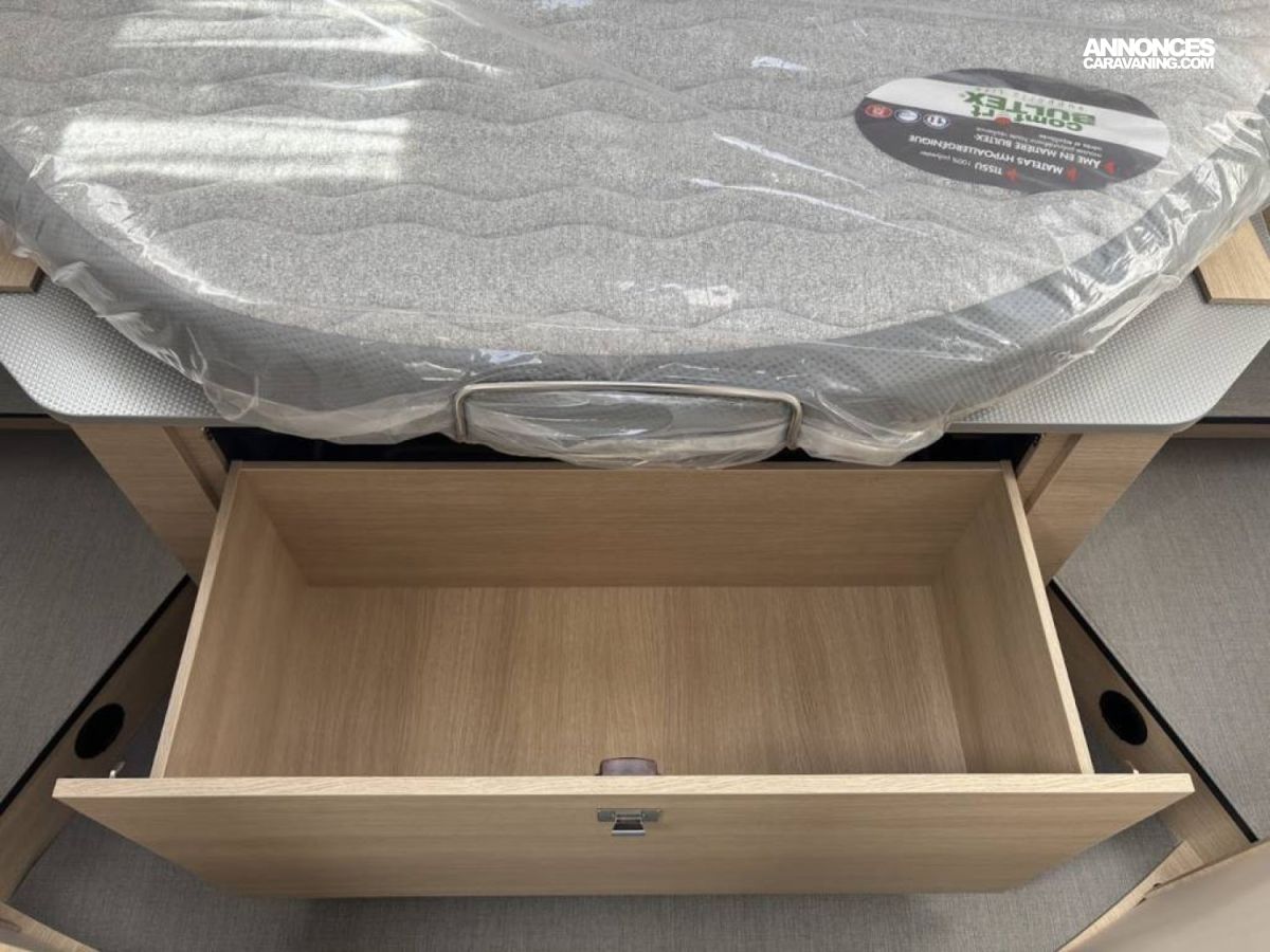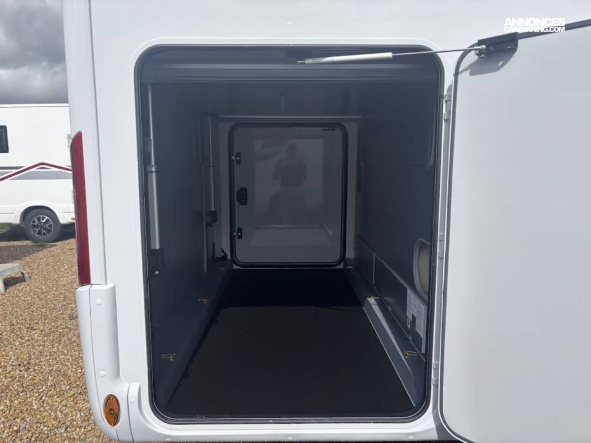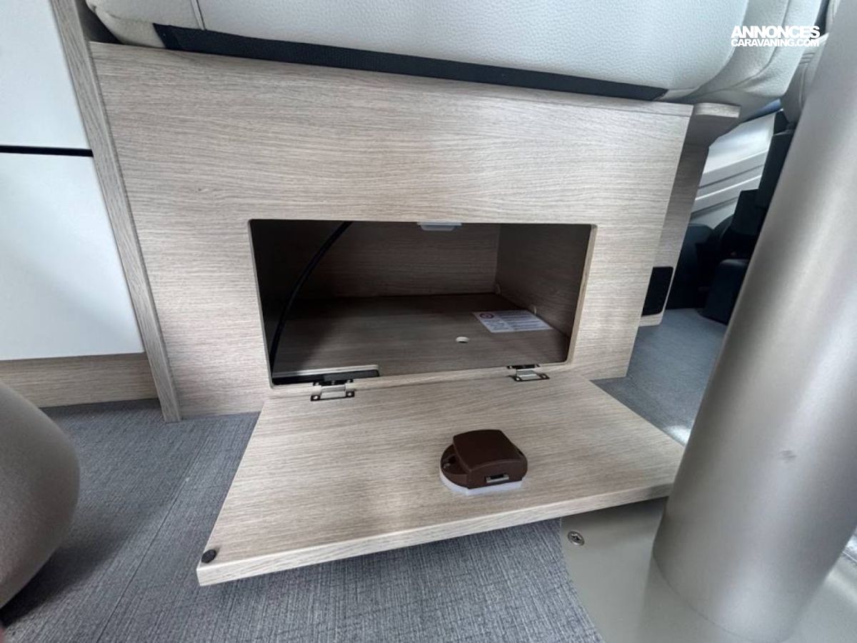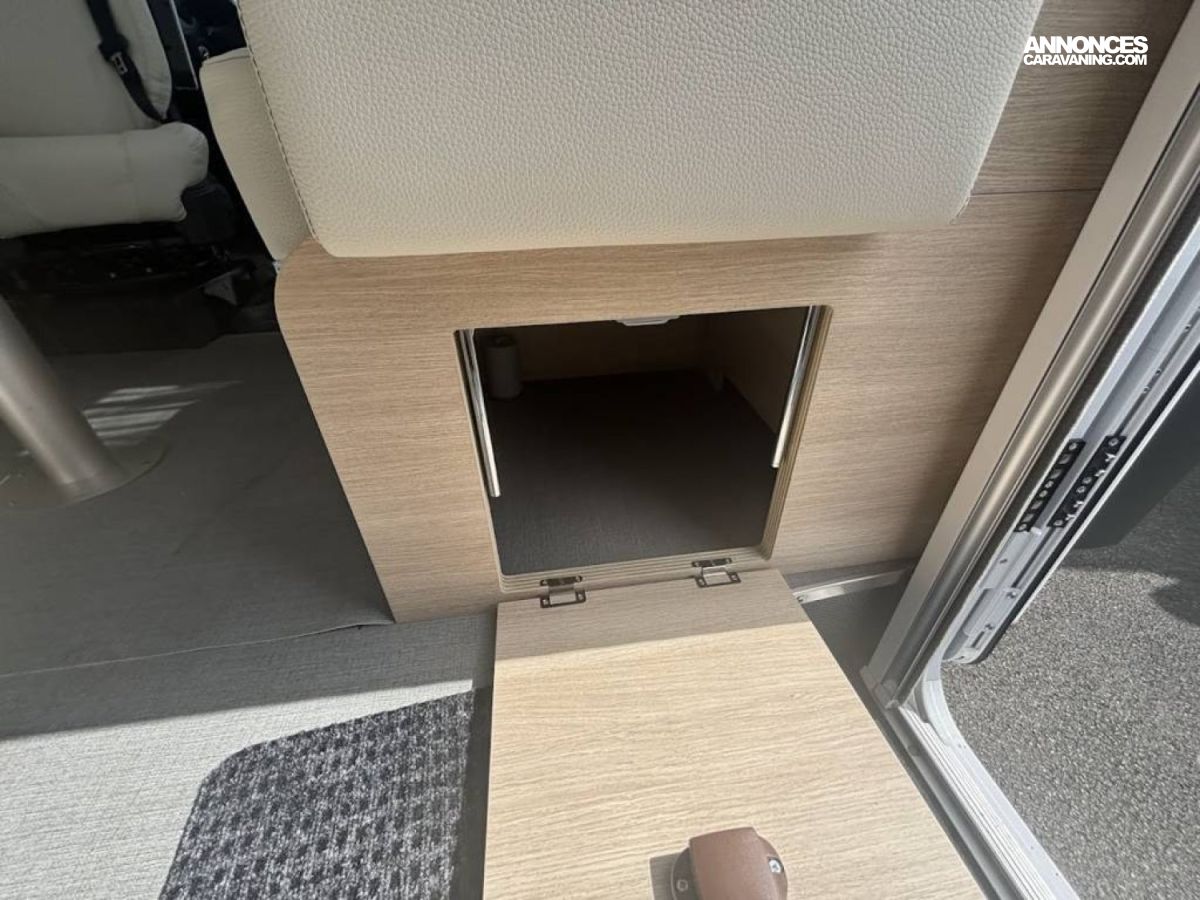 Cuisine en L, Douche indépendante, Lit central, lit pavillon, Salon avant banquettes face à face, Salon avant sièges pivotants, Soute réglable en hauteur, WC Cassette.