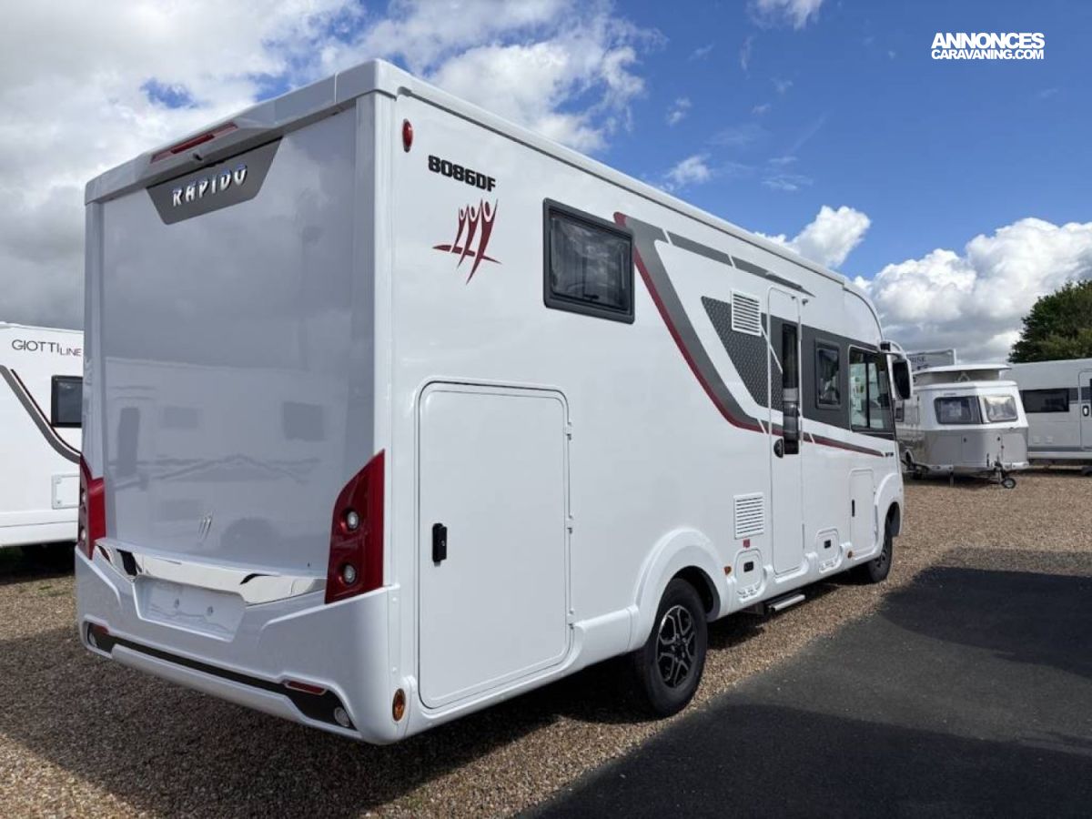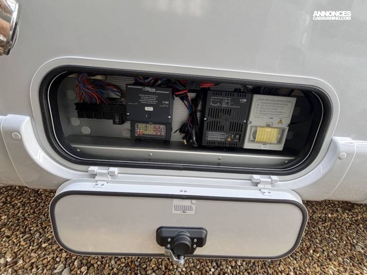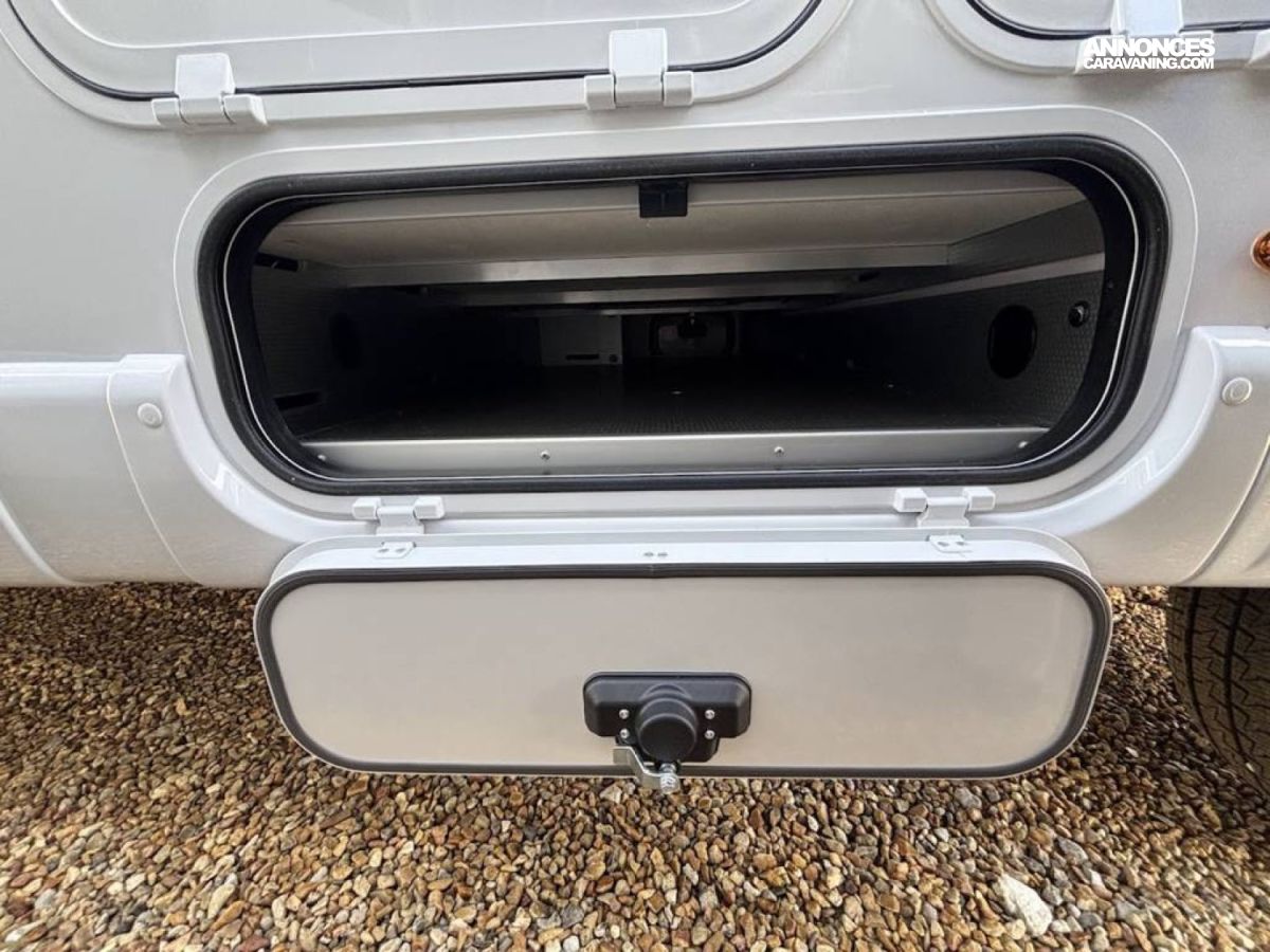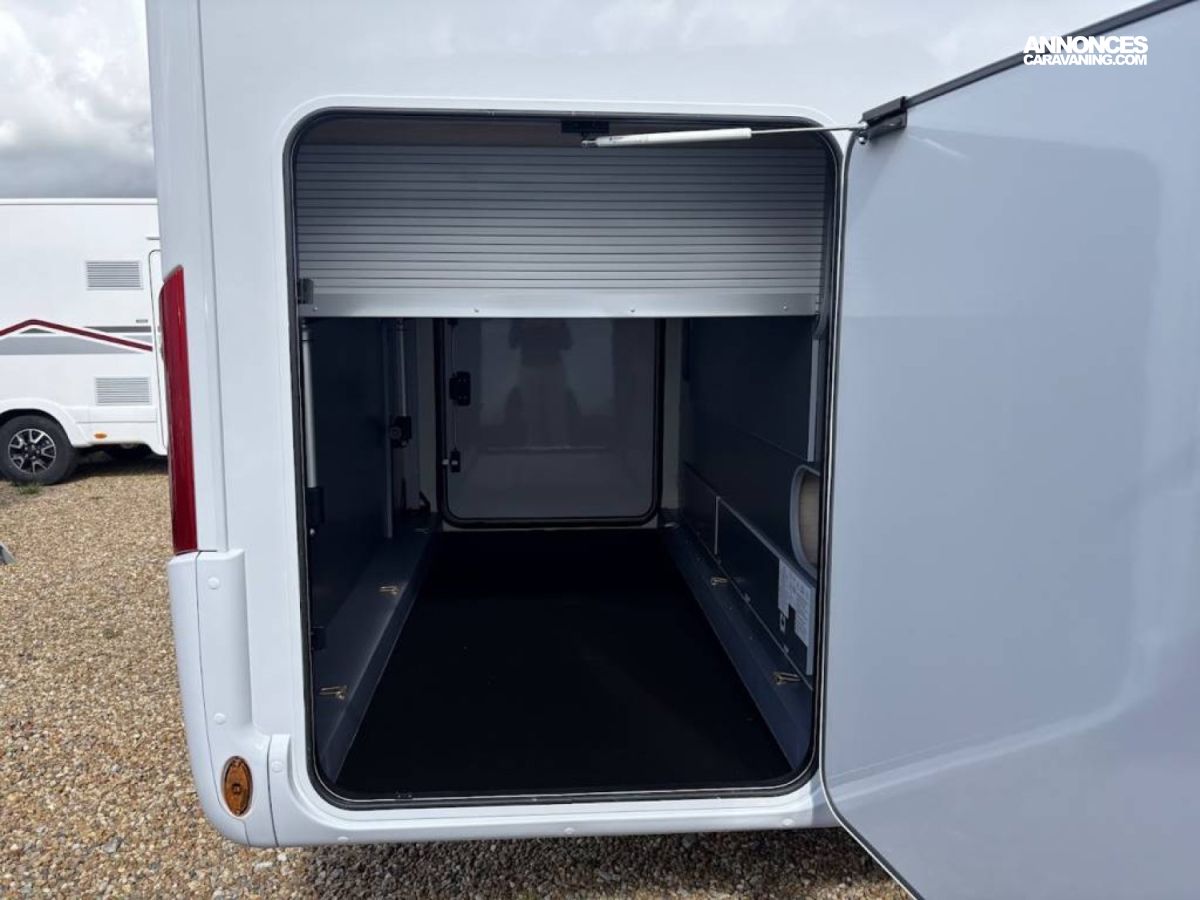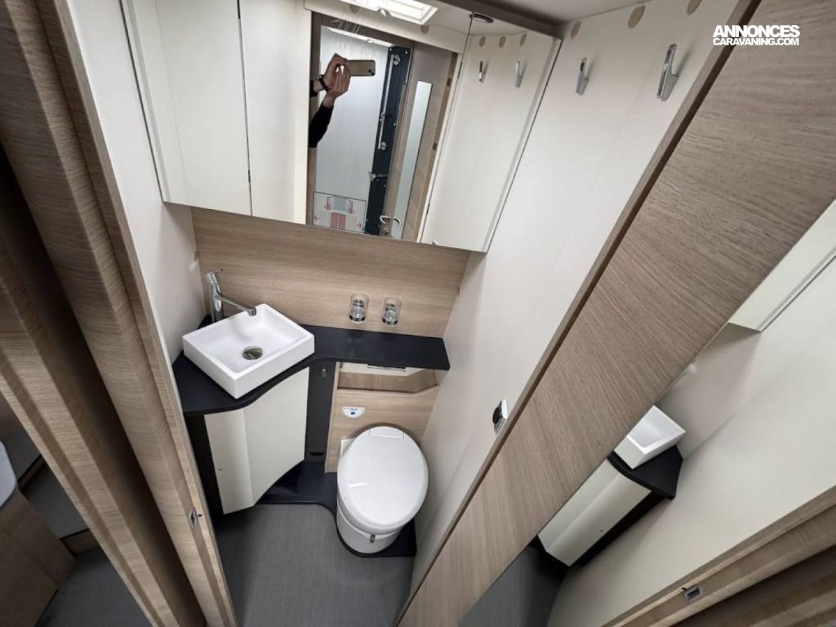 Cuisine en L, Douche indépendante, Lit central, lit pavillon, Salon avant banquettes face à face, Salon avant sièges pivotants, Soute réglable en hauteur, WC Cassette.