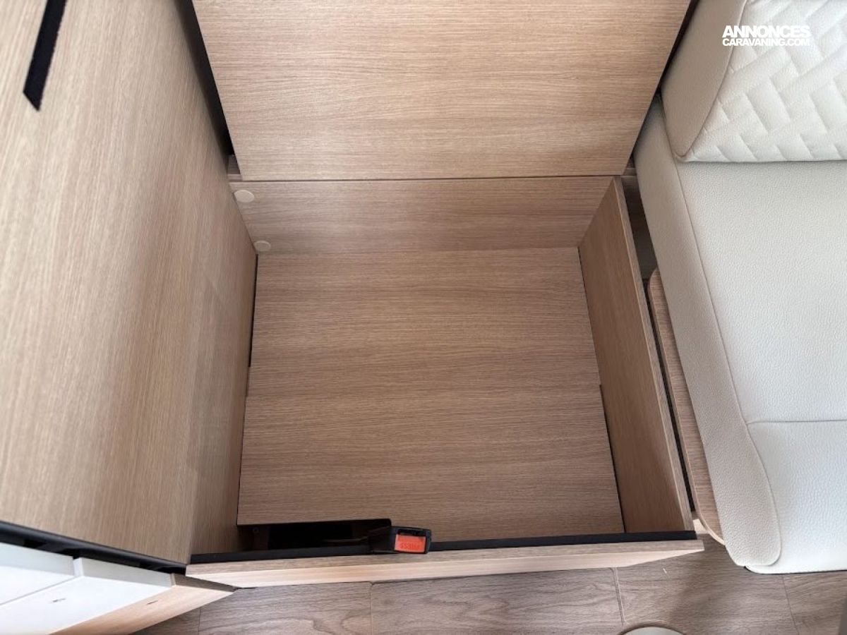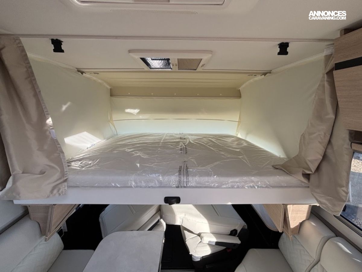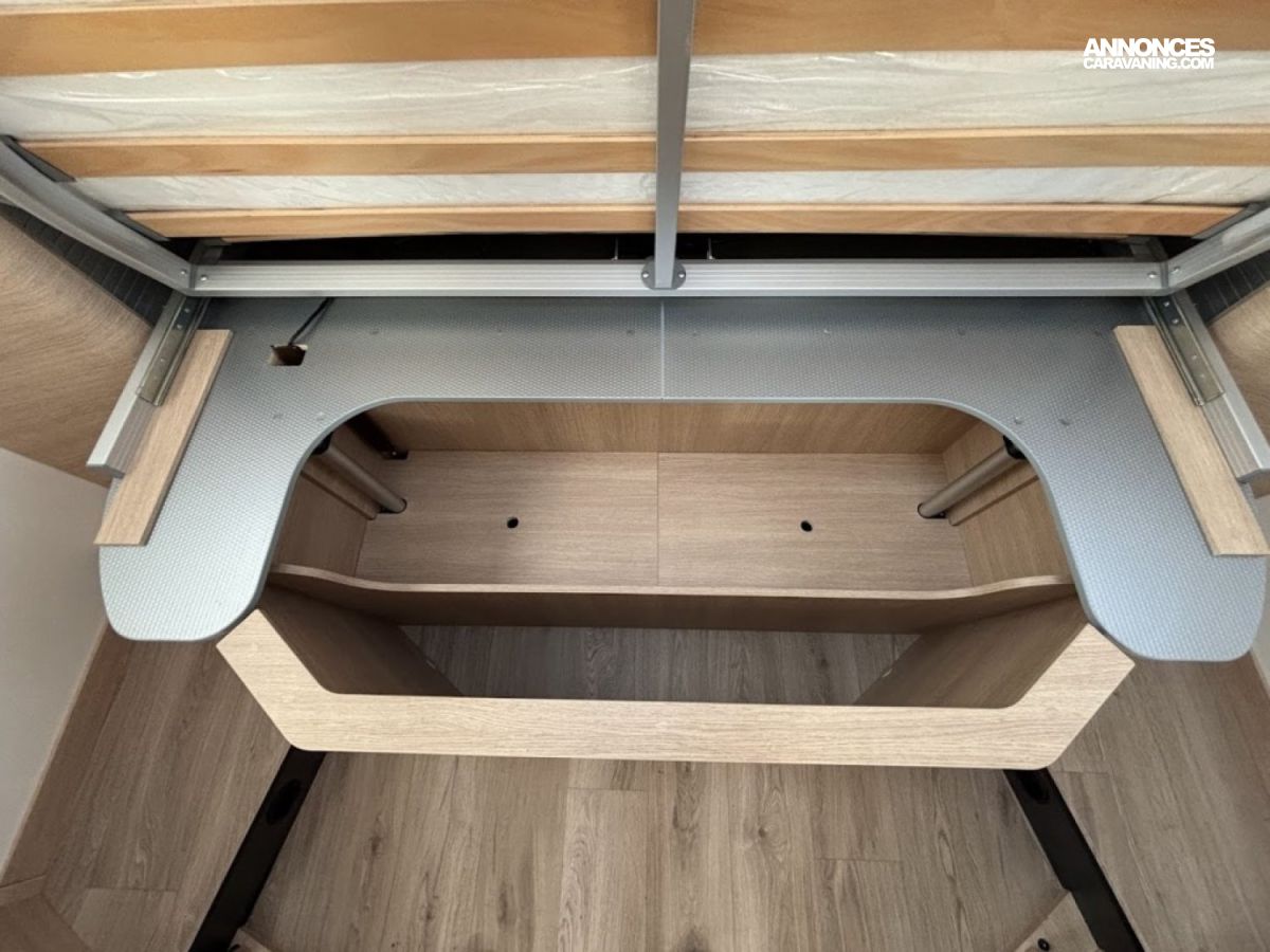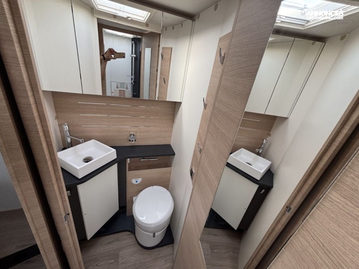 Bac de douche, Cuisine en L, Douche indépendante, Lit central, lit pavillon cabine, Salon avant banquettes face à face, Salon avant sièges pivotants, Soute réglable en hauteur, WC Cassette.
