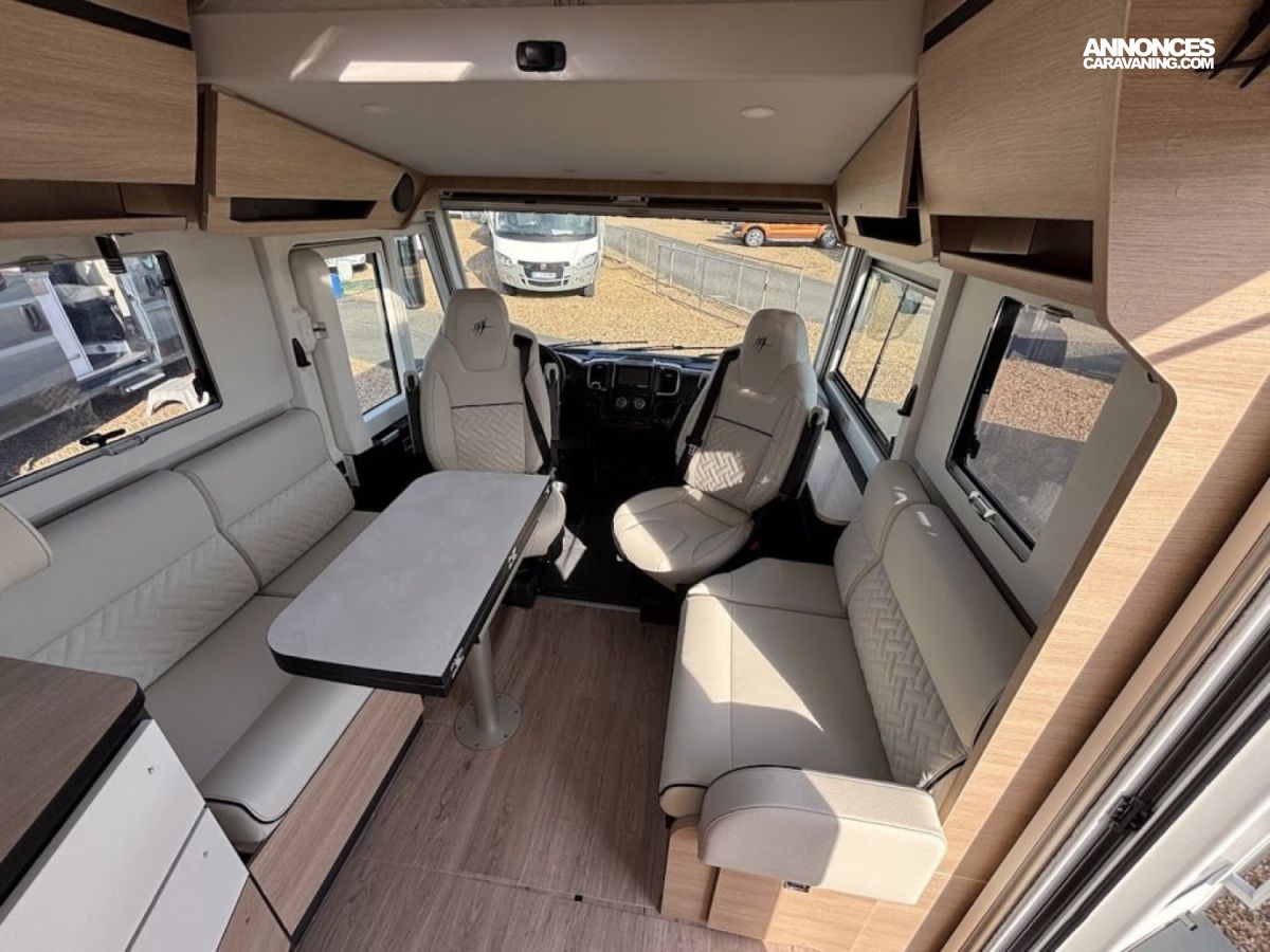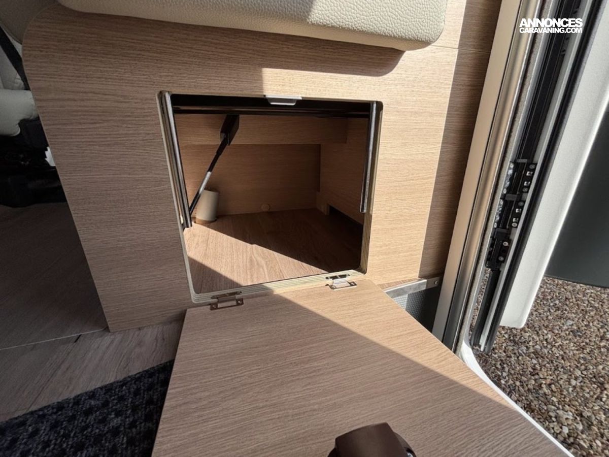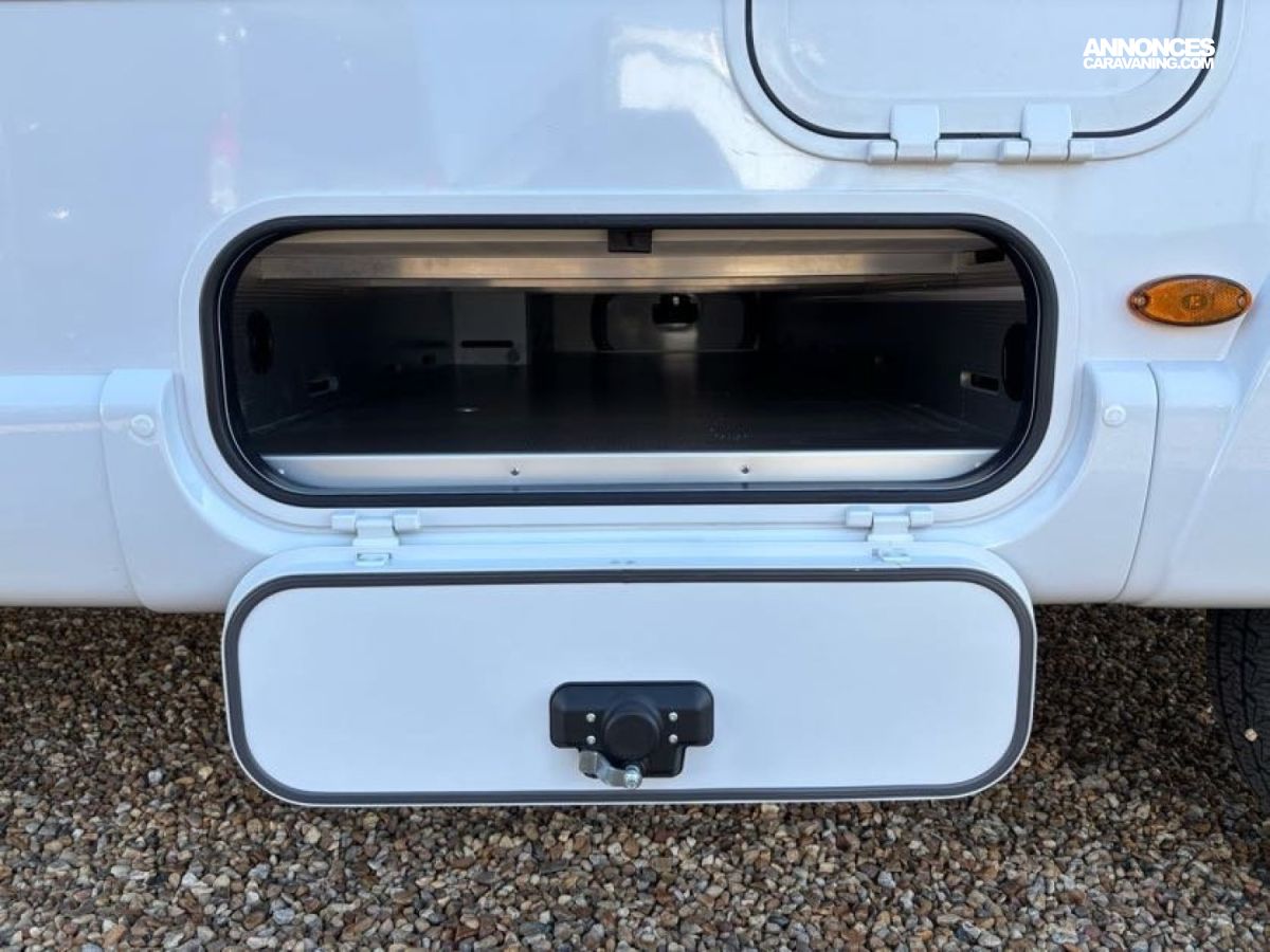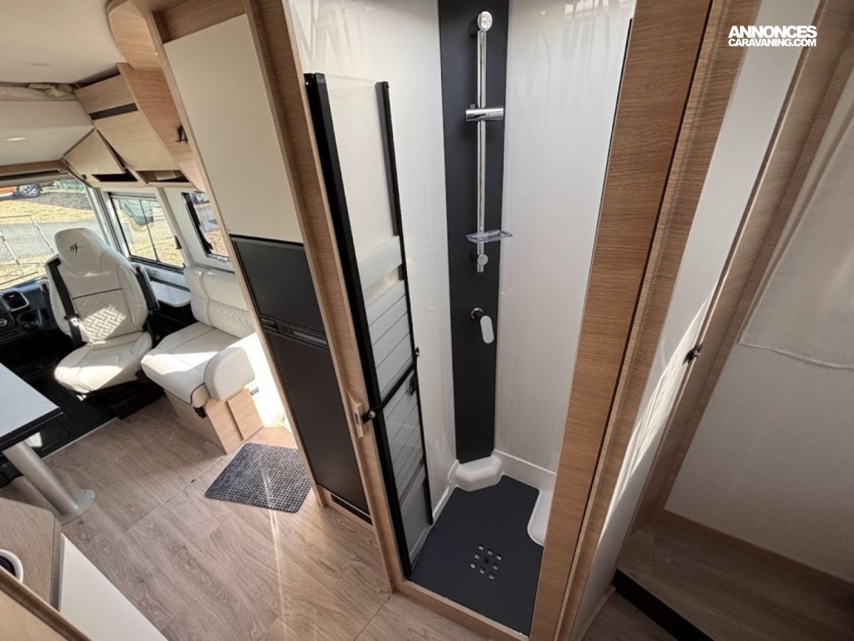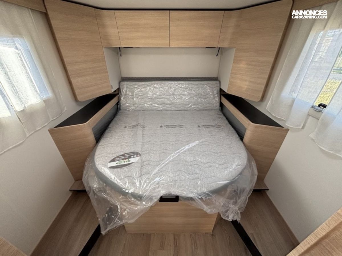 Bac de douche, Cuisine en L, Douche indépendante, Lit central, lit pavillon cabine, Salon avant banquettes face à face, Salon avant sièges pivotants, Soute réglable en hauteur, WC Cassette.