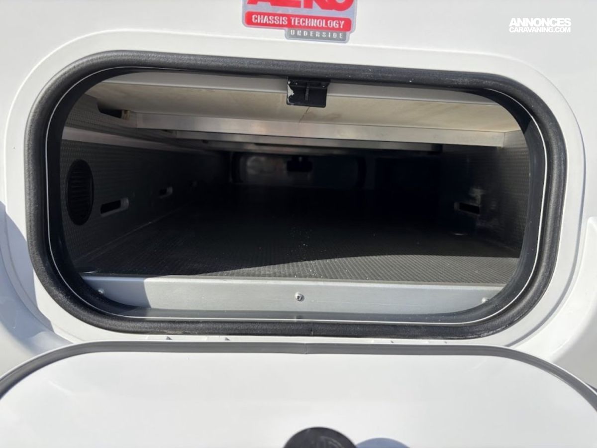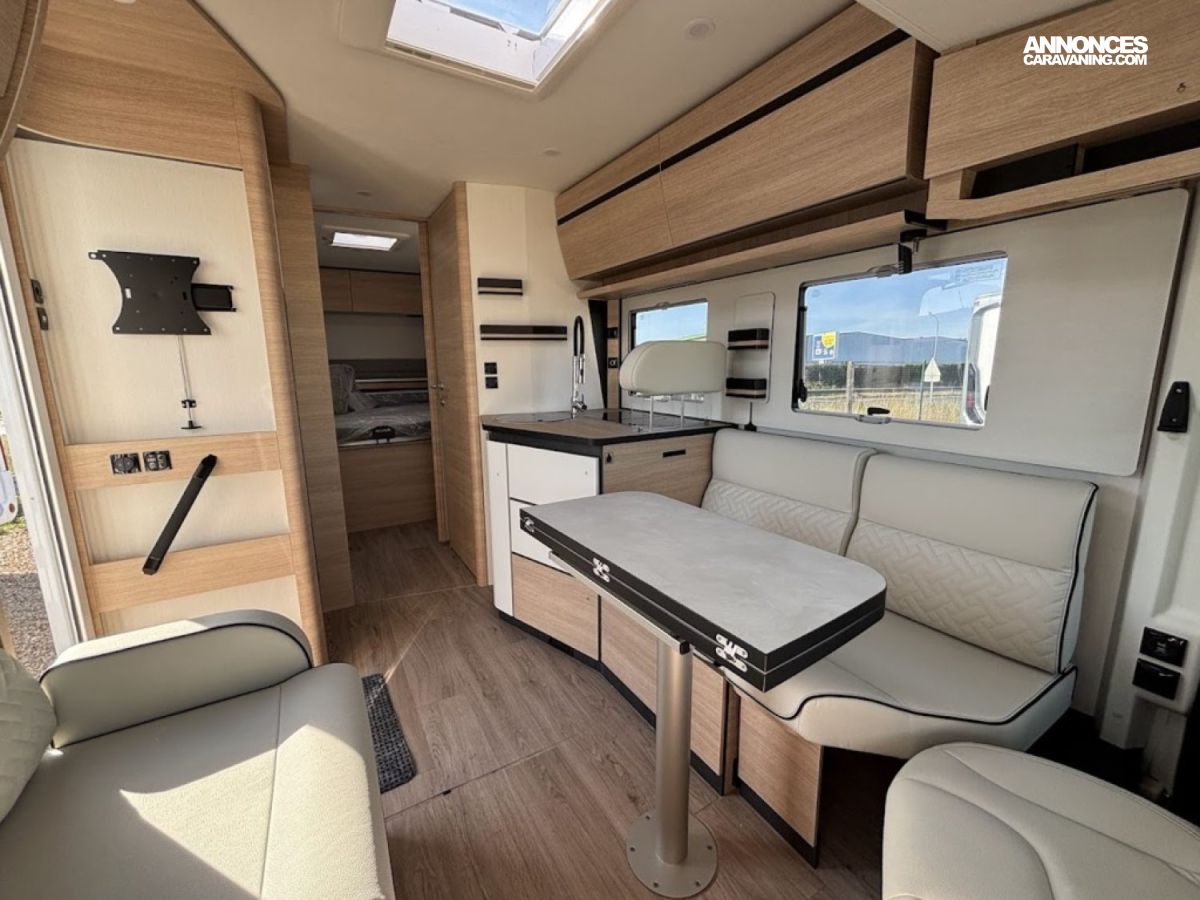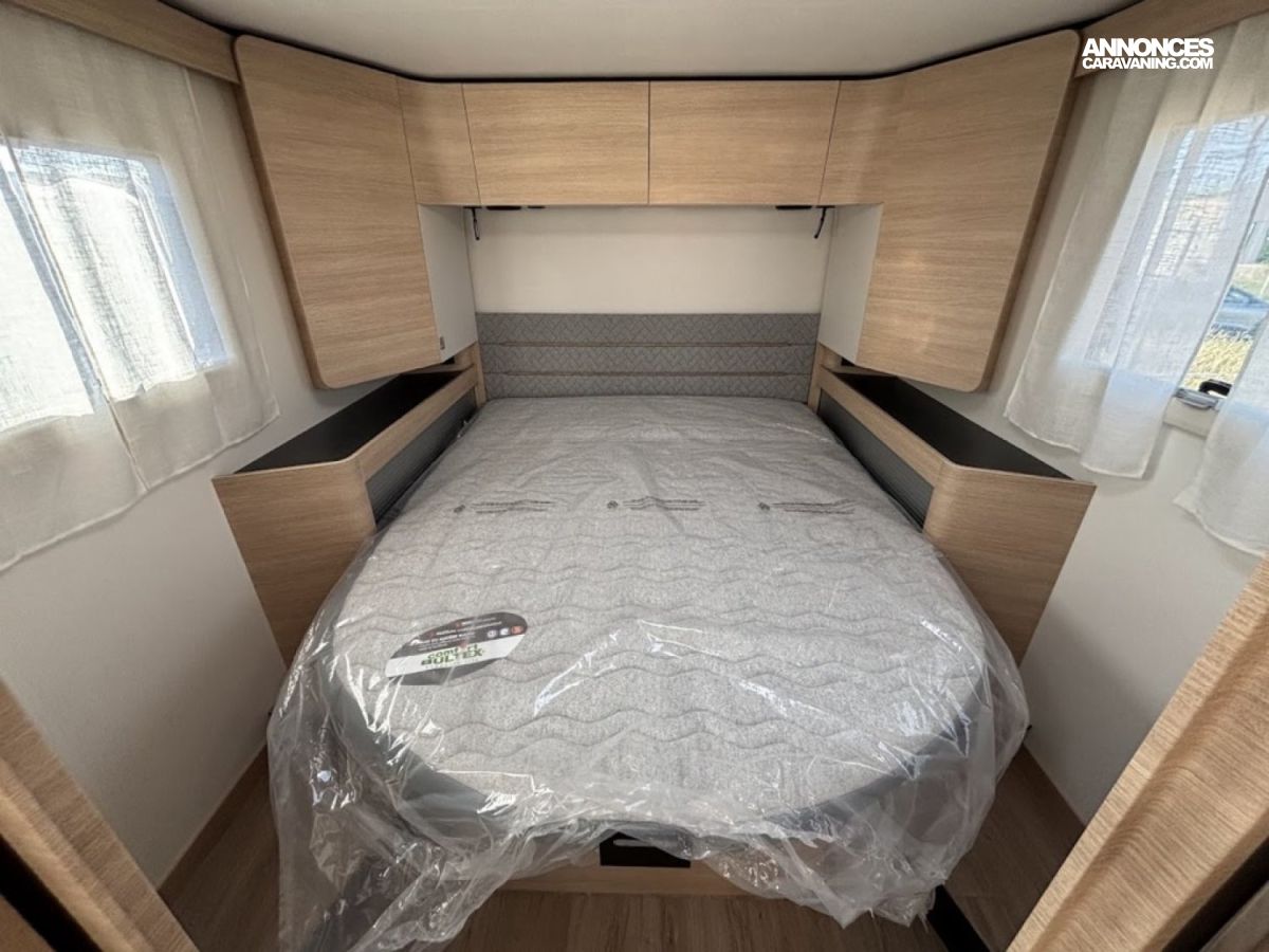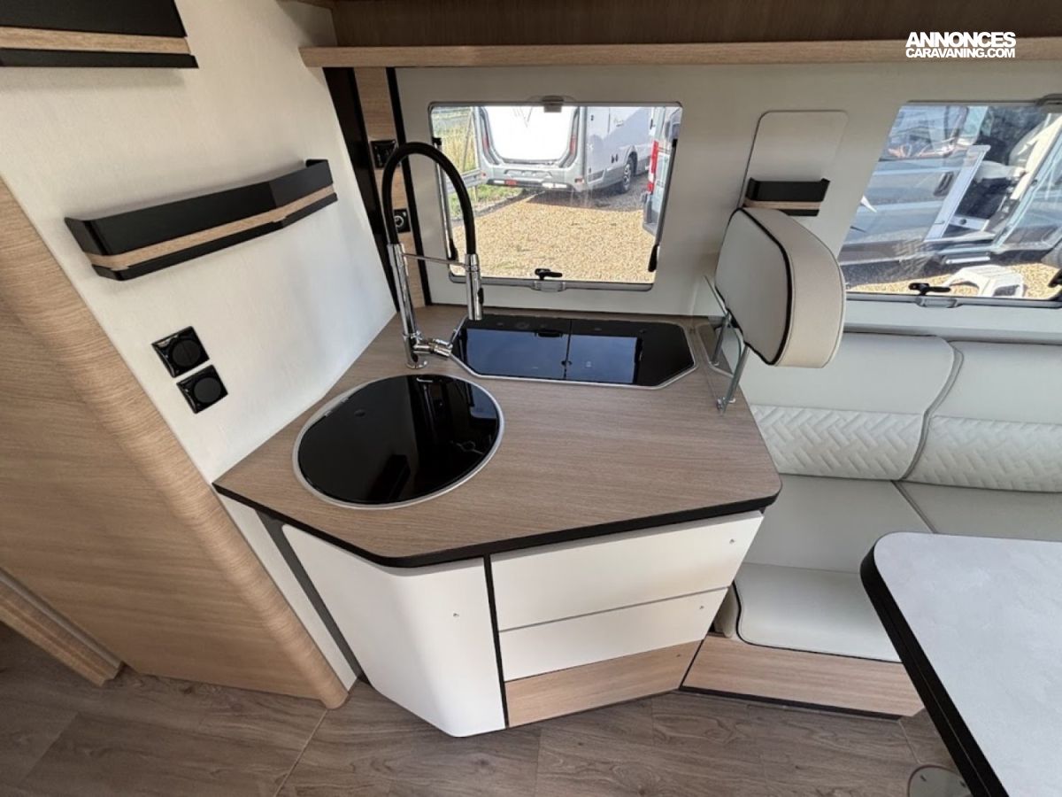 Bac de douche, Cuisine en L, Douche indépendante, Lit central, lit pavillon cabine, Salon avant banquettes face à face, Salon avant sièges pivotants, Soute réglable en hauteur, WC Cassette.