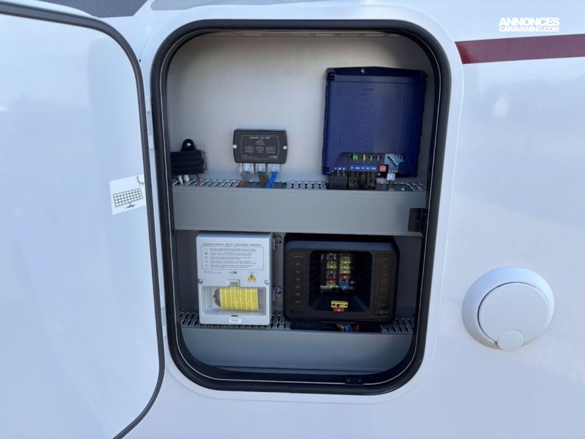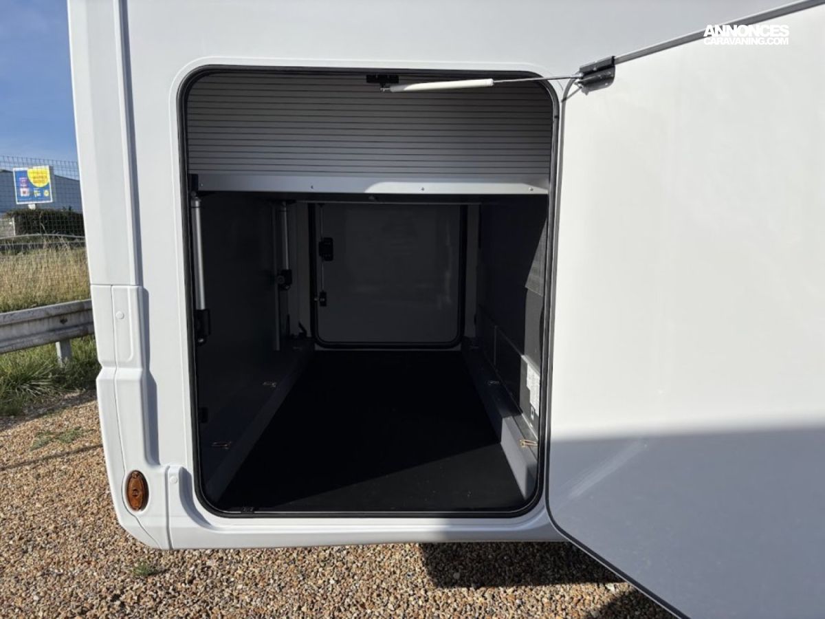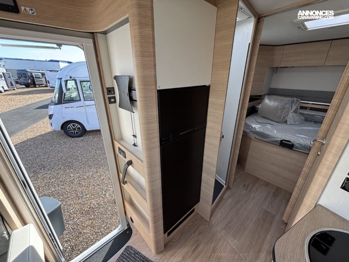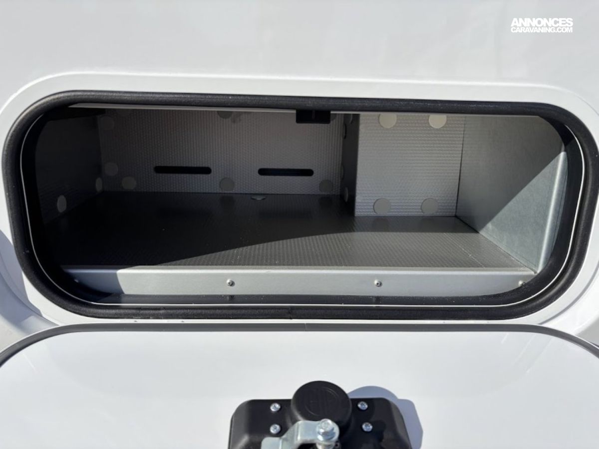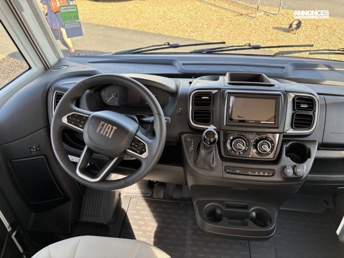 Bac de douche, Cuisine en L, Douche indépendante, Lit central, lit pavillon cabine, Salon avant banquettes face à face, Salon avant sièges pivotants, Soute réglable en hauteur, WC Cassette.