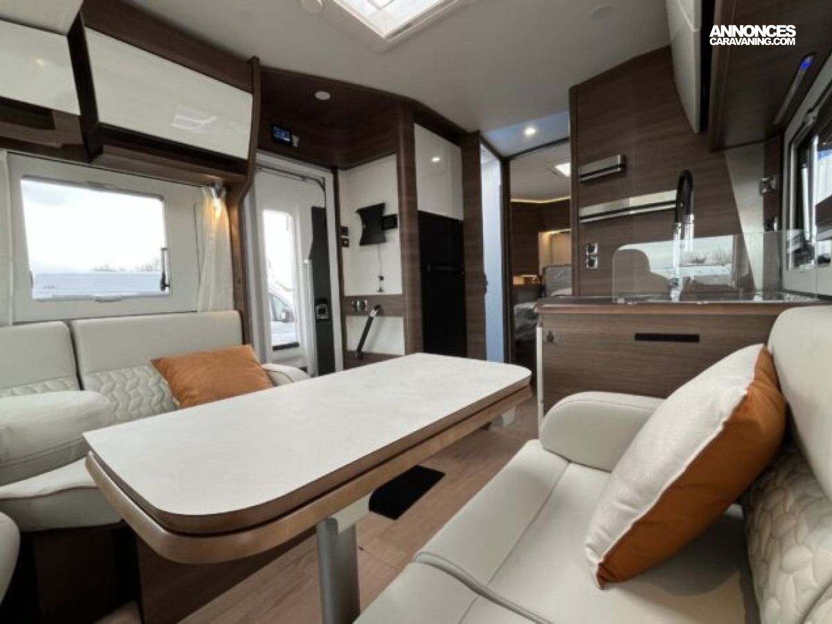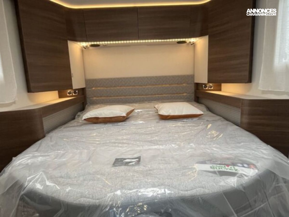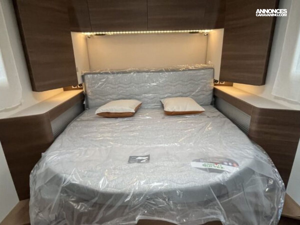 Son lit central, sa grande dinette face-à-face et son double plancher offrent un espace de vie spacieux et parfaitement isolé.