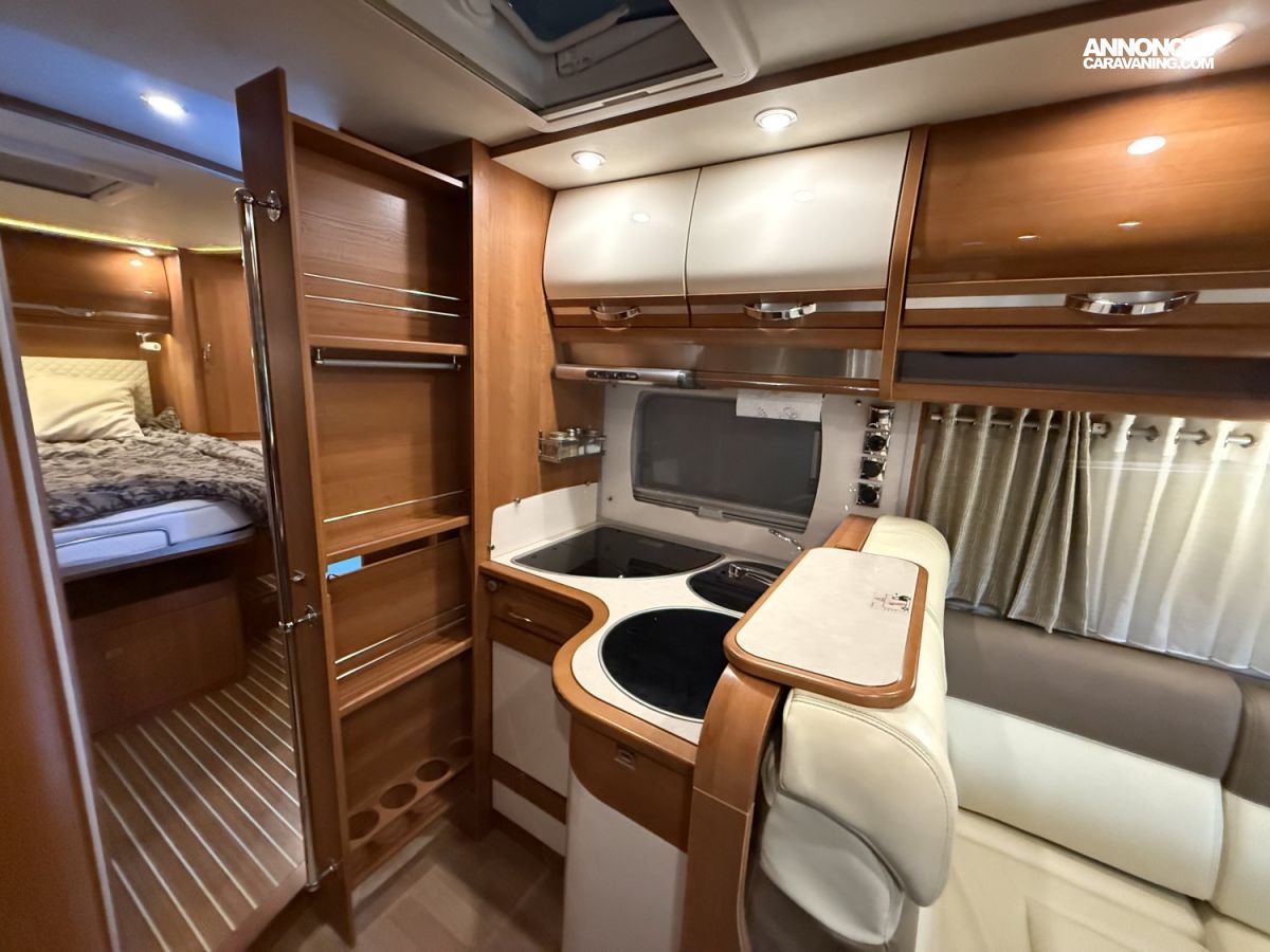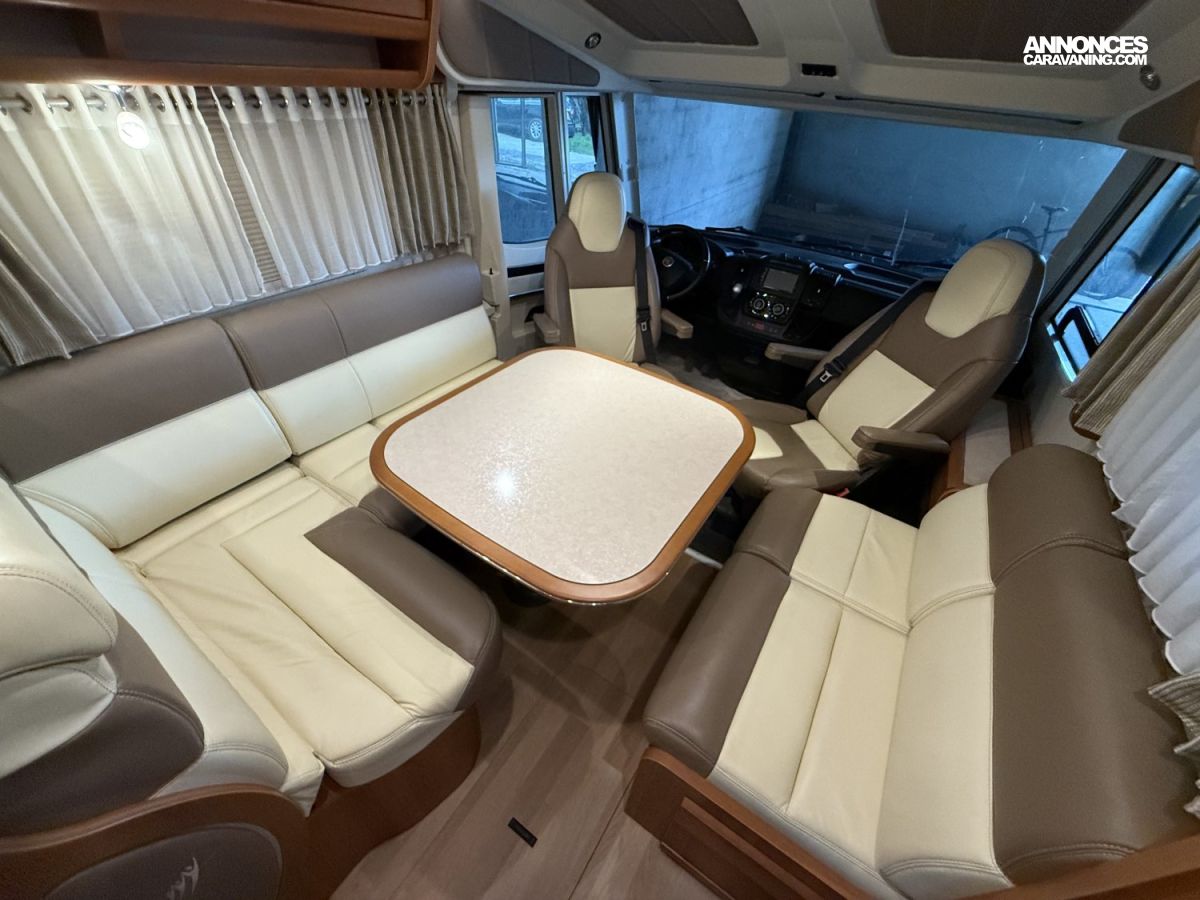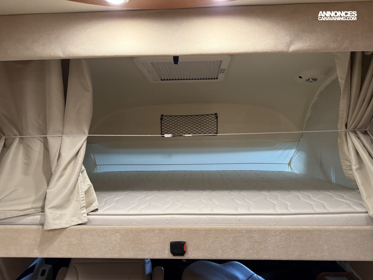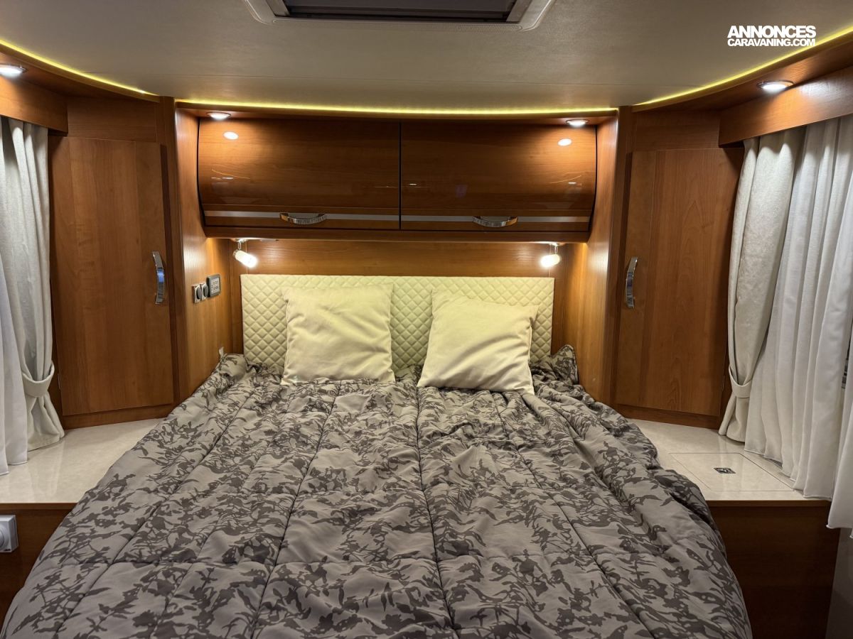 L’intérieur profite de la finition DESIGN EDITION, avec un mobilier ELEGANCE brillant intégrant des moulures en bois d’érable massif, apportant chaleur, noblesse et luminosité à l’ambiance. La configuration inclut un grand salon convivial, une cuisine bien équipée, un lit central réglable en hauteur sur soute garage, et un lit de pavillon avant, permettant de voyager à deux avec un vrai confort ou en famille selon les besoins.