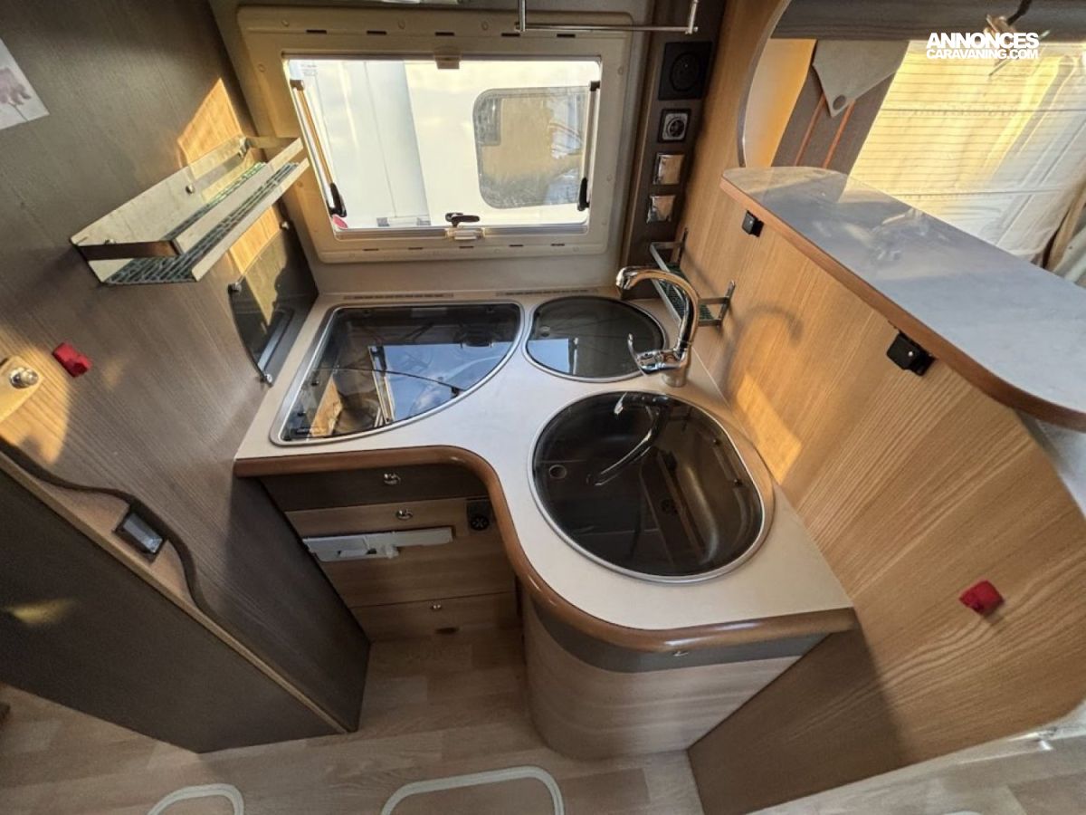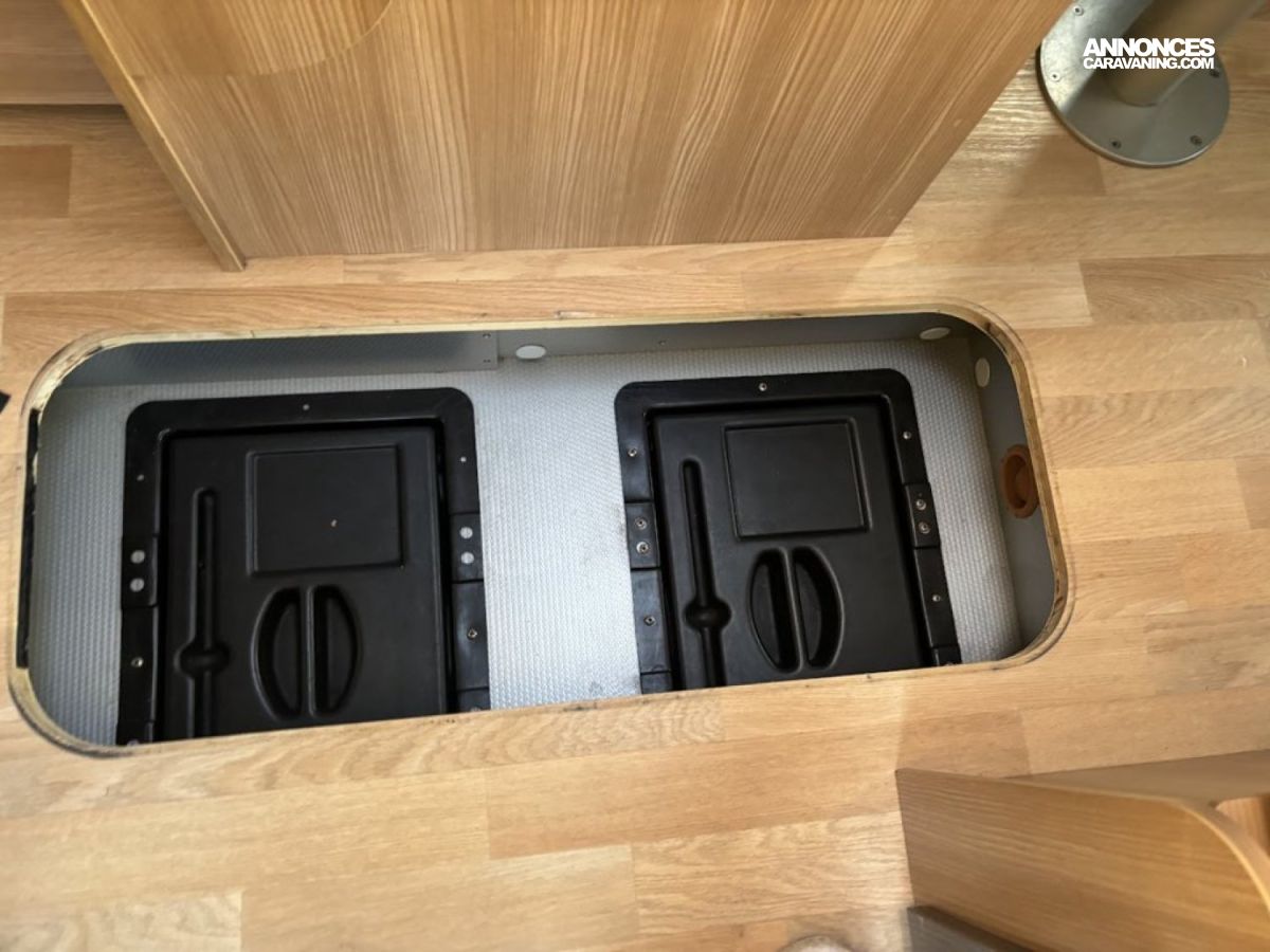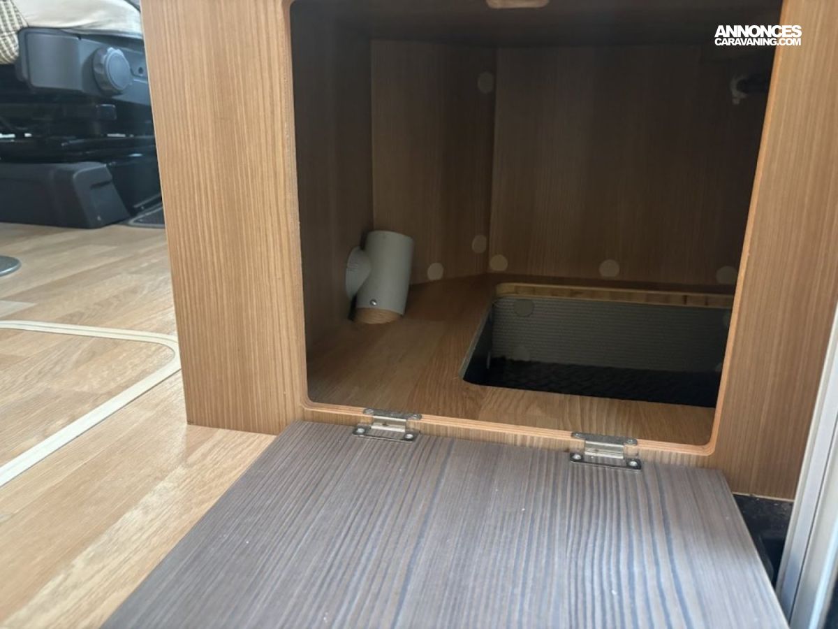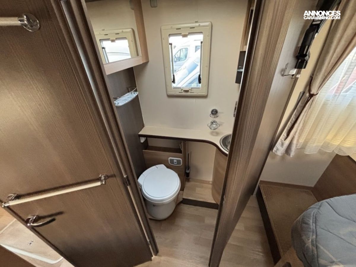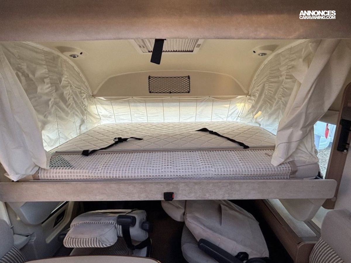 Cuisine en L, Douche indépendante, Lit central, lit pavillon cabine, Salon avant sièges pivotants, Salon en L, WC Cassette.