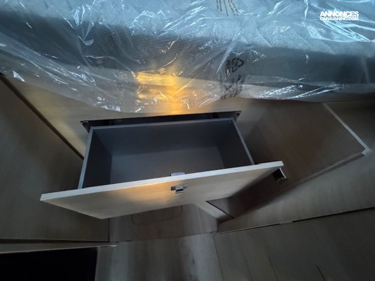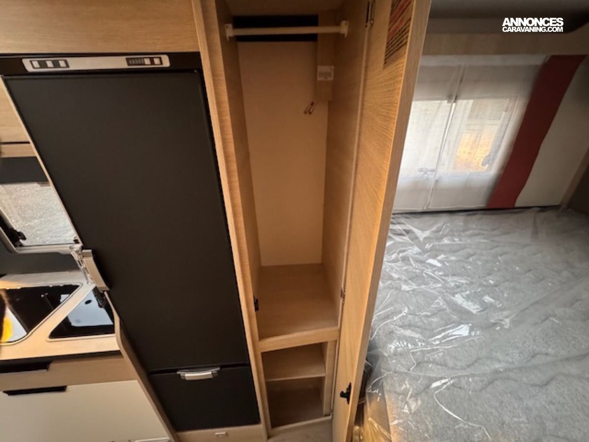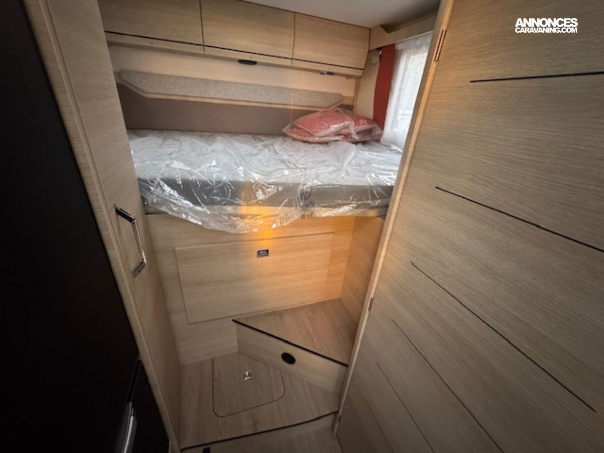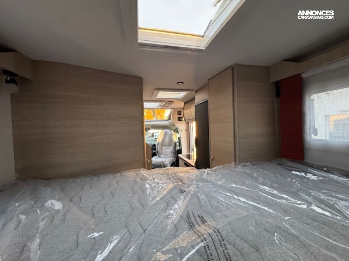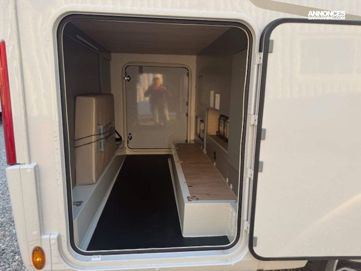 Ce C03 offre un surcroît de confort et d espace par rapport aux modèles plus courts. Il héberge à l arrière un lit transversal avec un matelas Bultex de très bonnes dimensions : 202 cm de long pour 149 cm de large aux épaules et 130 cm en pied.. Il est positionné sur une grande soute de 120 cm de haut. Il reste facilement accessible grâce à des marches fixes, qui cachent elles-mêmes des rangements.