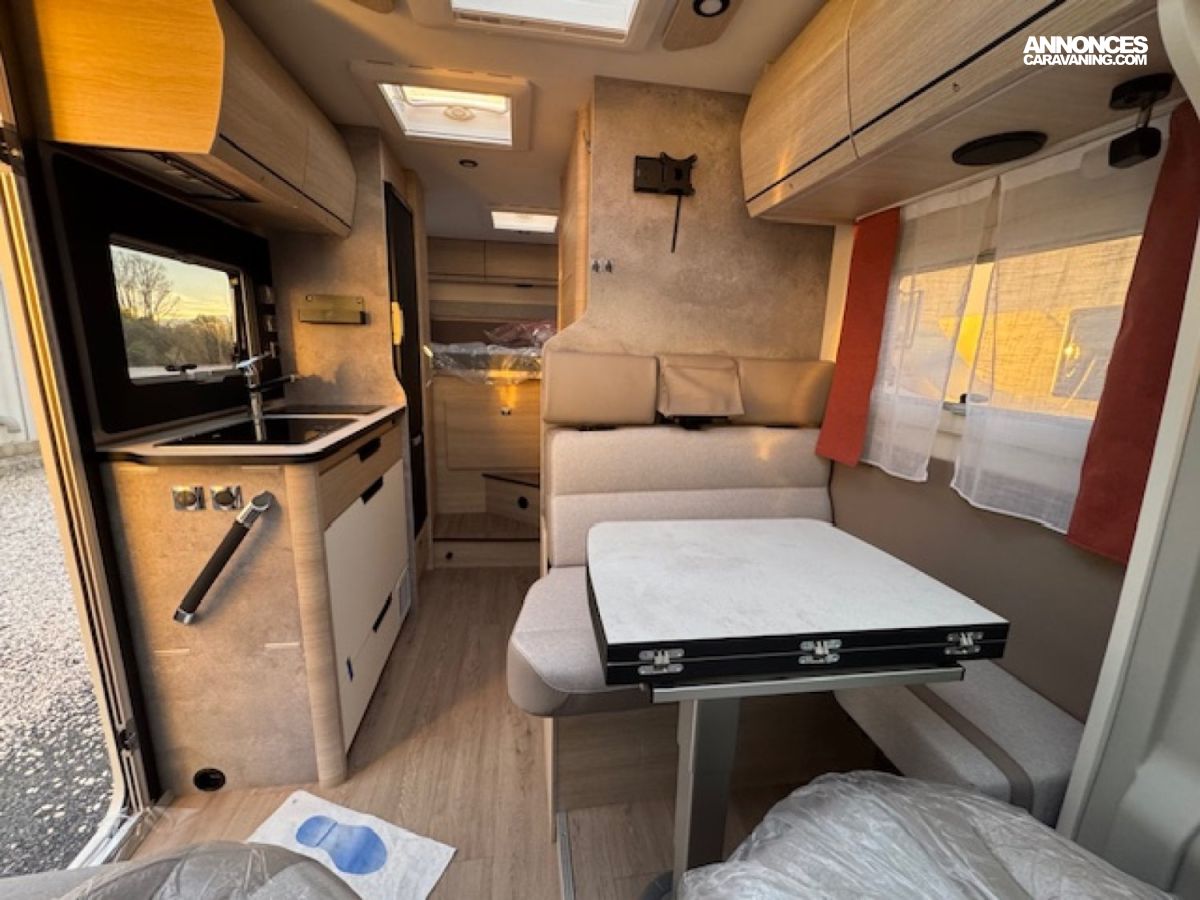 Conçu idéalement pour un usage à deux, le Rapido C03 compte 4 places route et 3 couchages ; le lit de dînette étant fourni sans supplément (188 x 90 / 68 cm)
