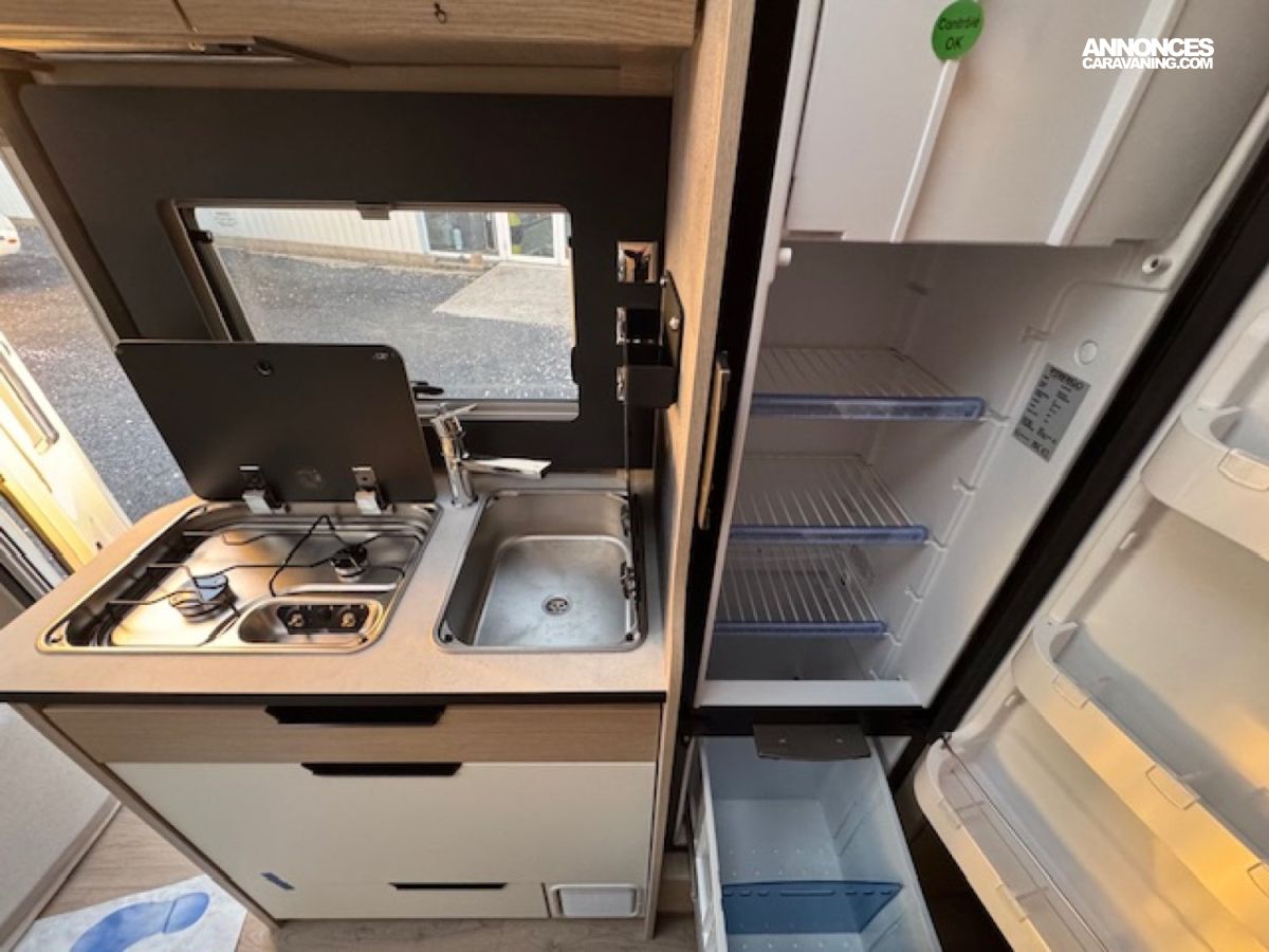 A gauche de l entrée, le bloc cuisine offre de très larges tiroirs (dont certains compartimentés), une tablette rabattable, un grand évier rectangulaire et deux feux de cuisson design sans oublier sa hotte aspirante. Accolé à la cuisine, on retrouve un grand et étroit réfrigérateur 140L, intégrant un tiroir à bouteilles en partie basse.